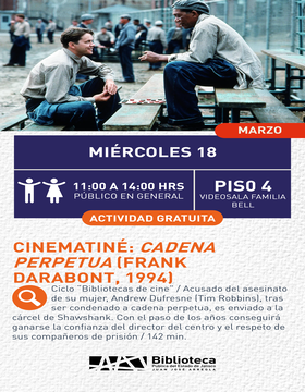 Ciclo “Bibliotecas de cine” / Acusado del asesinato de su mujer, Andrew Dufresne (Tim Robbins), tras ser condenado a cadena perpetua, es enviado a la cárcel de Shawshank. Con el paso de los años conseguirá ganarse la confianza del director del centro y el respeto de sus compañeros de prisión / 142 min.