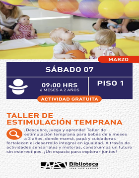 ¡Descubre, juega y aprende! Taller de estimulación temprana para bebés de 6 meses a 2 años. A través de actividades sensoriales y motoras, fortaleceremos su desarrollo en compañía de mamá y papá ¡Un espacio para explorar juntos!