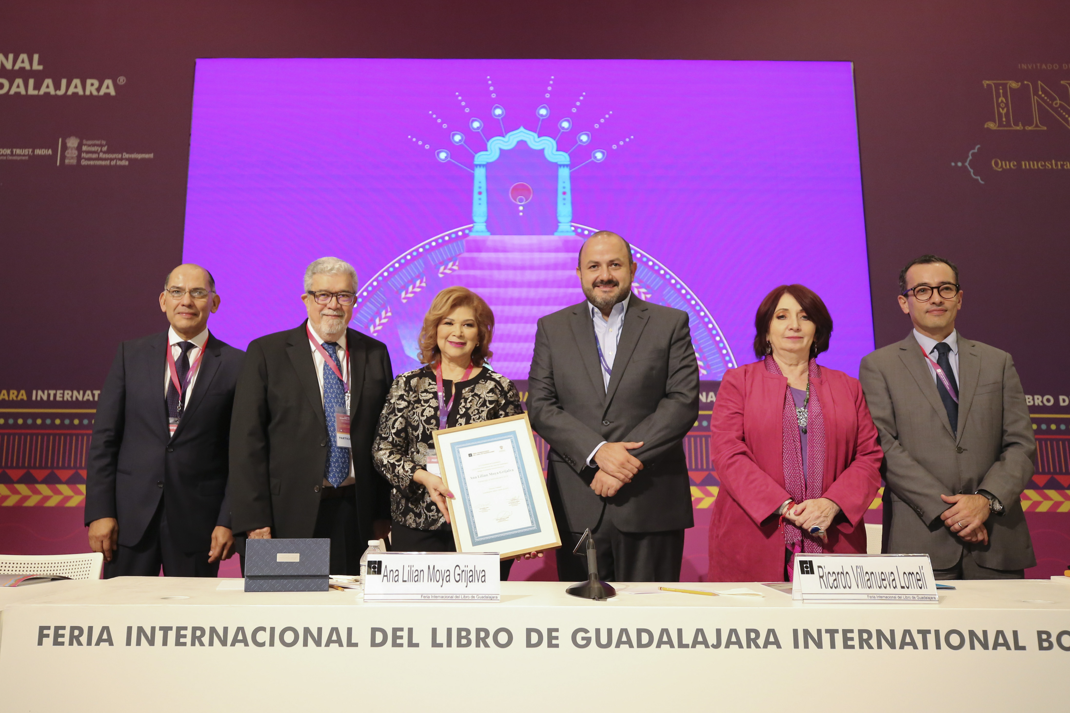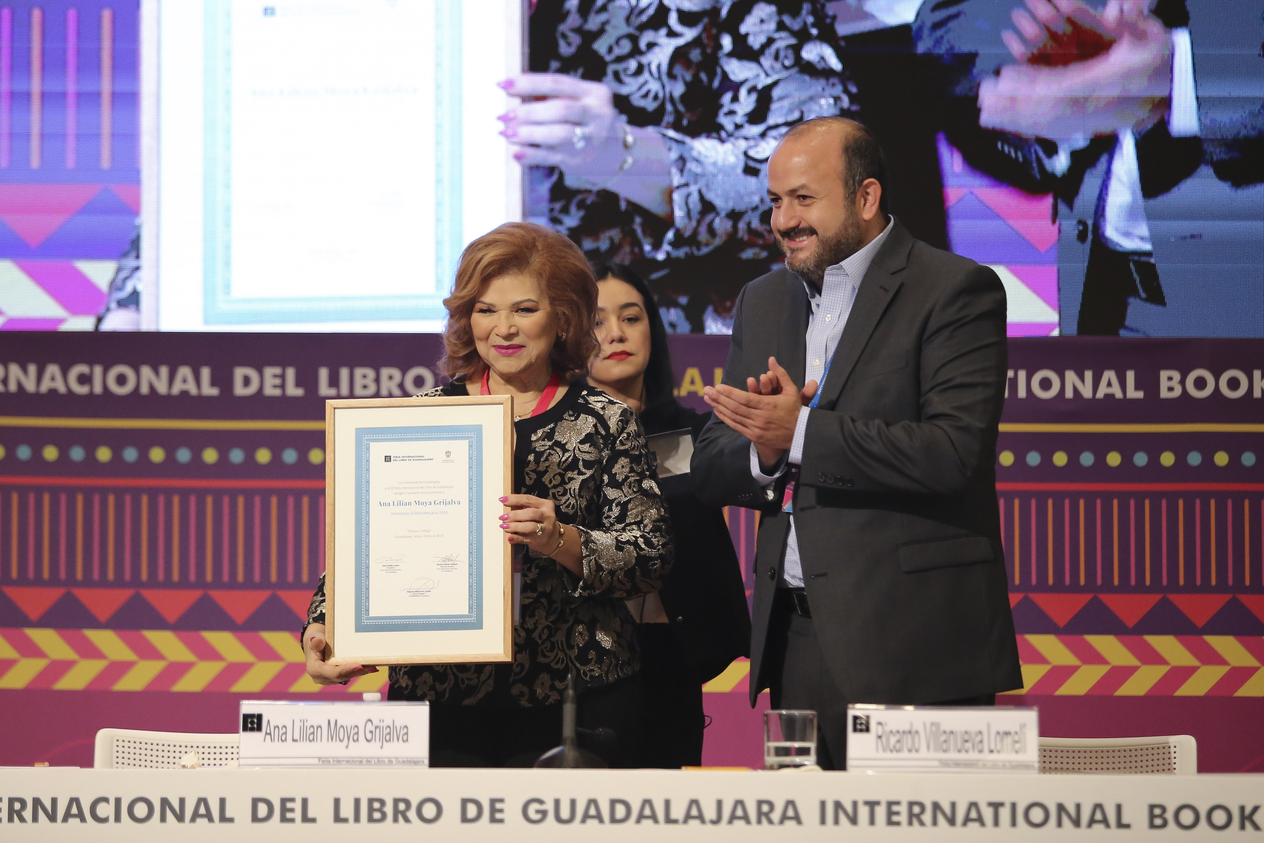 Este miércoles, la bibliófila maestra Ana Lilia Moya Grijalva recibió el Homenaje al Bibliotecario con la presencia del Rector General de la Universidad de Guadalajara (UdeG), doctor Ricardo Villanueva Lomelí, el cual es otorgado a quienes han dedicado su vida a los libros y al desarrollo de la bibliotecología, en el marco de la Feria Internacional del Libro de Guadalajara (FIL) 2019, que este año tiene como país invitado a la India.