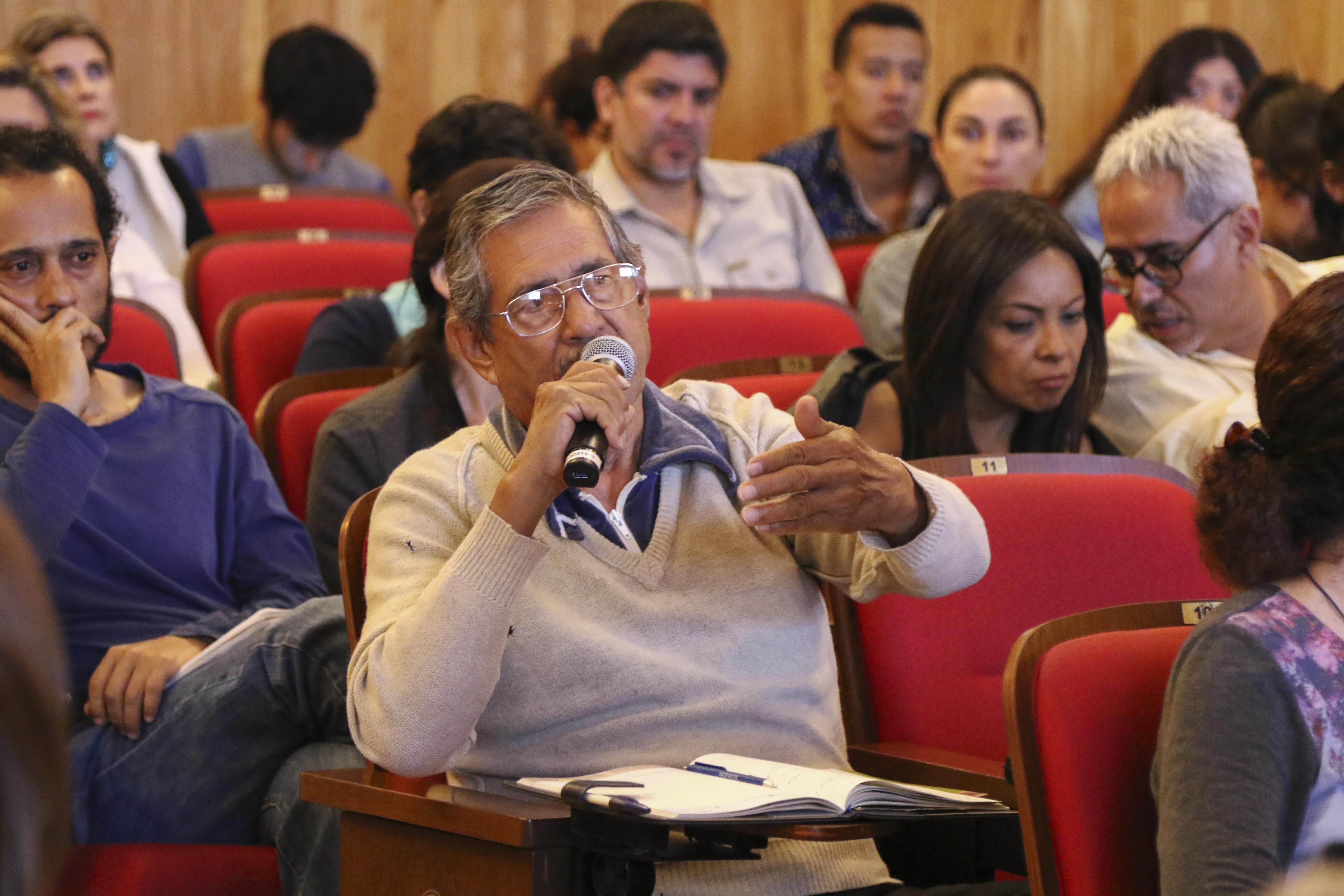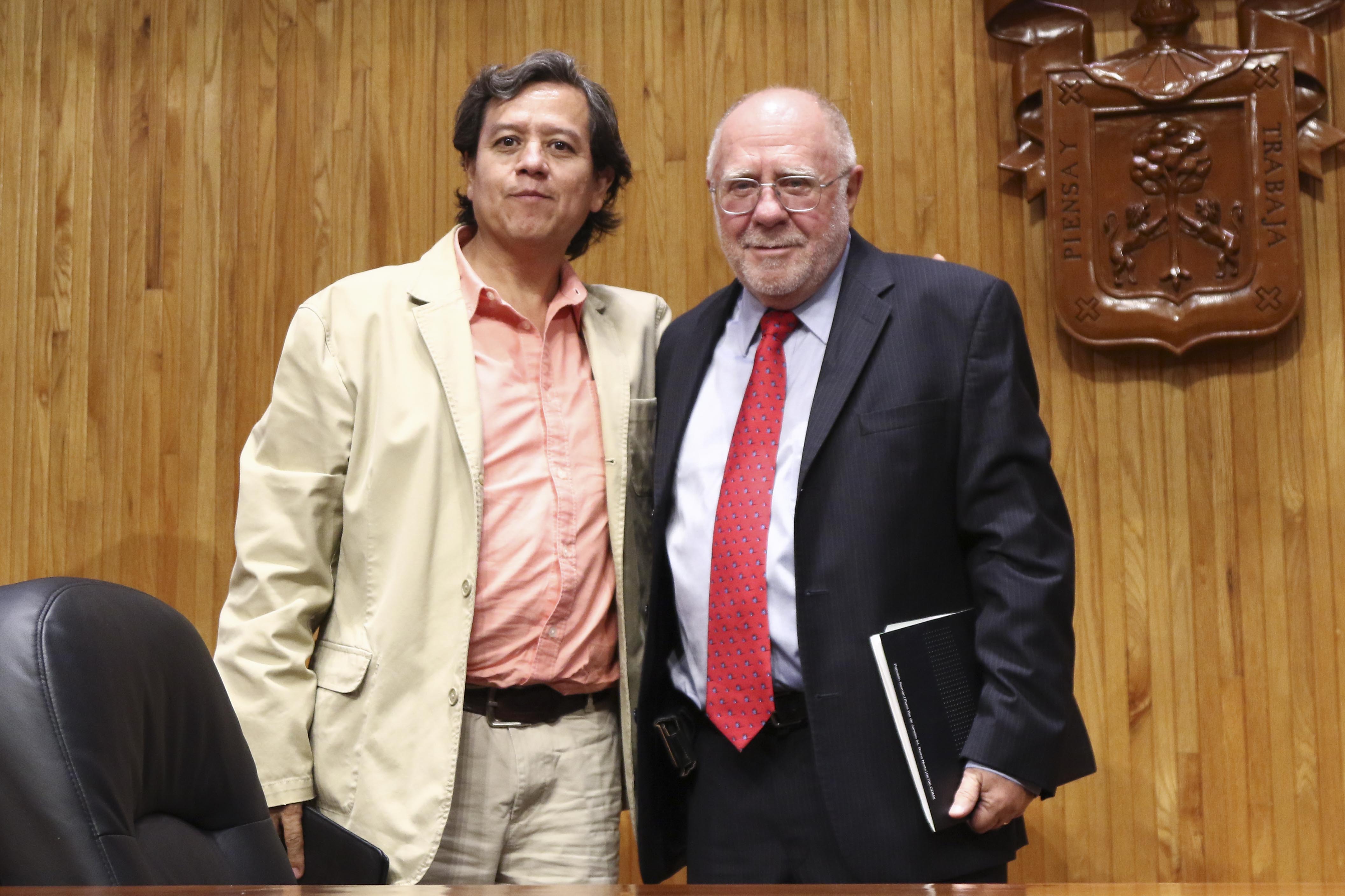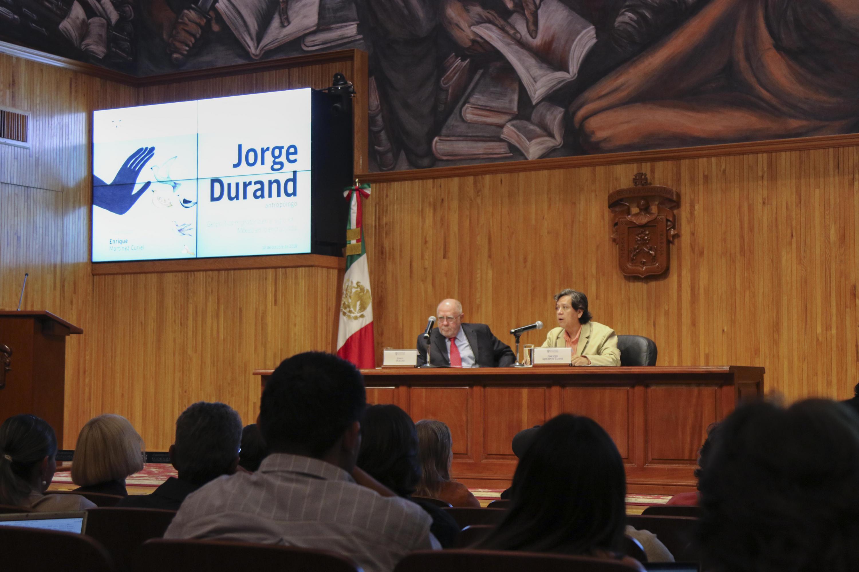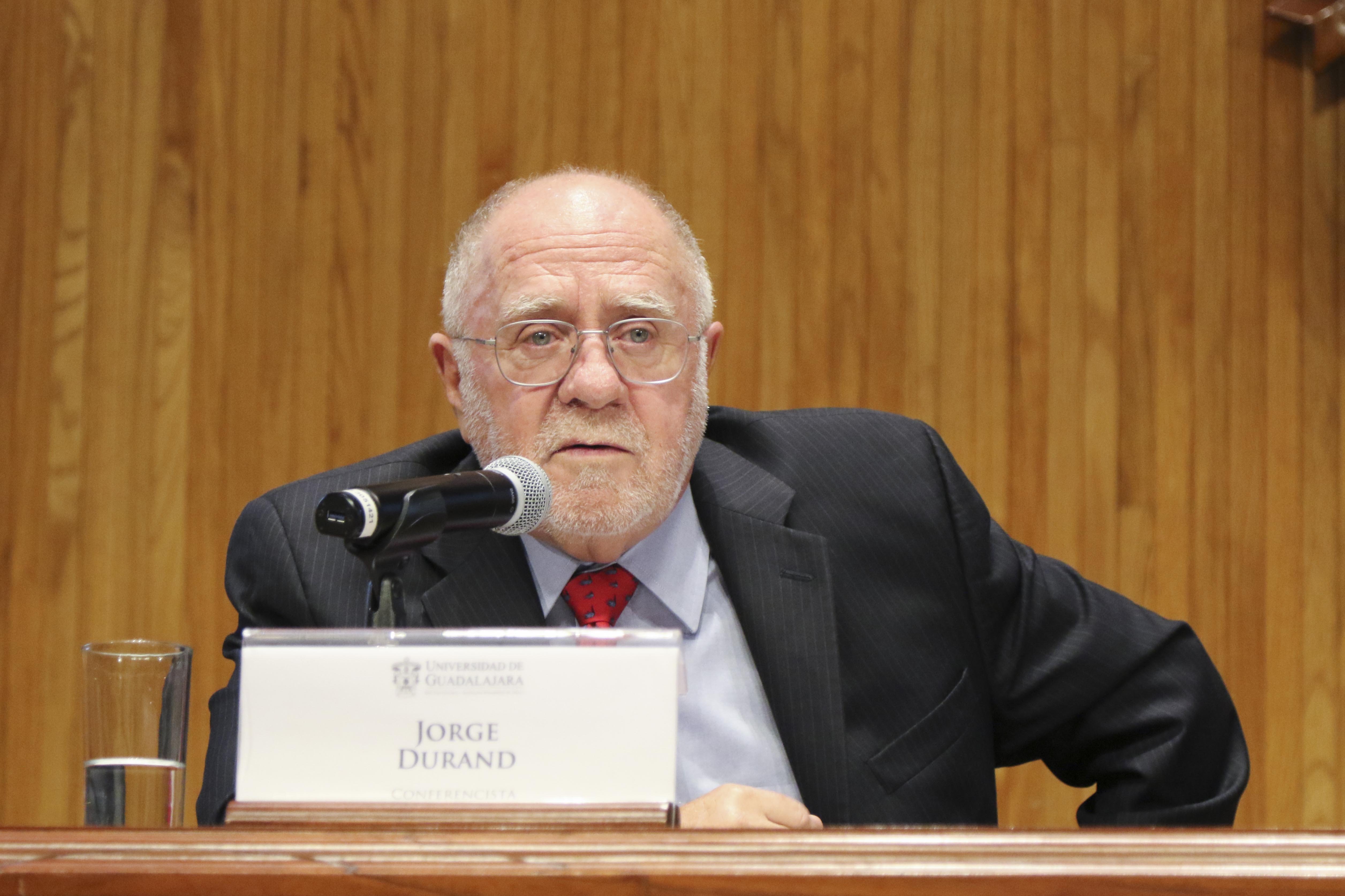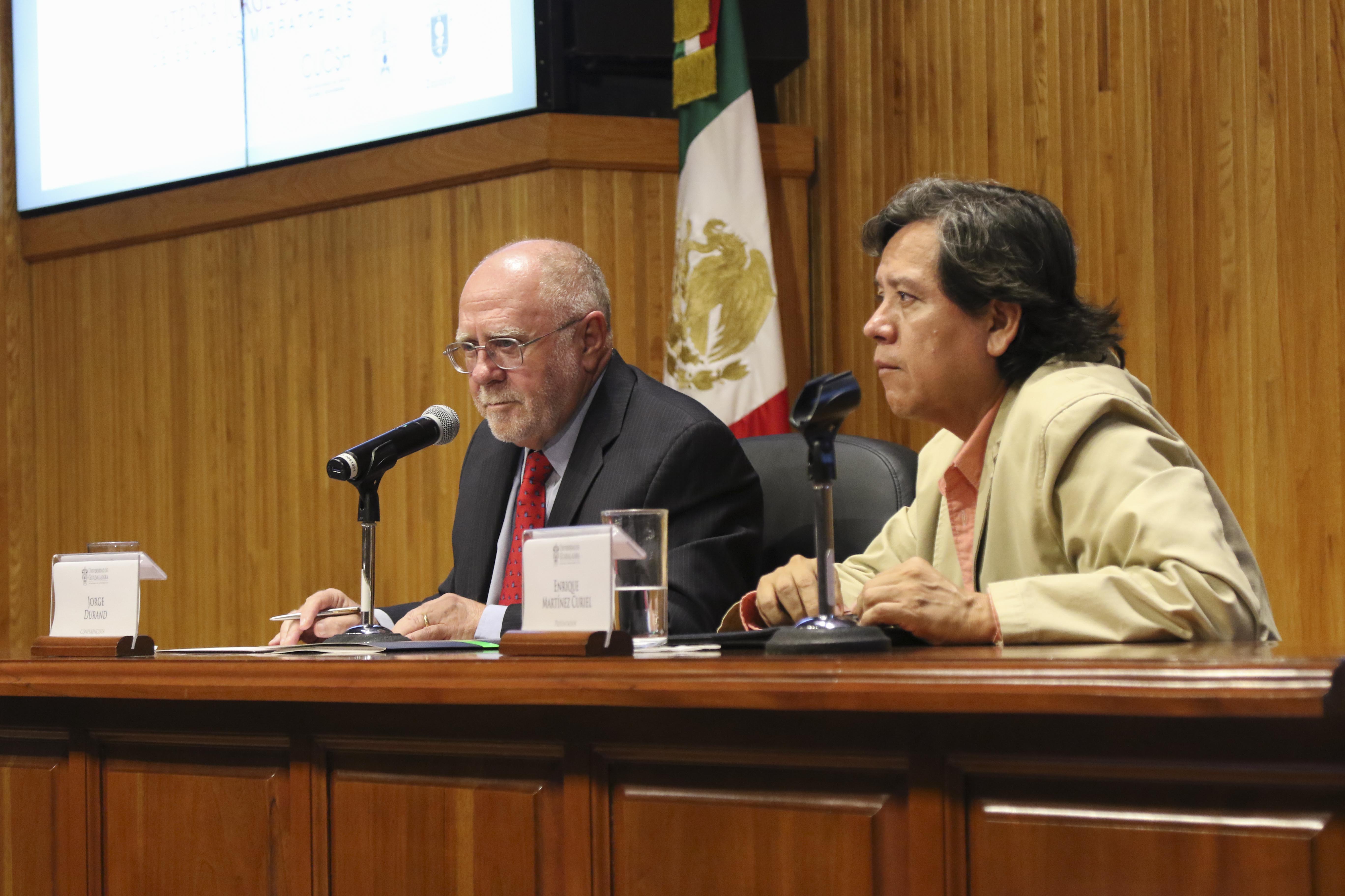 El doctor Enrique Martínez Curiel, académico de la UdeG, fue el encargado de presentar al doctor Jorge Durand, a quien definió como “un investigador total, que tiene el acierto de abordar el fenómeno migratorio desde todas las aristas: política, histórica, demográfica, cultural, de derechos humanos, entre otras”.