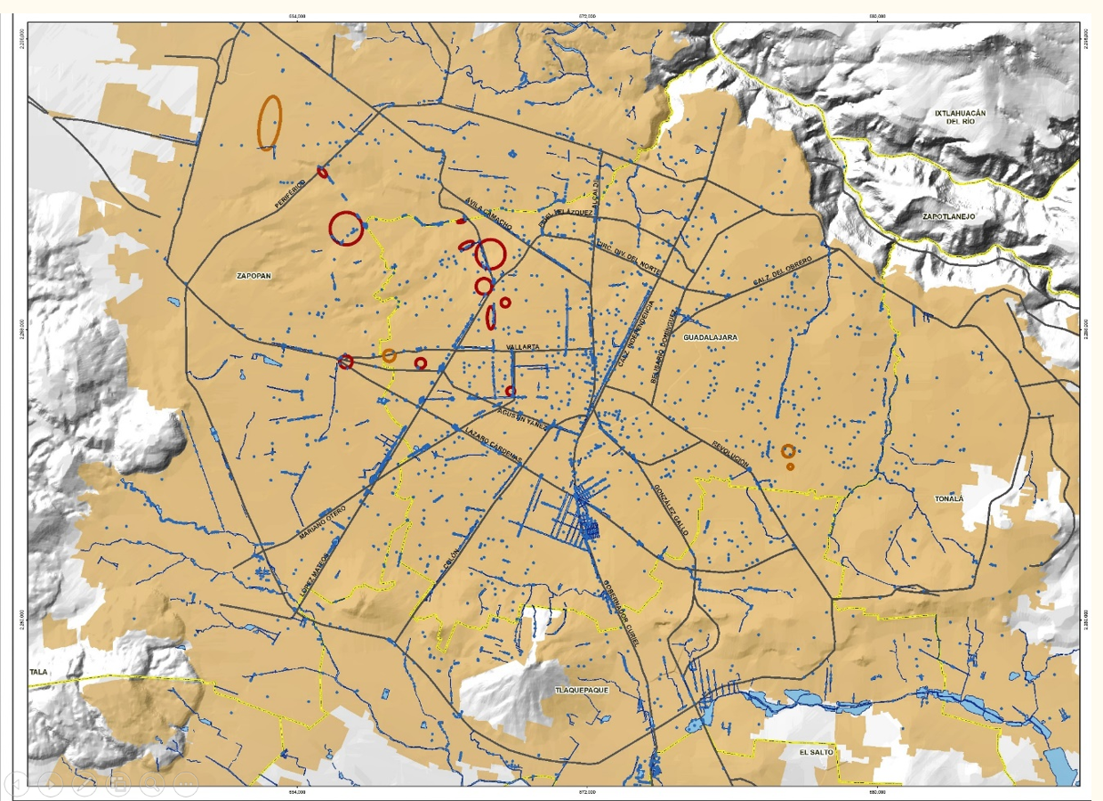 En Tlajomulco, los canales que vienen de Santa Anita, el canal de Las Pintas, La Colorada, Chulavista, Unión del Cuatro, avenida Adolph Horn. “Es una ciudad vulnerable porque el patrón del comportamiento del crecimiento urbano está vinculado con los intereses inmobiliarios”, recalcó.
