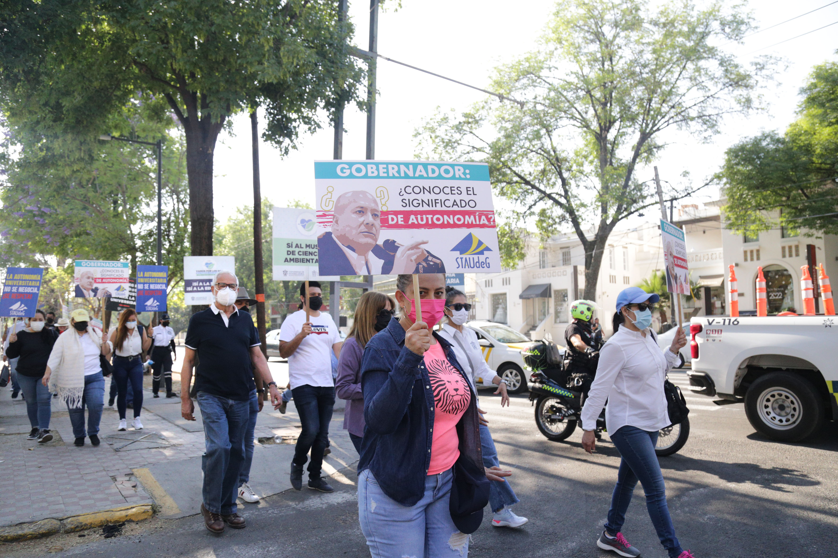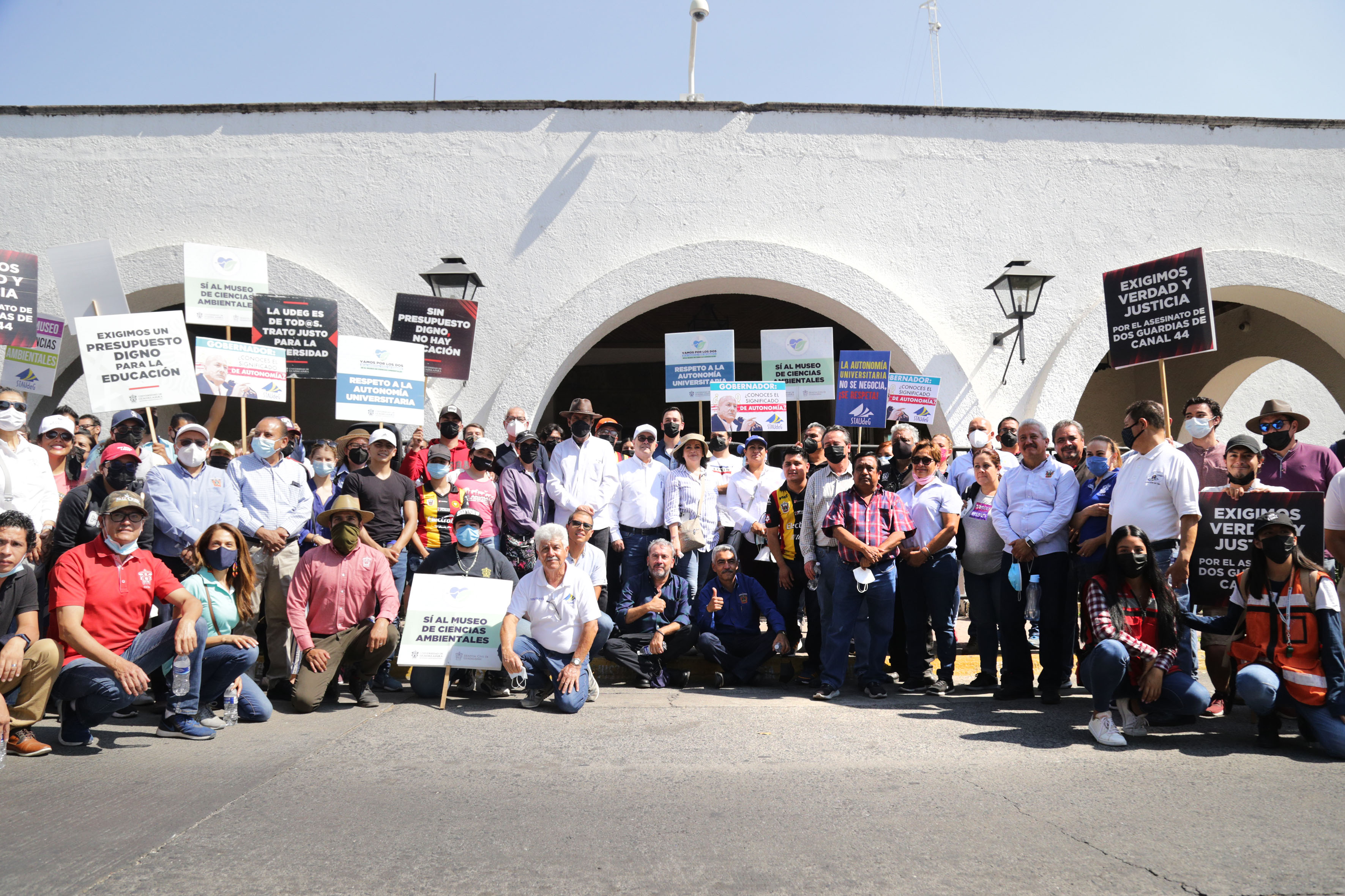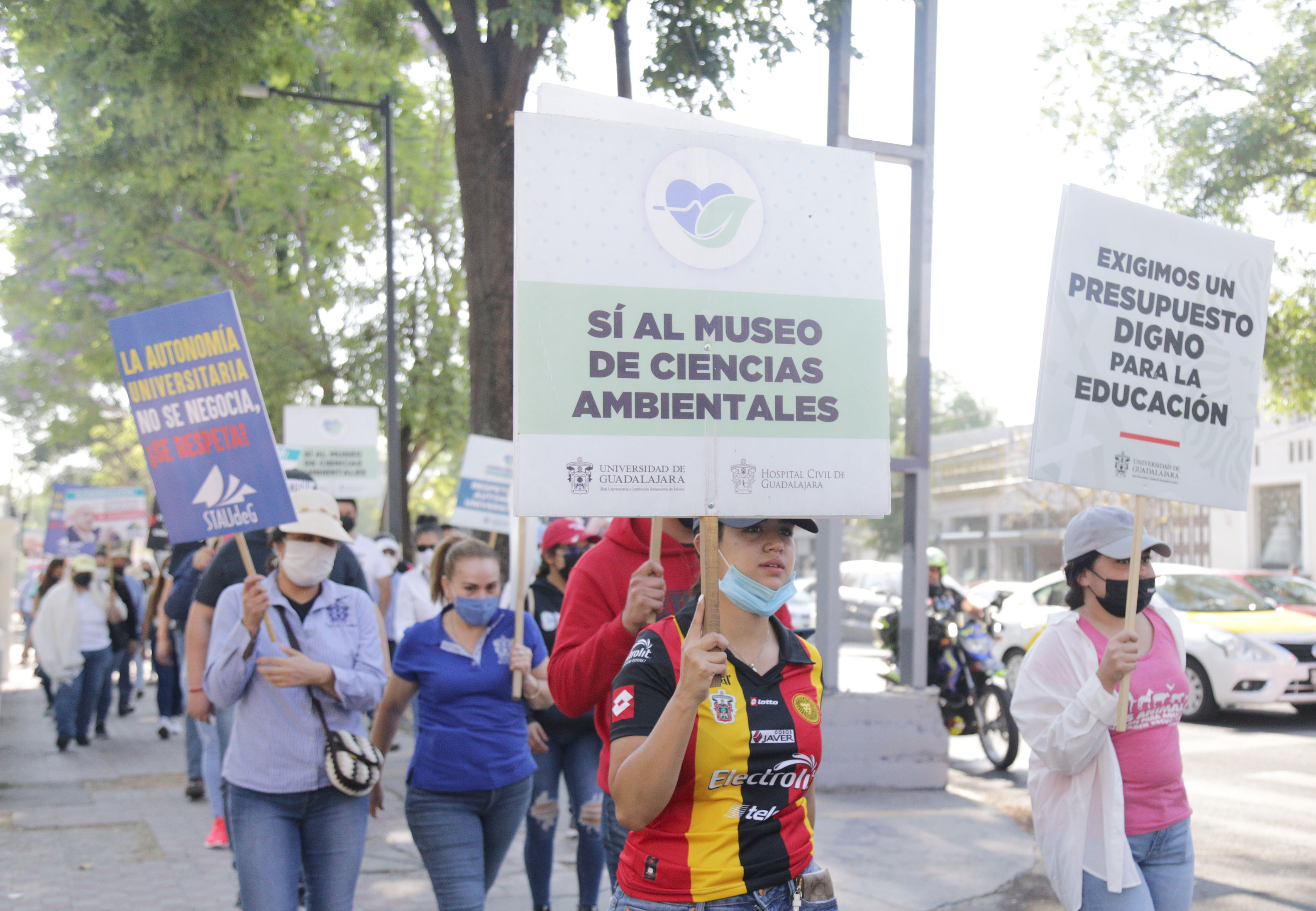 La caminata, que inició en la explanada del edificio de Rectoría General y concluyó afuera de Casa Jalisco, fue motivada por el recorte a la Universidad de Guadalajara (UdeG) de 140 millones de pesos que estaban destinados a la construcción del Museo de Ciencias Ambientales (MCA).