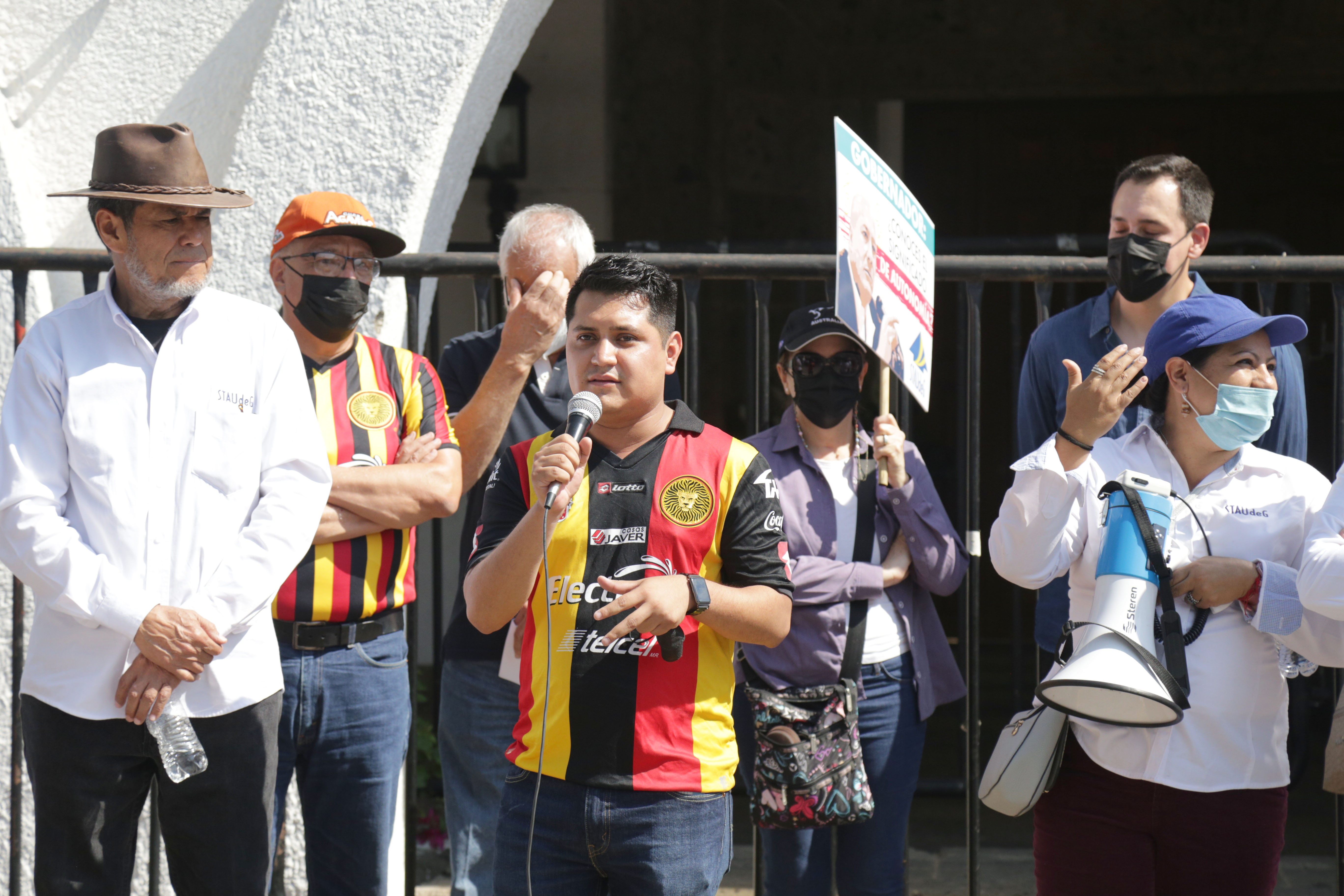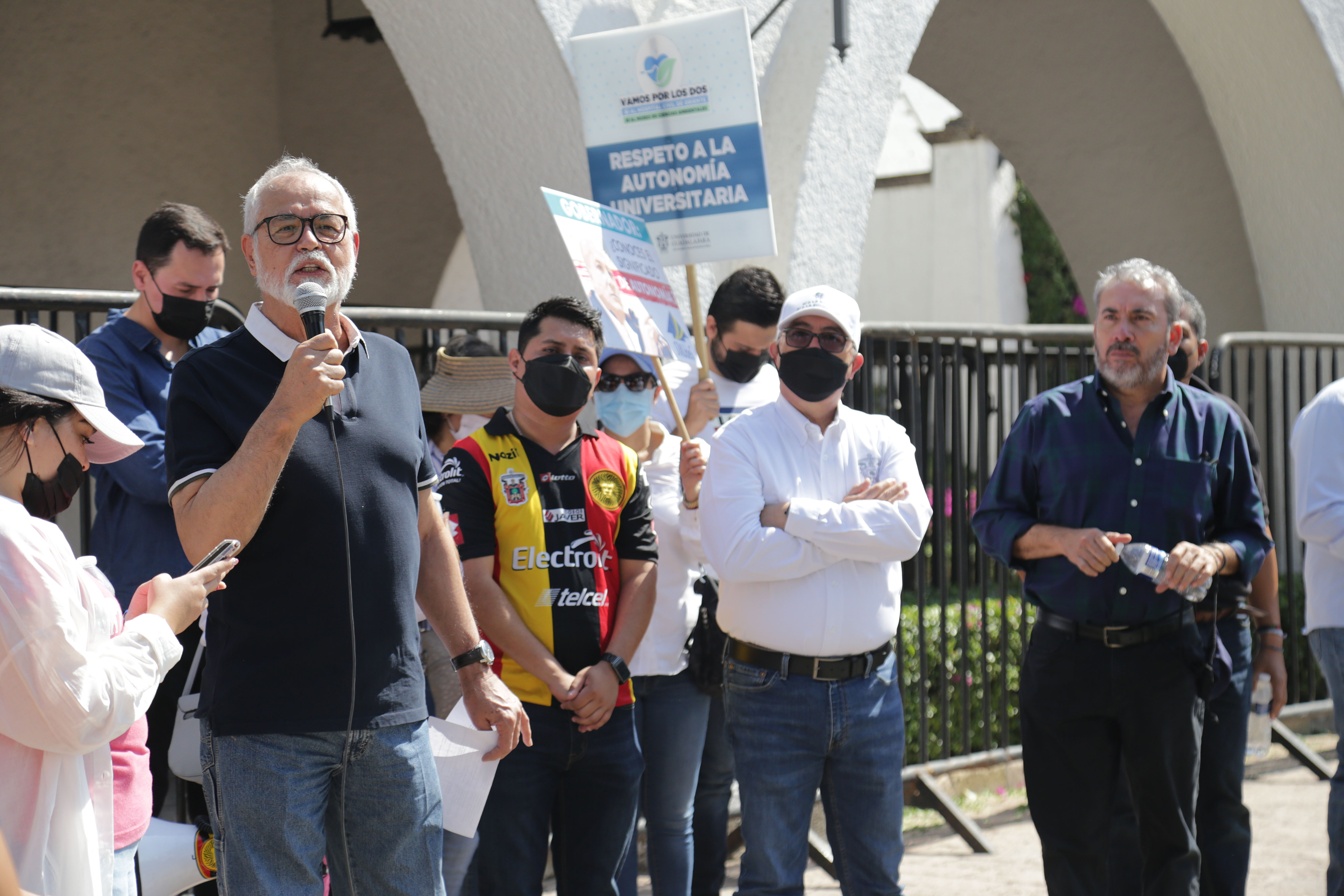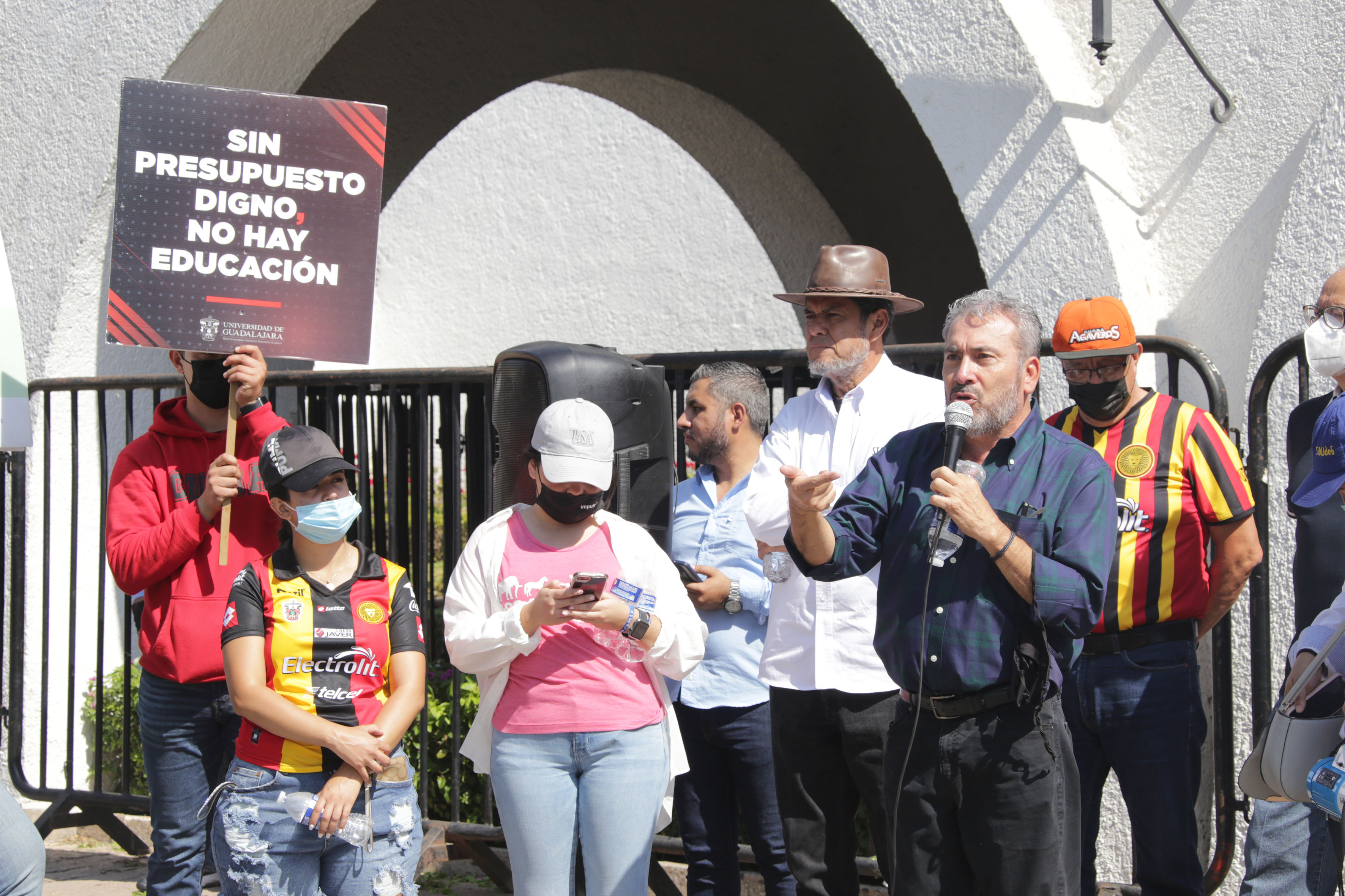 El licenciado Jesús Palafox Yáñez, secretario general del Sindicato de Trabajadores Académicos de la Universidad de Guadalajara (STAUdeG) y el maestro Jesús Becerra Santiago, Secretario del Sindicato Único de Trabajadores de la UdeG (SUTUdeG), pronunciaron discursos en favor de la causa universitaria.