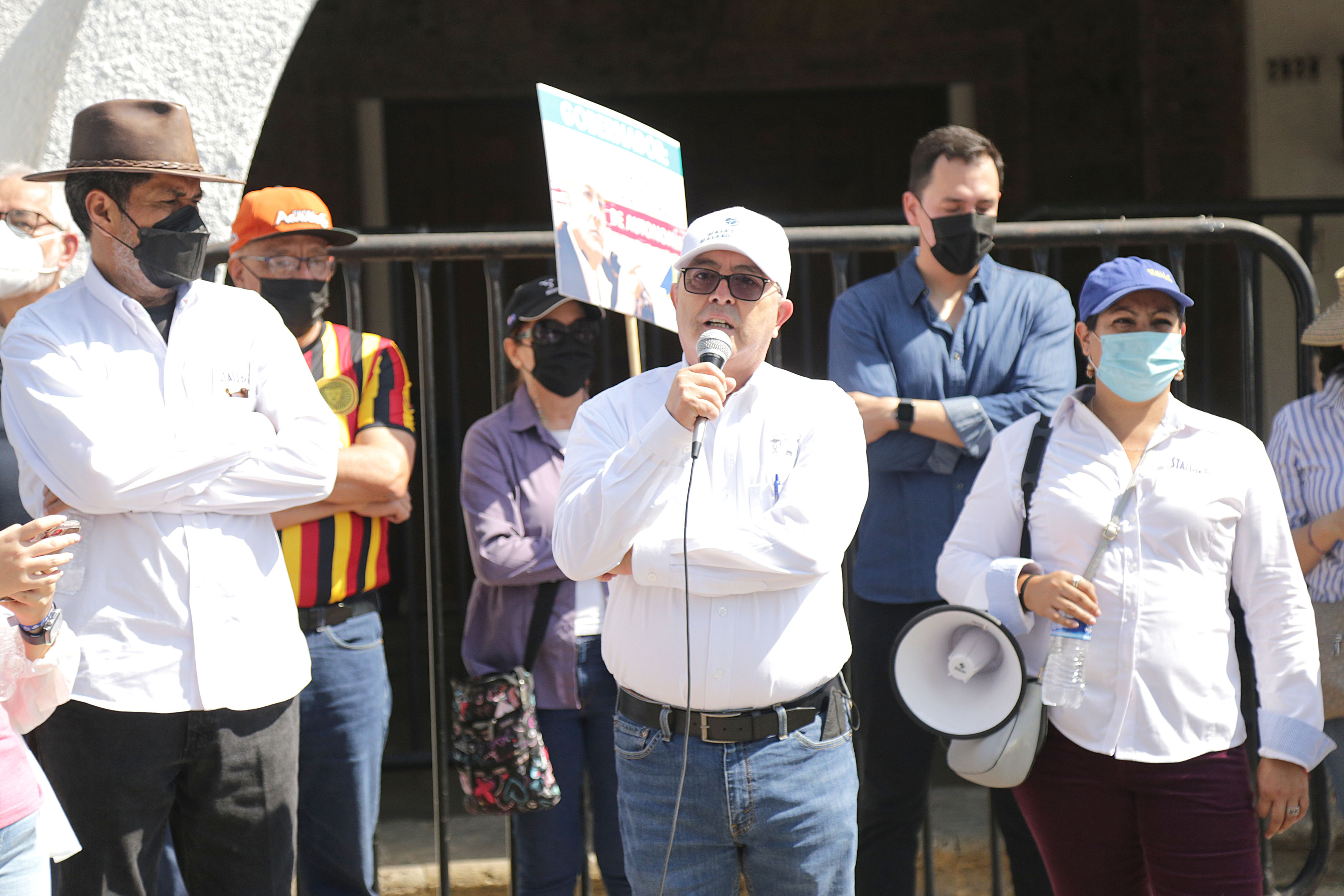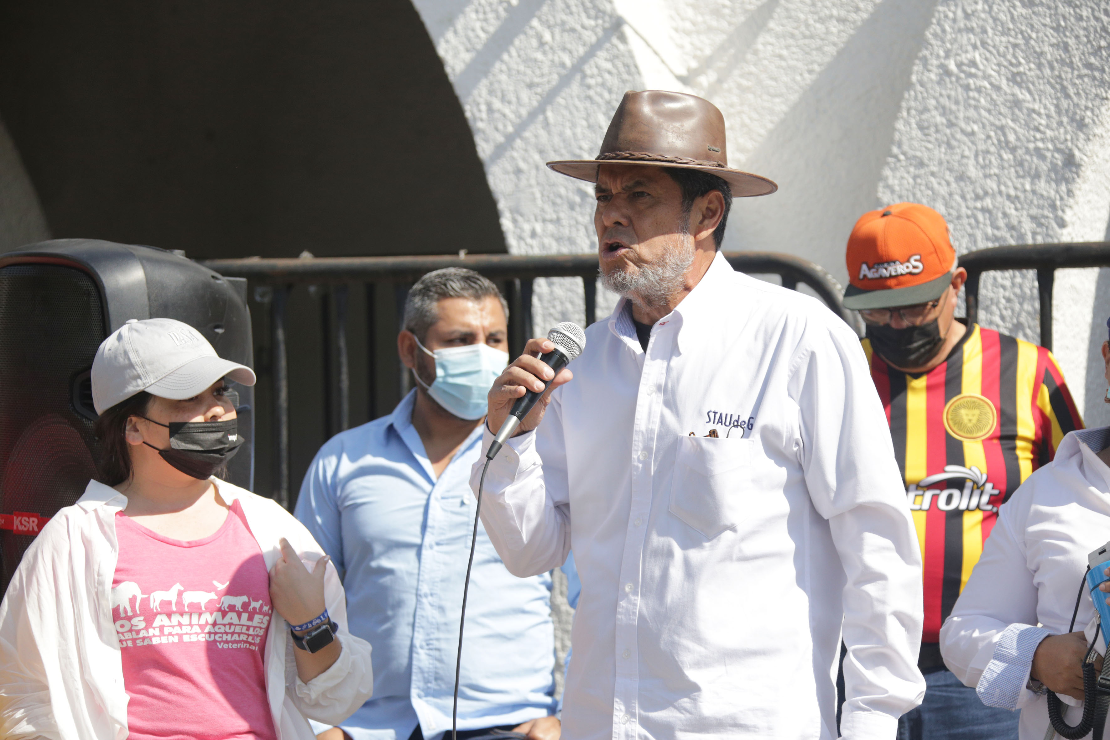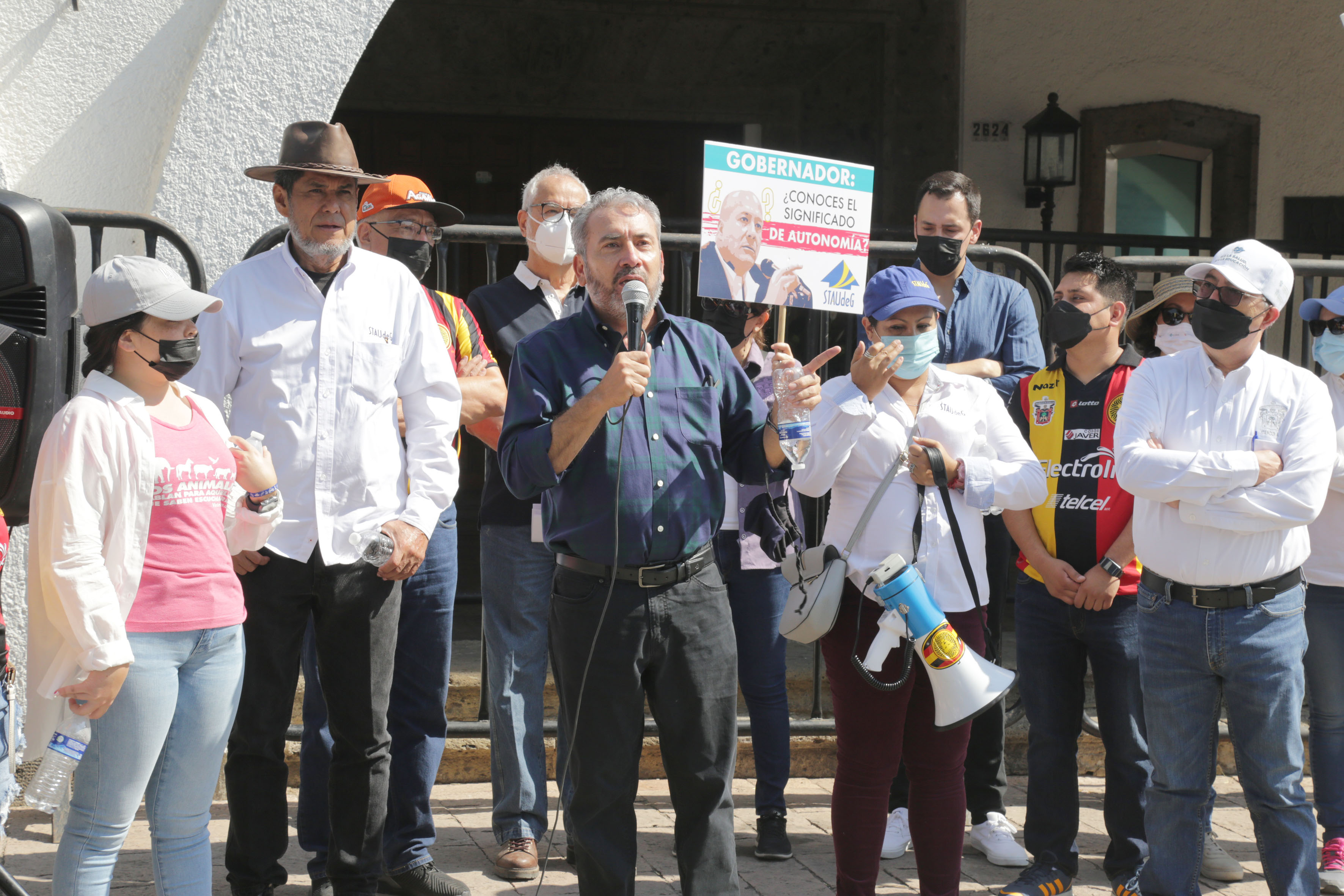 El licenciado Jesús Palafox Yáñez, secretario general del Sindicato de Trabajadores Académicos de la Universidad de Guadalajara (STAUdeG) y el maestro Jesús Becerra Santiago, Secretario del Sindicato Único de Trabajadores de la UdeG (SUTUdeG), pronunciaron discursos en favor de la causa universitaria.