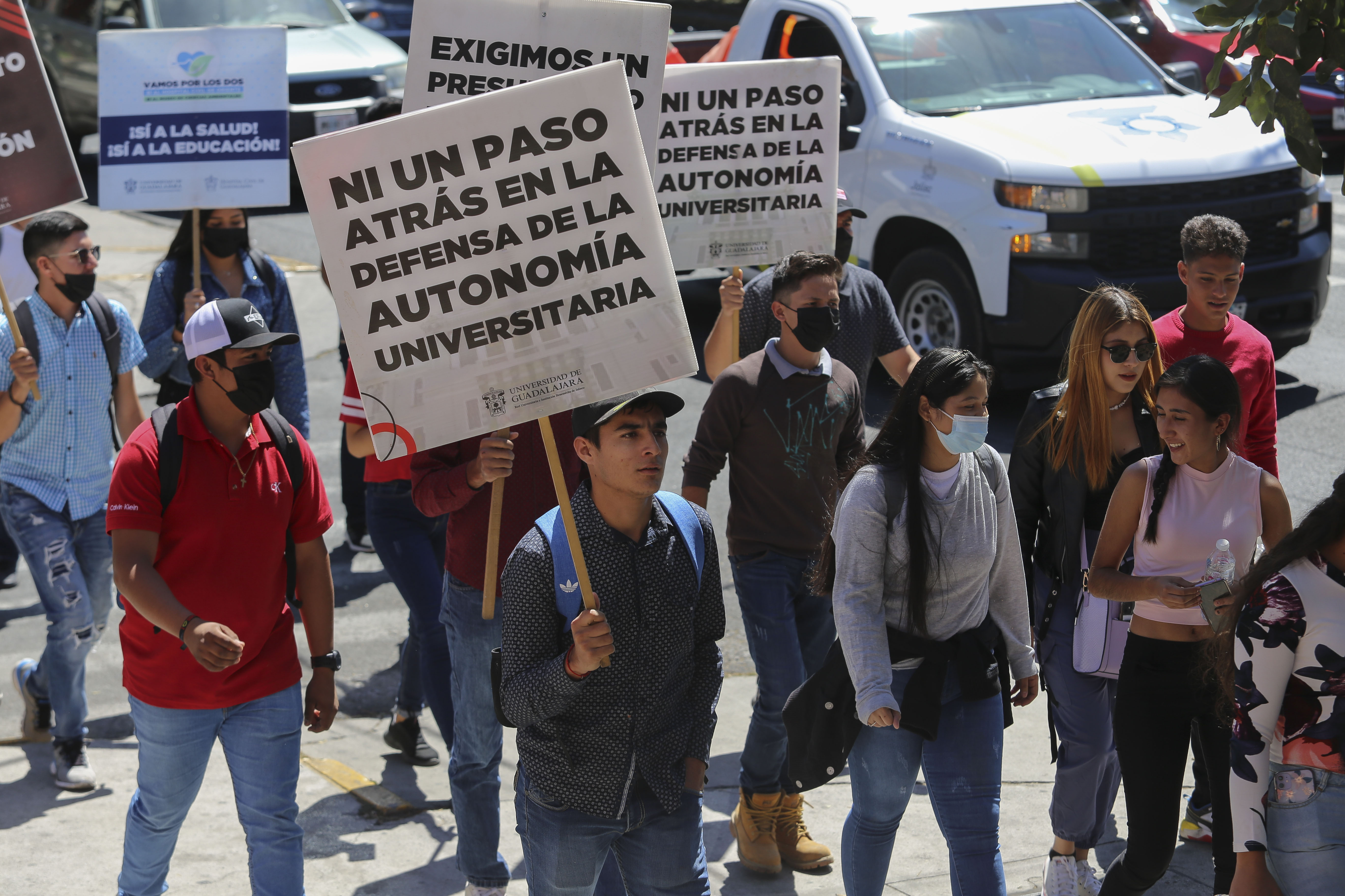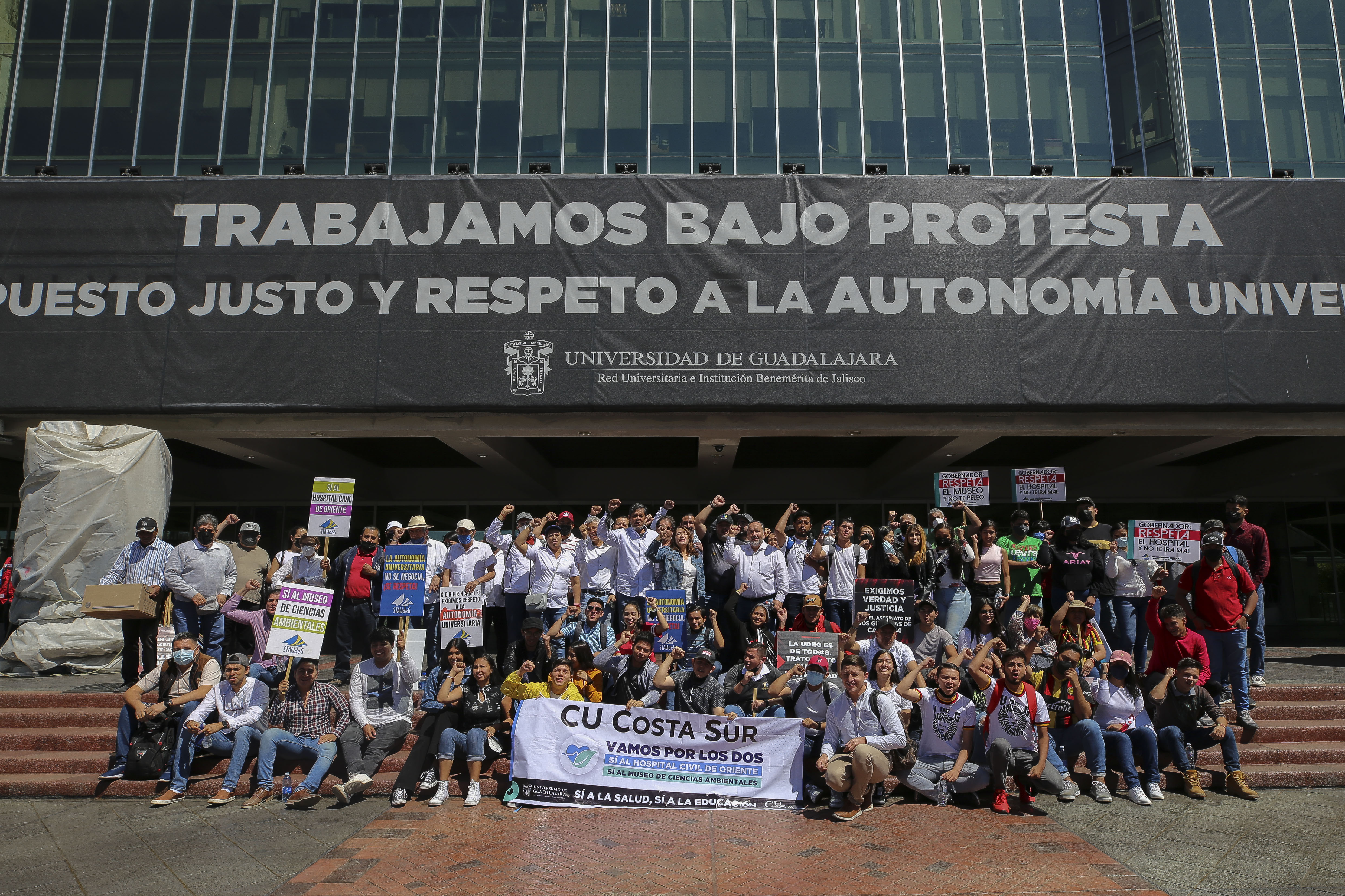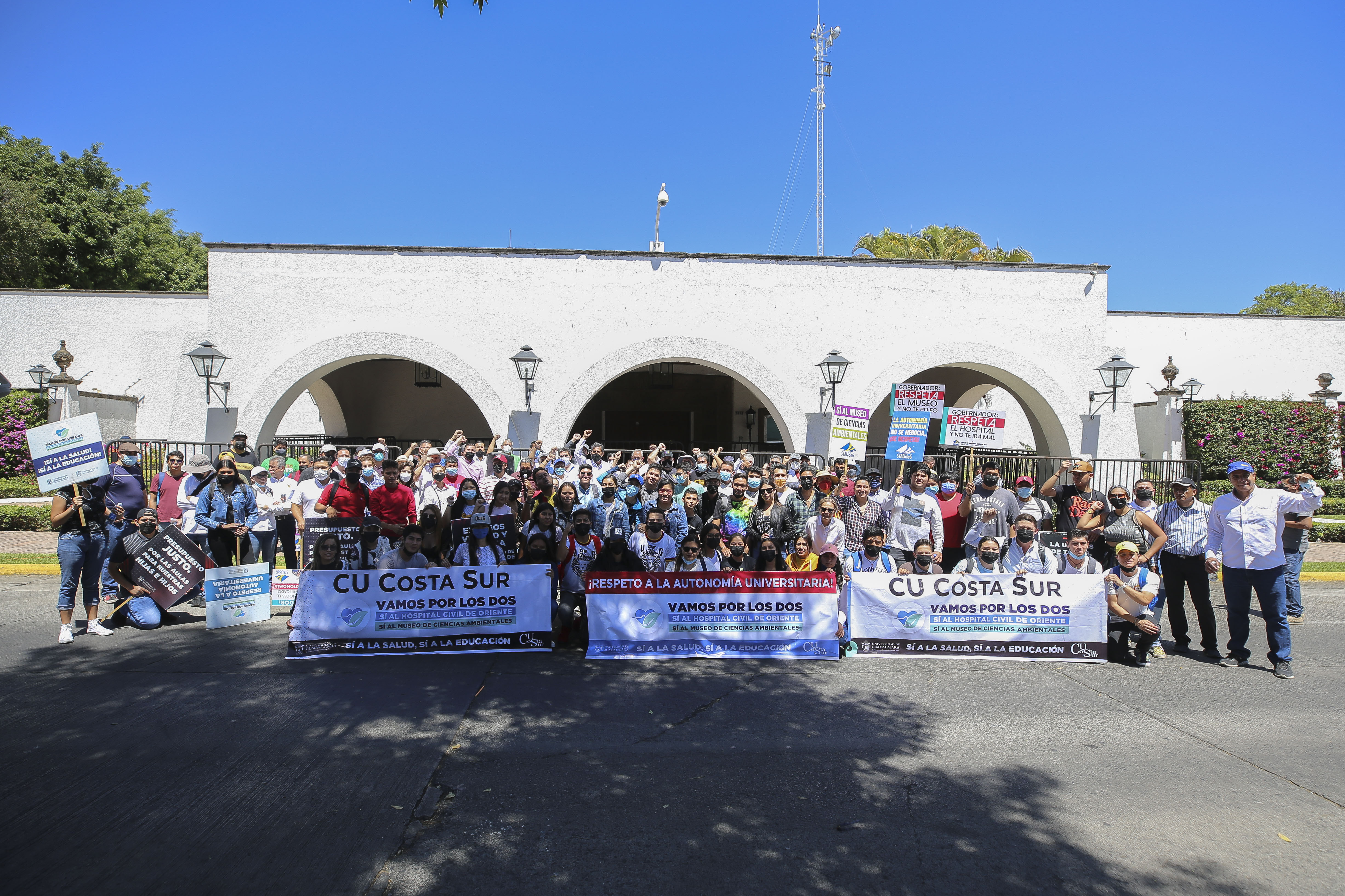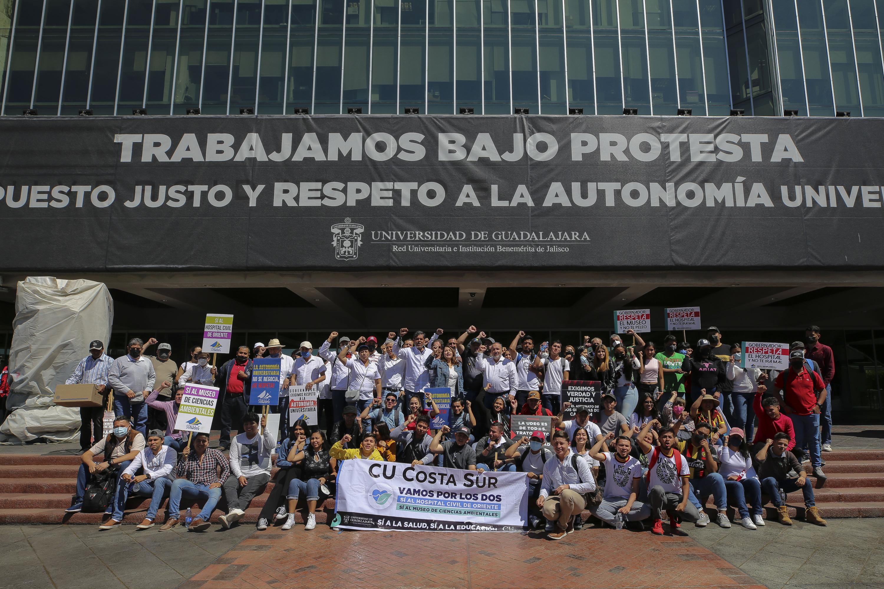 Universitarios marcharon a Casa Jalisco con el fin de exigir que sea respetada la autonomía universitaria y que a la UdeG le devuelvan los 140 millones de pesos que serían destinados a la construcción del Museo de Ciencias Ambientales (MCA) y que fueron recortados por el gobierno estatal para destinarlos a la construcción del Hospital Civil de Oriente (HCO).