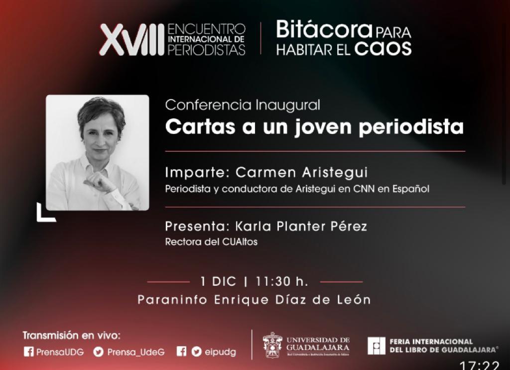La conferencia inaugural “Cartas a un joven periodista” estará a cargo de Carmen Aristegui, Directora y conductora del noticiero “Aristegui en Vivo”, el jueves 1 de diciembre, a las 11:30 horas, en el Paraninfo Enrique Díaz de León.