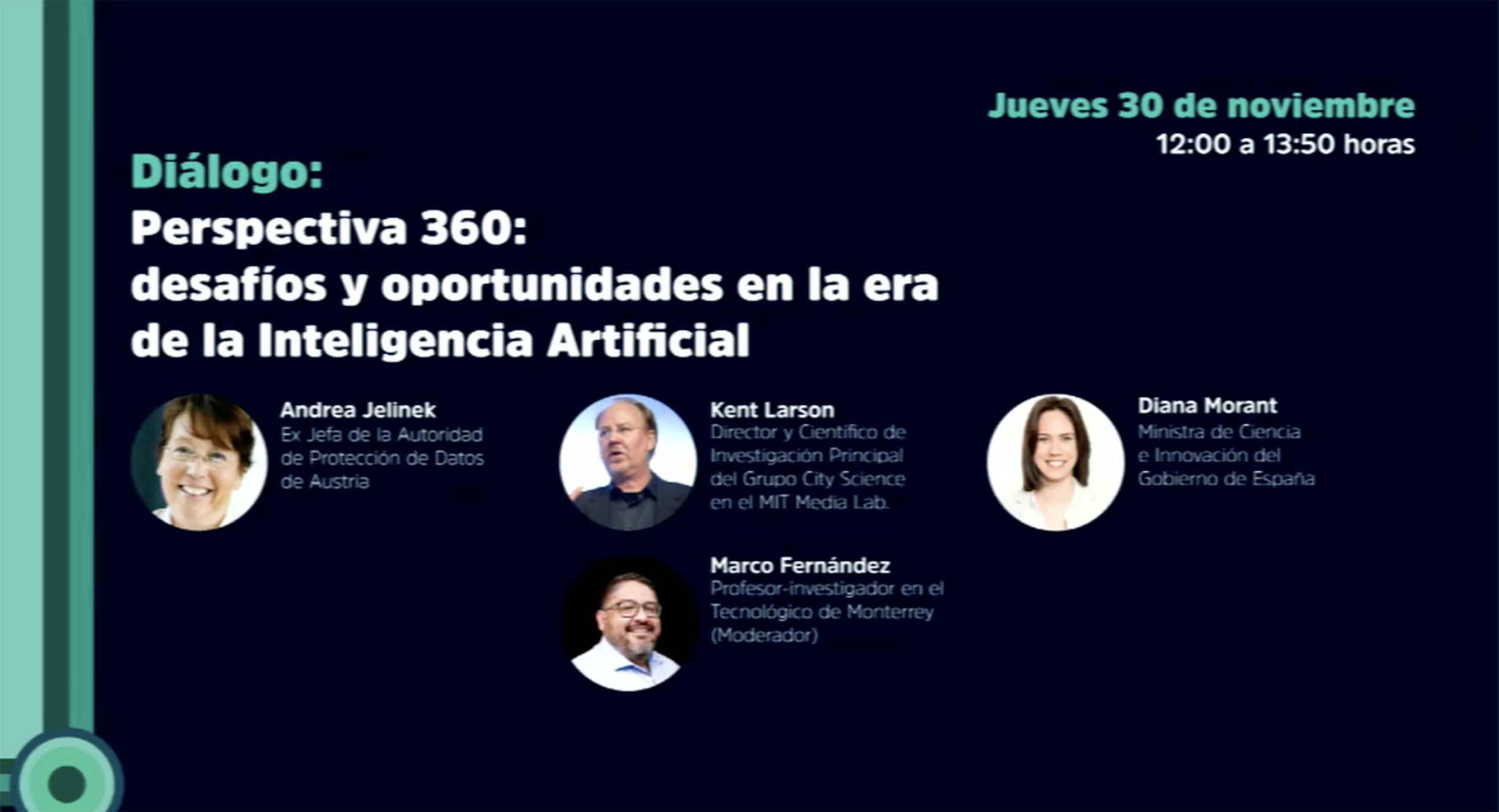 Este foro inicia el 30 de noviembre, a las 12:00 horas, en el auditorio del Hotel Barceló con la mesa “Perspectiva 360: desafíos y oportunidades en la era de la inteligencia artificial” y la participación de especialistas como Andrea Jelinek, Exjefa de la Autoridad de Protección de Datos de Austria y Kent Larson, Director de City Science en el MIT Media Lab.