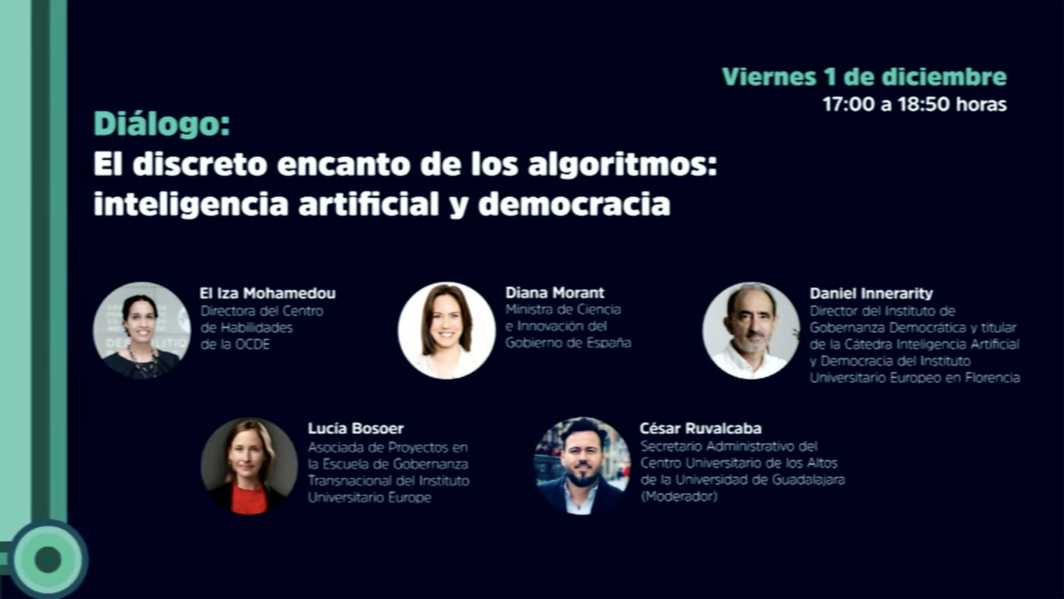Como parte de este foro, el viernes 1 de diciembre, de 17:00 a 18:50 horas, se llevará a cabo la mesa “El discreto encanto de los algoritmos: inteligencia artificial y democracia”, en la que participarán Daniel Innerarity, titular de la Cátedra de Inteligencia Artificial y Democracia del Instituto Universitario Europeo en Florencia.