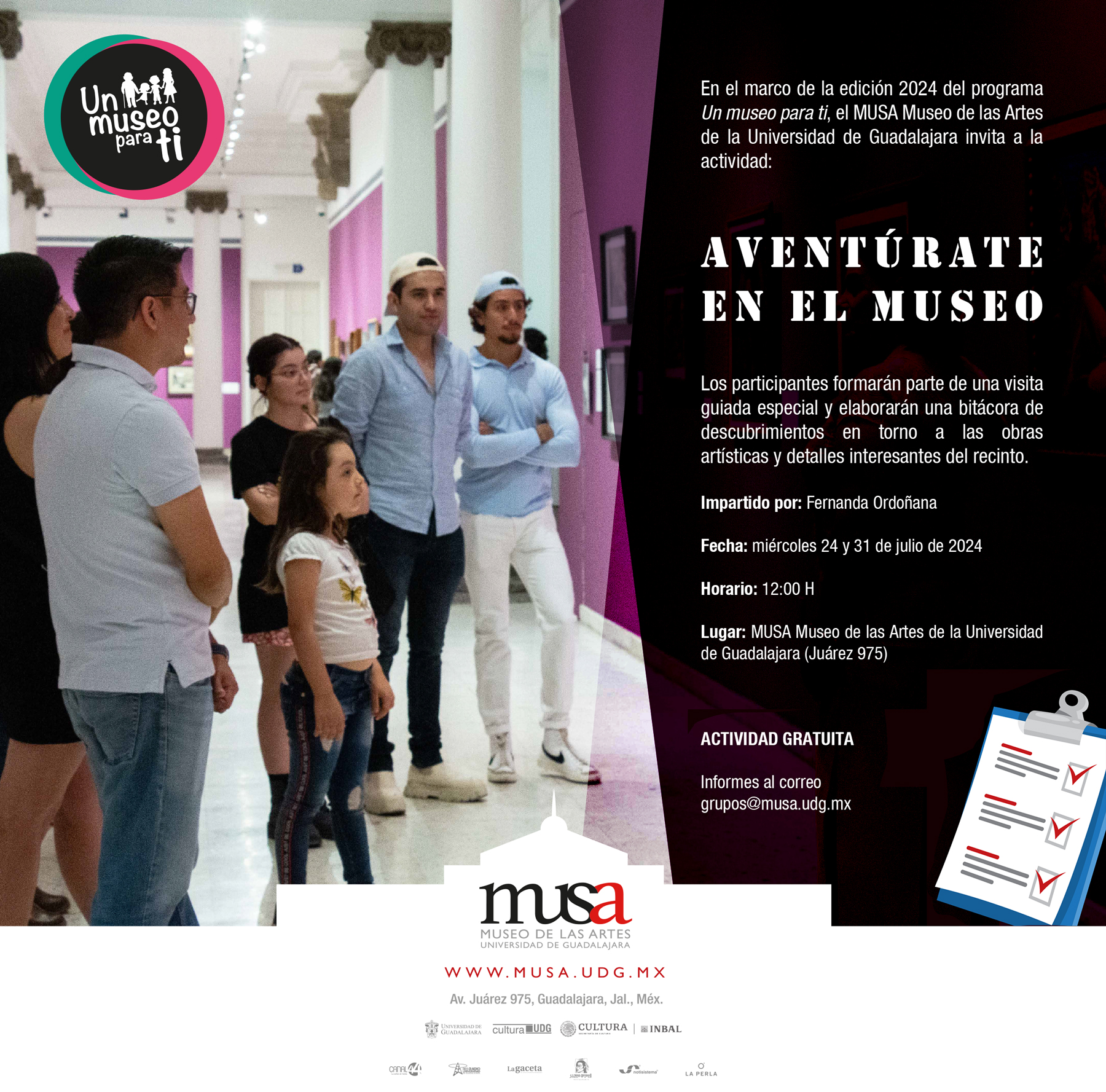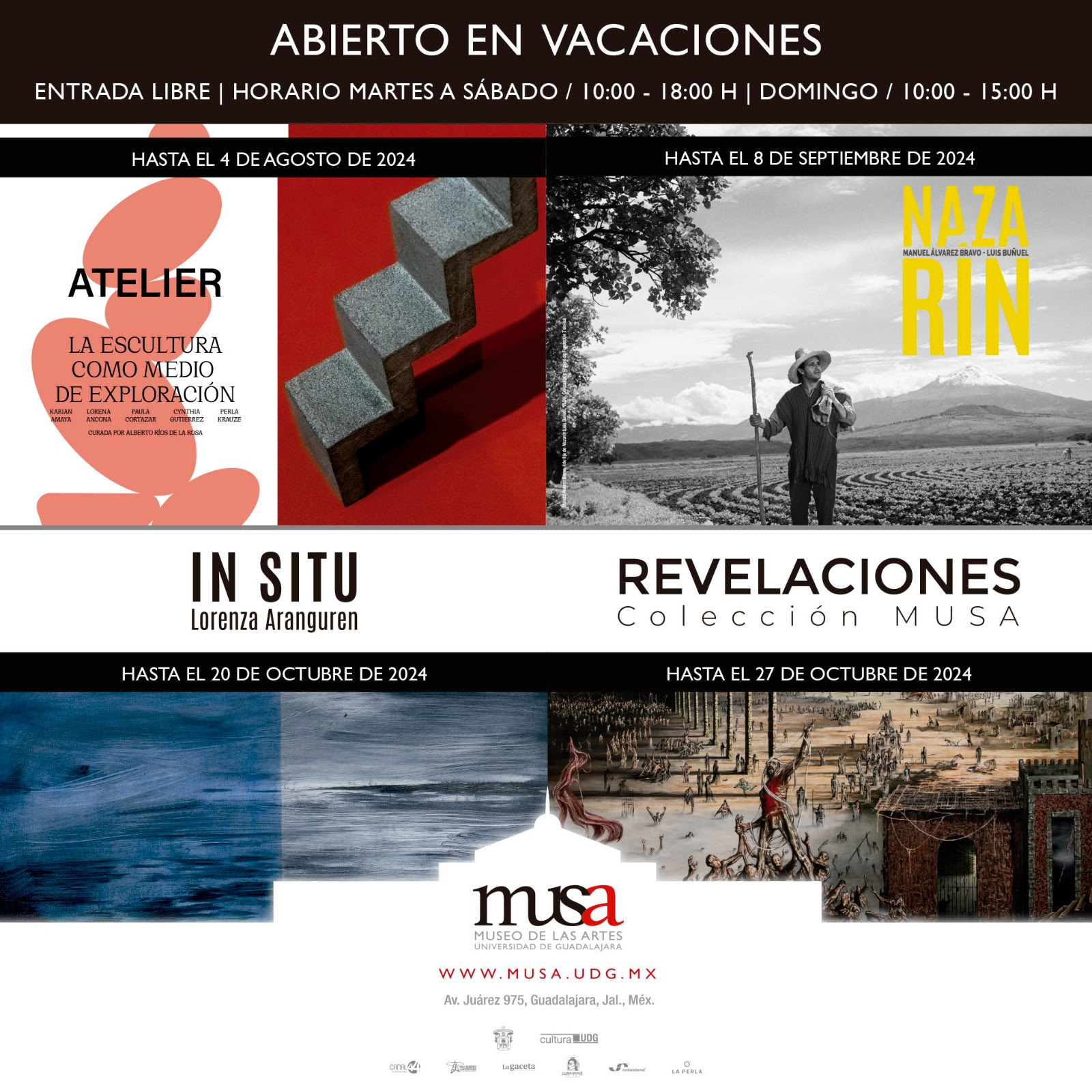 Como un servicio a los visitantes, habrá recorridos programados de martes a viernes a las 12:00 y 16:00 horas, del 17 de julio al 2 de agosto. Mayores informes al correo grupos@musa.udg.mx.