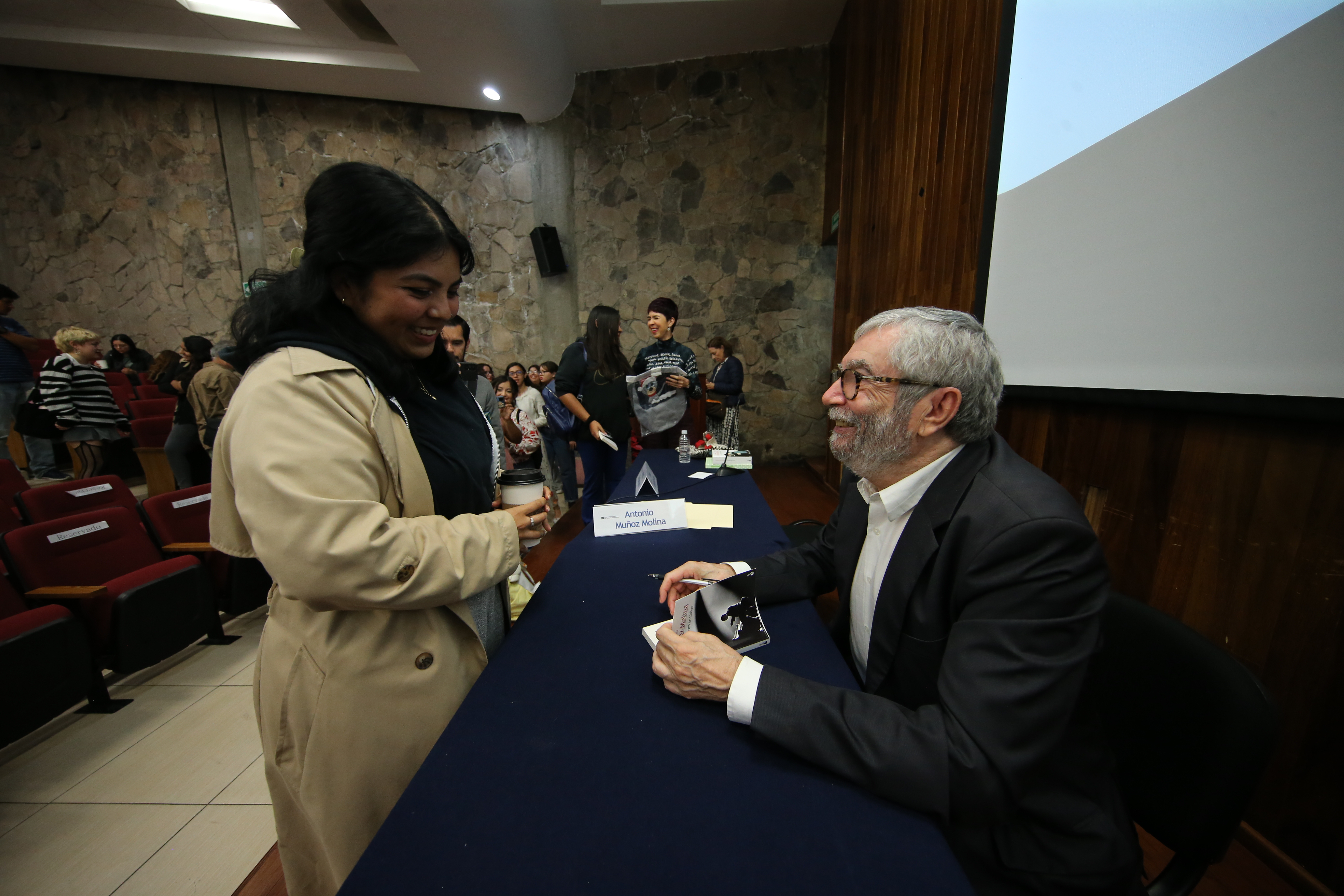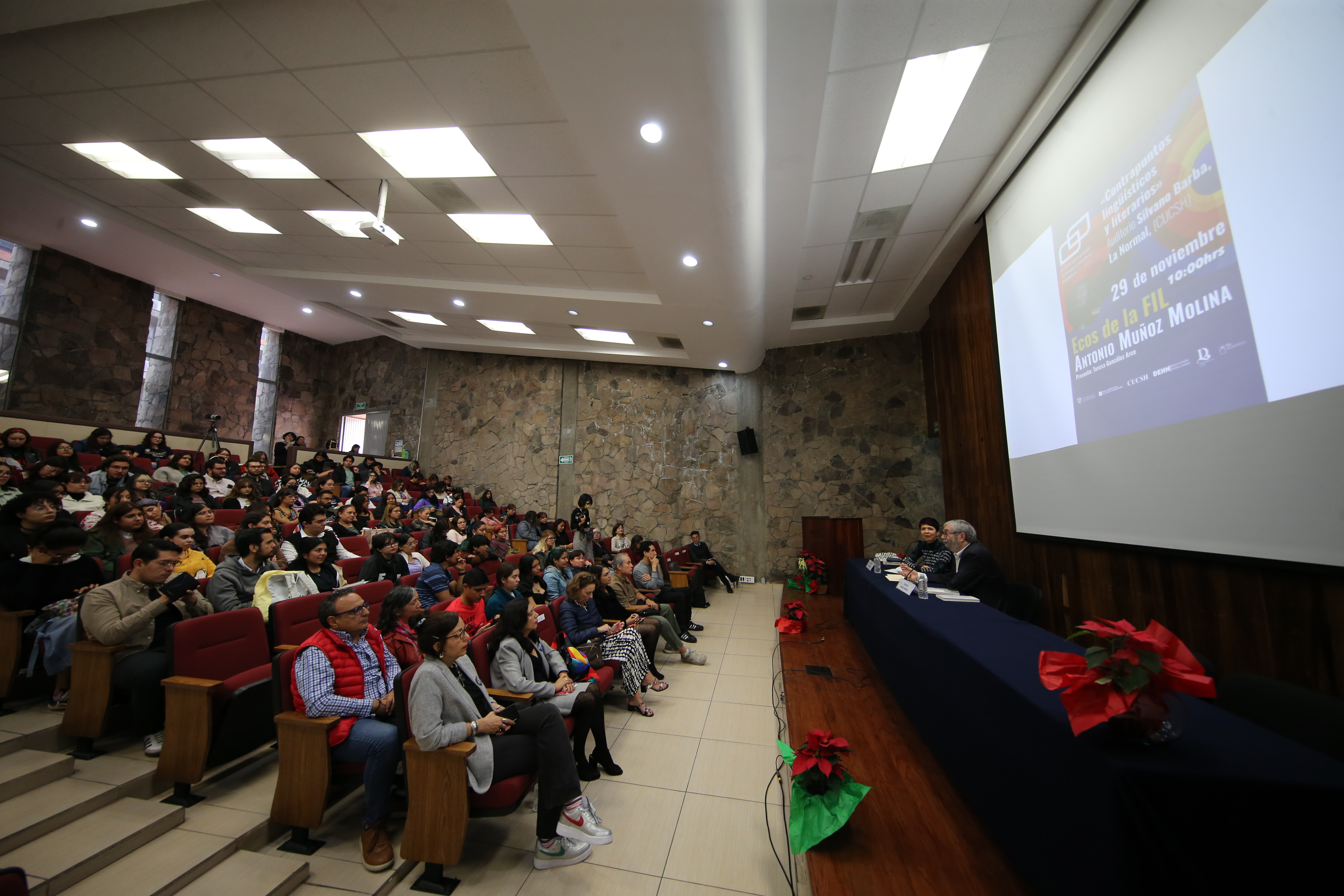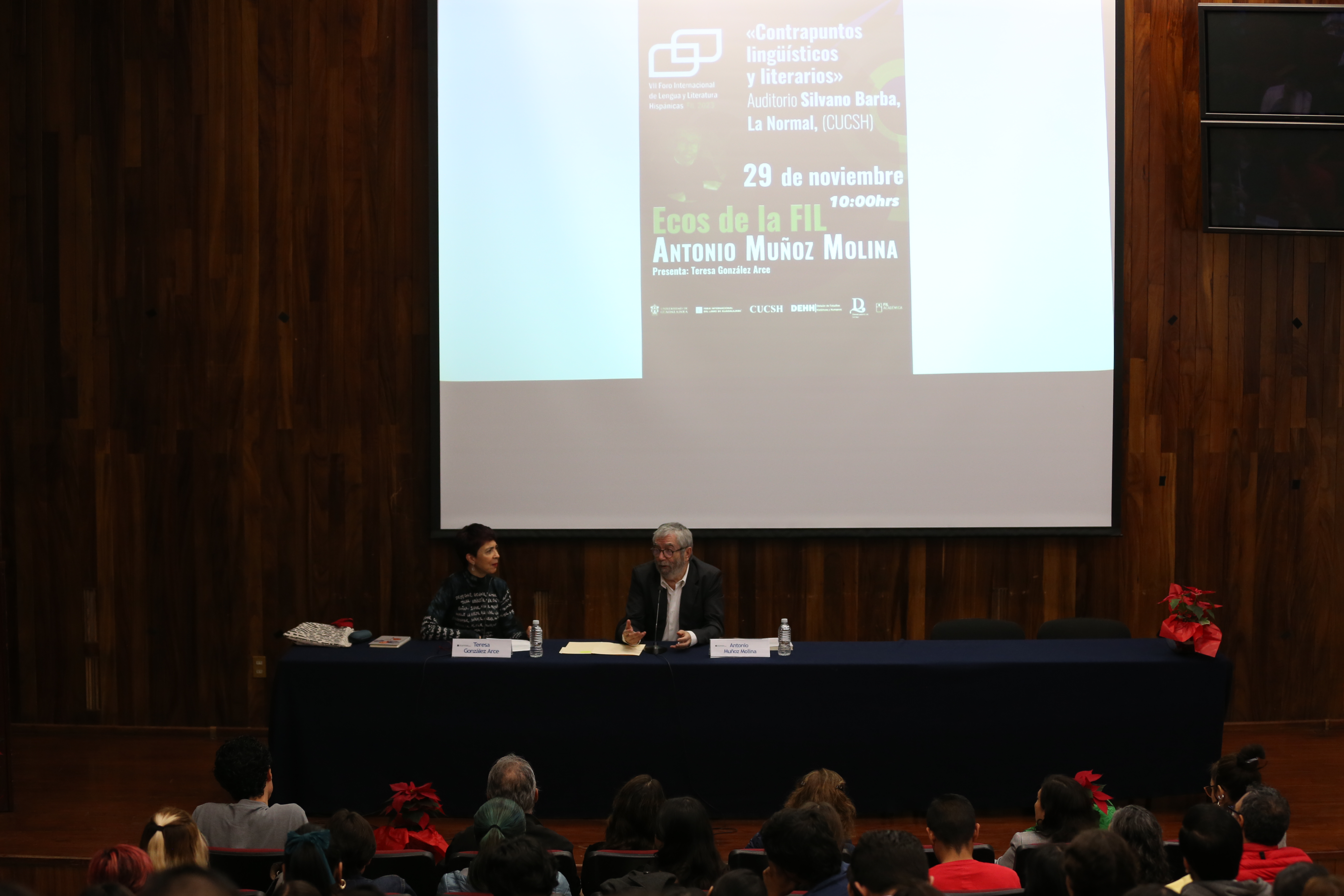 Luego de ser recibido en el auditorio Silvano Barba, campus La Normal, por el estudiantado con pancartas de colores con la leyenda “¡Bienvenido Antonio Muñoz Molina!”, el autor ofreció la conferencia “Contrapuntos lingüísticos y literarios”, en la que conversó con la académica Teresa González Arce.