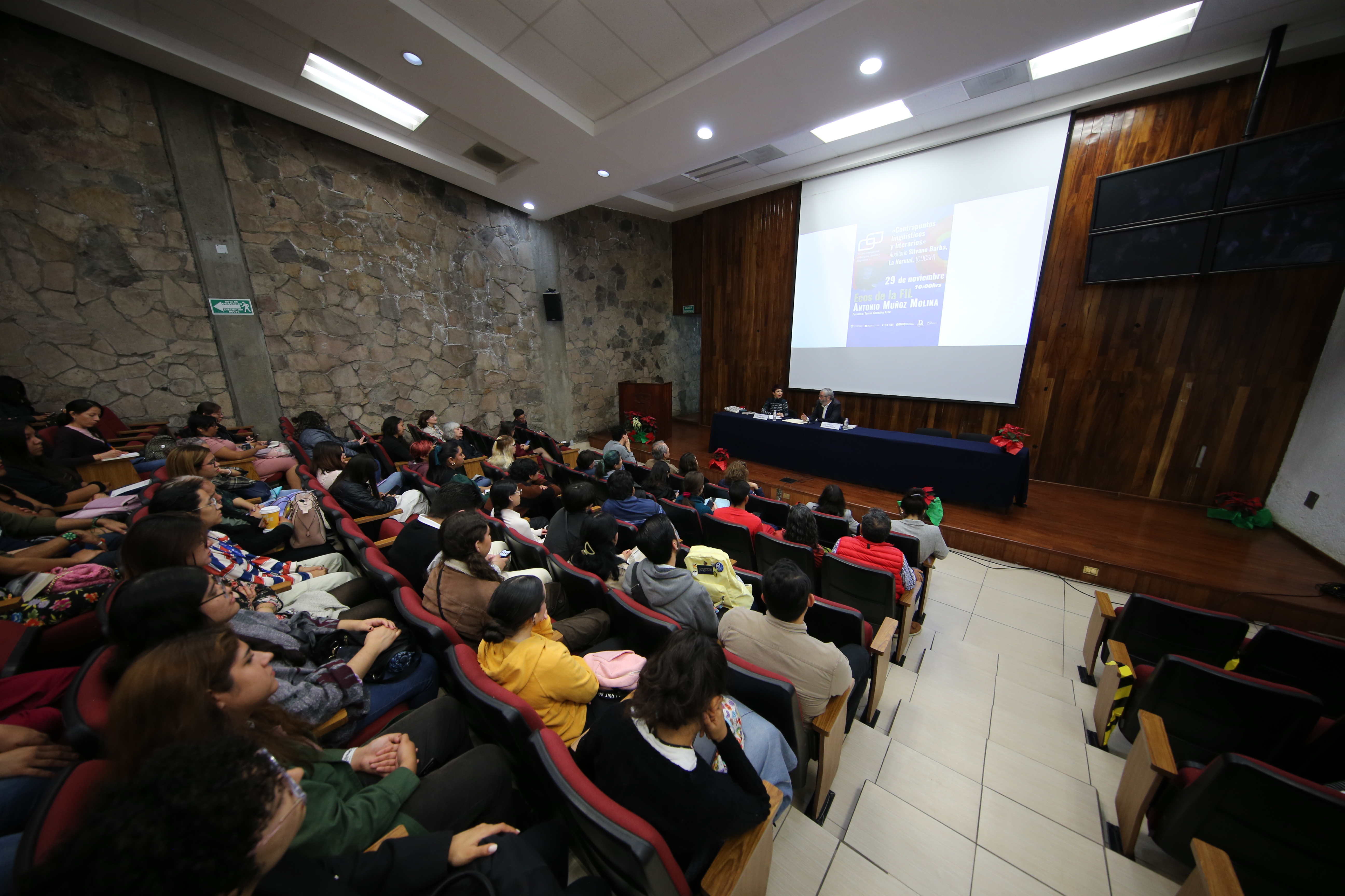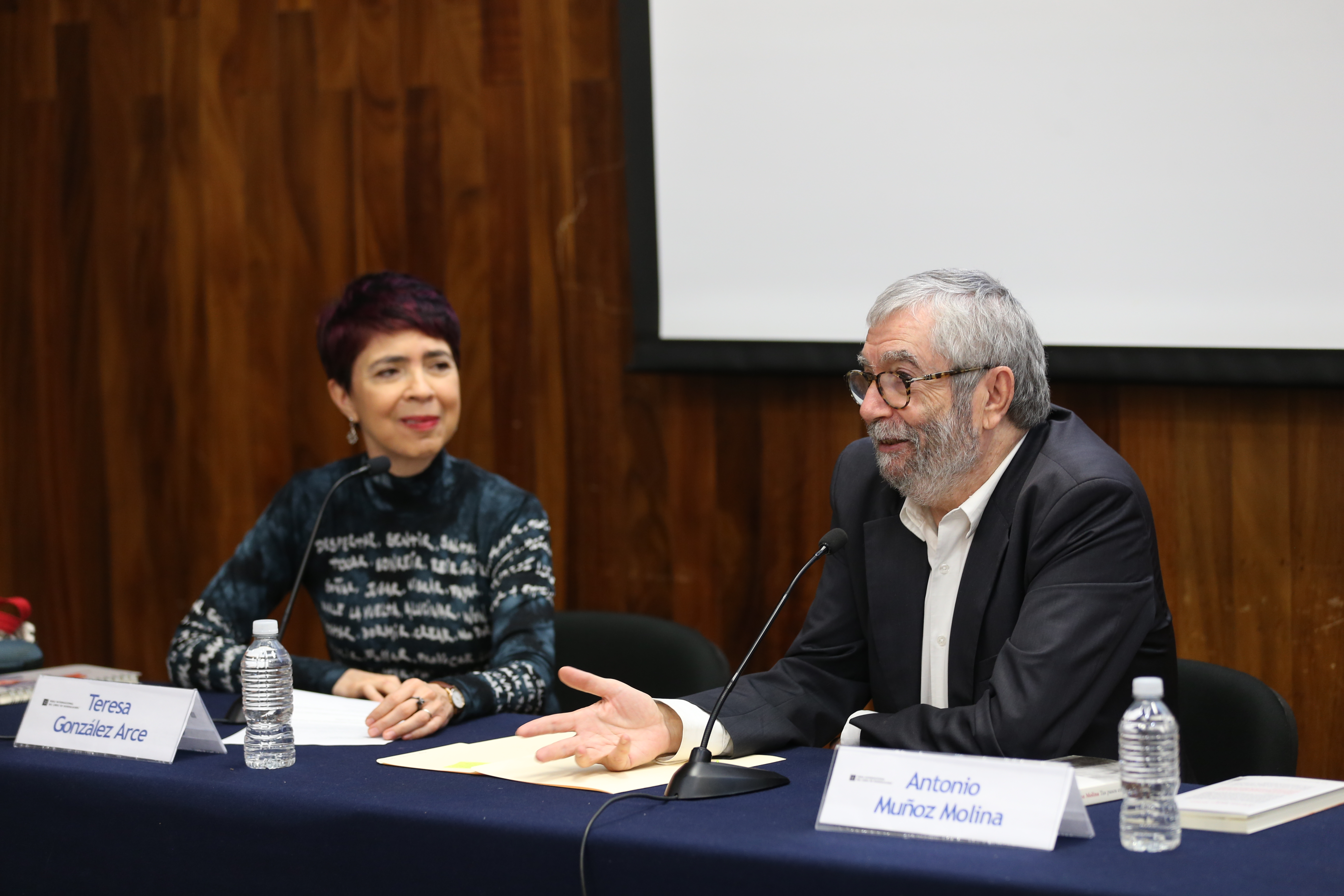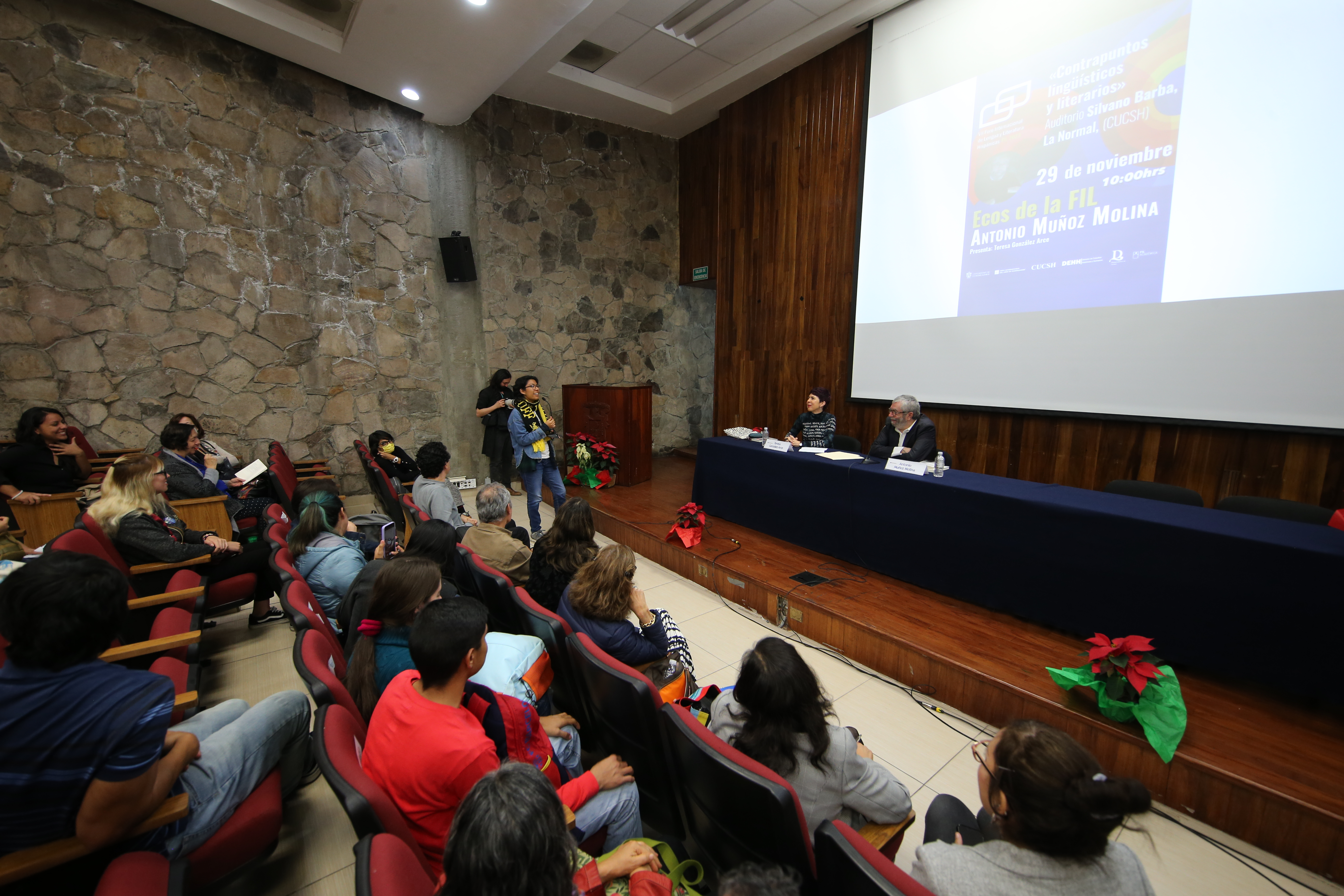 Luego de ser recibido en el auditorio Silvano Barba, campus La Normal, por el estudiantado con pancartas de colores con la leyenda “¡Bienvenido Antonio Muñoz Molina!”, el autor ofreció la conferencia “Contrapuntos lingüísticos y literarios”, en la que conversó con la académica Teresa González Arce.