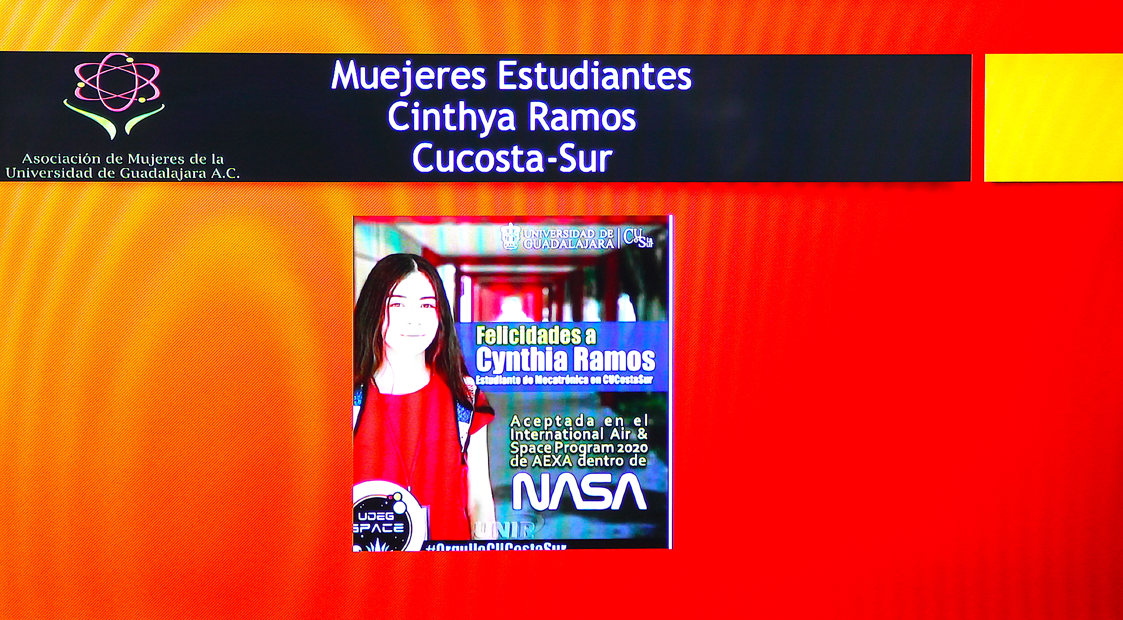 En Mujeres estudiantes será galardonada Cinthya Ramos, alumna del Centro Universitario de la Costa Sur (CUCSur), quien fue seleccionada para participar en un programa de la NASA y quien fue una de las 60 elegidas de un universo de cientos de participantes.