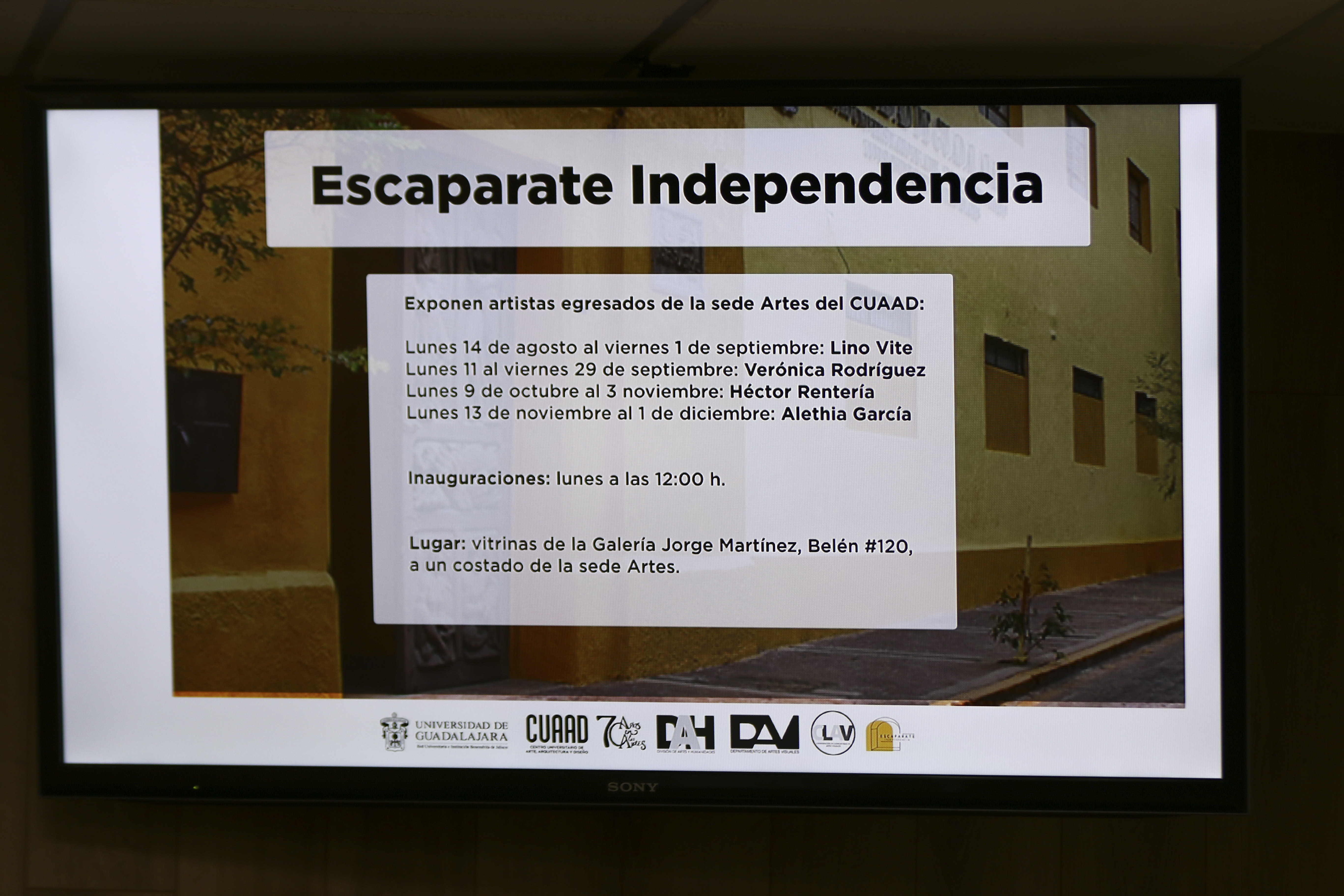 Para conocer los programas de actividades correspondientes se puede consultar el sitio cuaad.udg.mx, y redes sociales: en Facebook: https://www.facebook.com/CUAAD, y en Instagram: @galeria.jorgemartinez y @escaparateindependencia