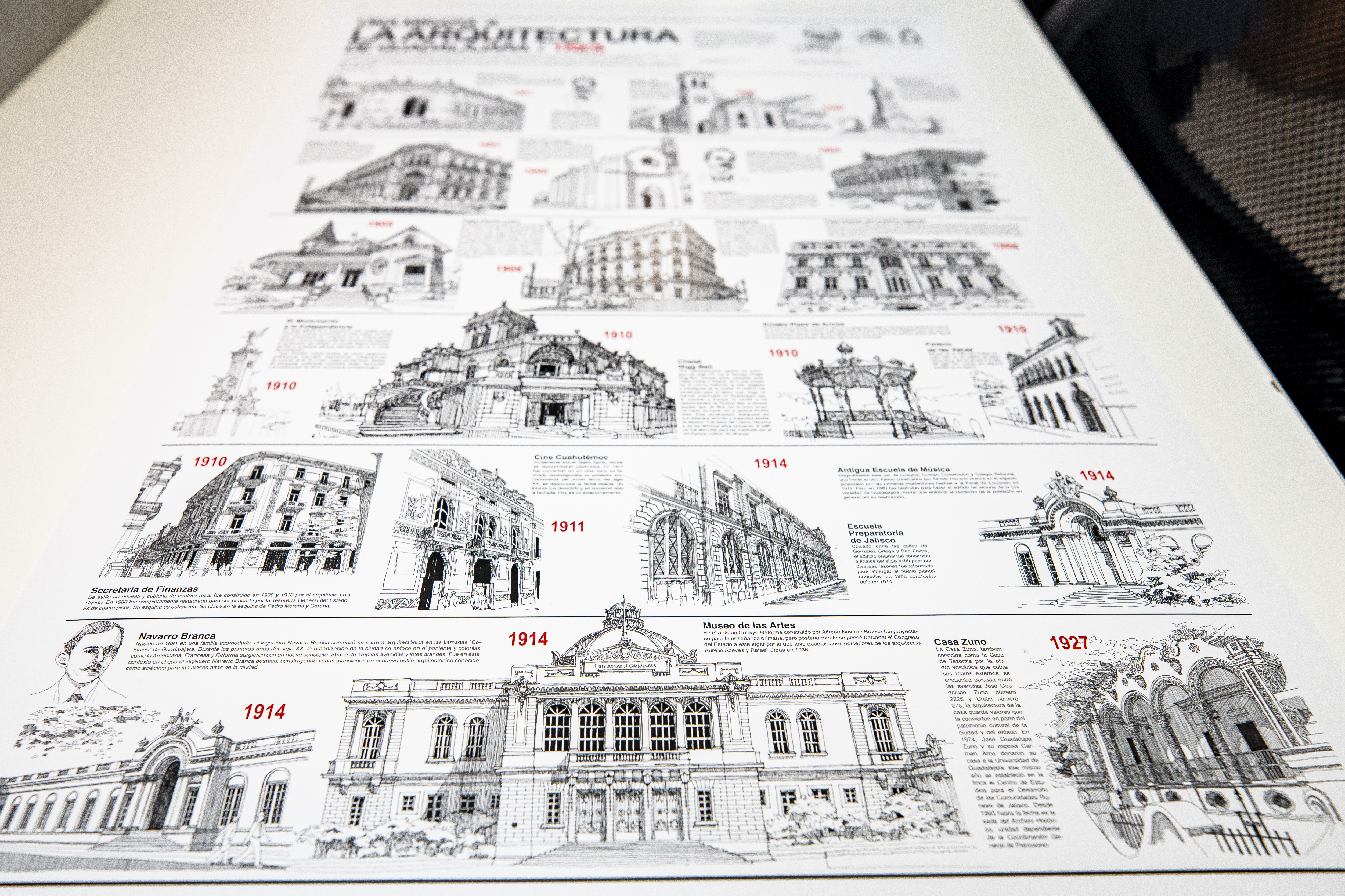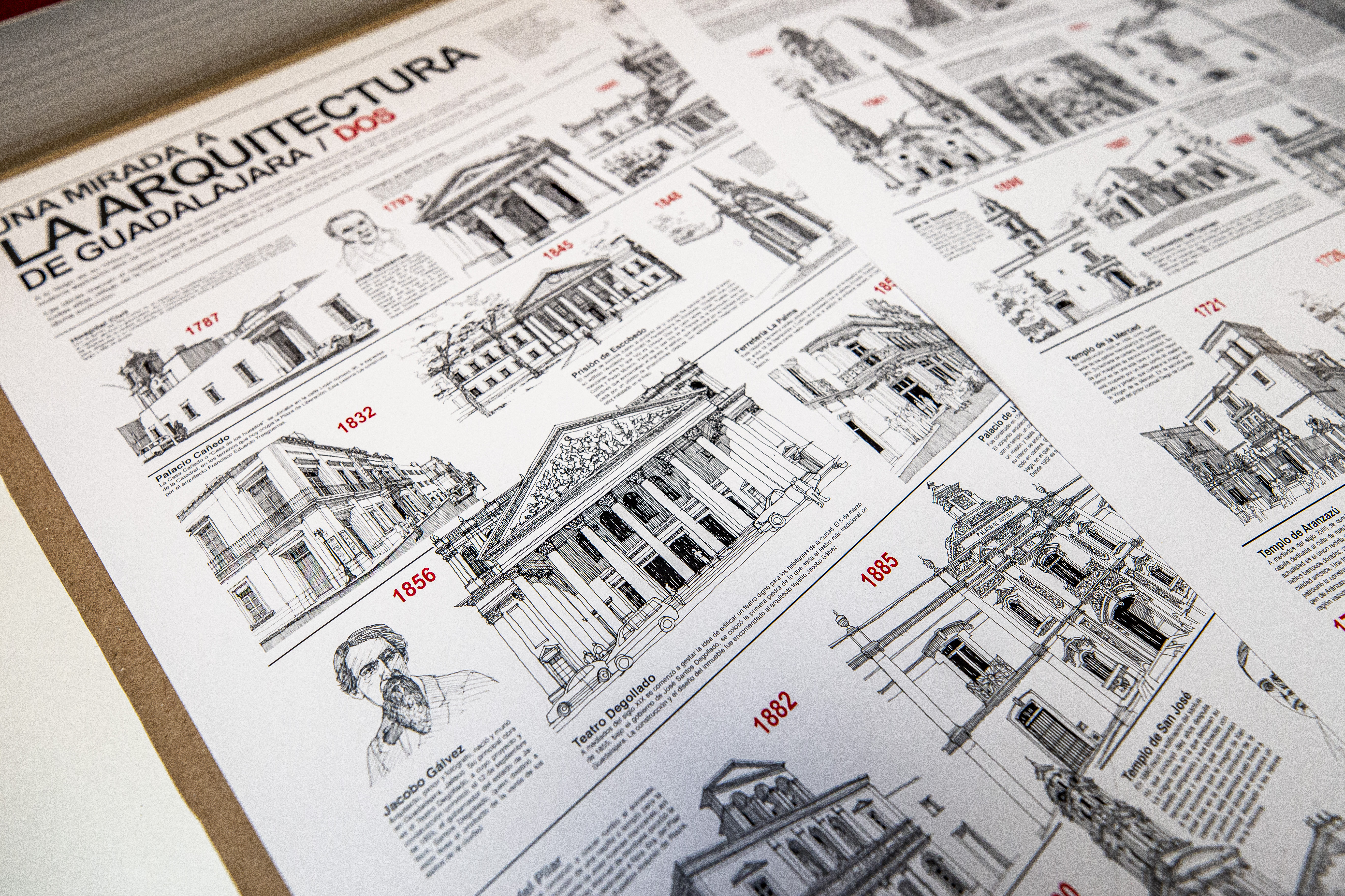 Se trata de obras gráficas, correspondientes a poco más de 100 edificaciones que destacan por dotar de identidad arquitectónica y urbana, y que están contenidas en los carteles infográficos titulados Una mirada a la arquitectura de Guadalajara.