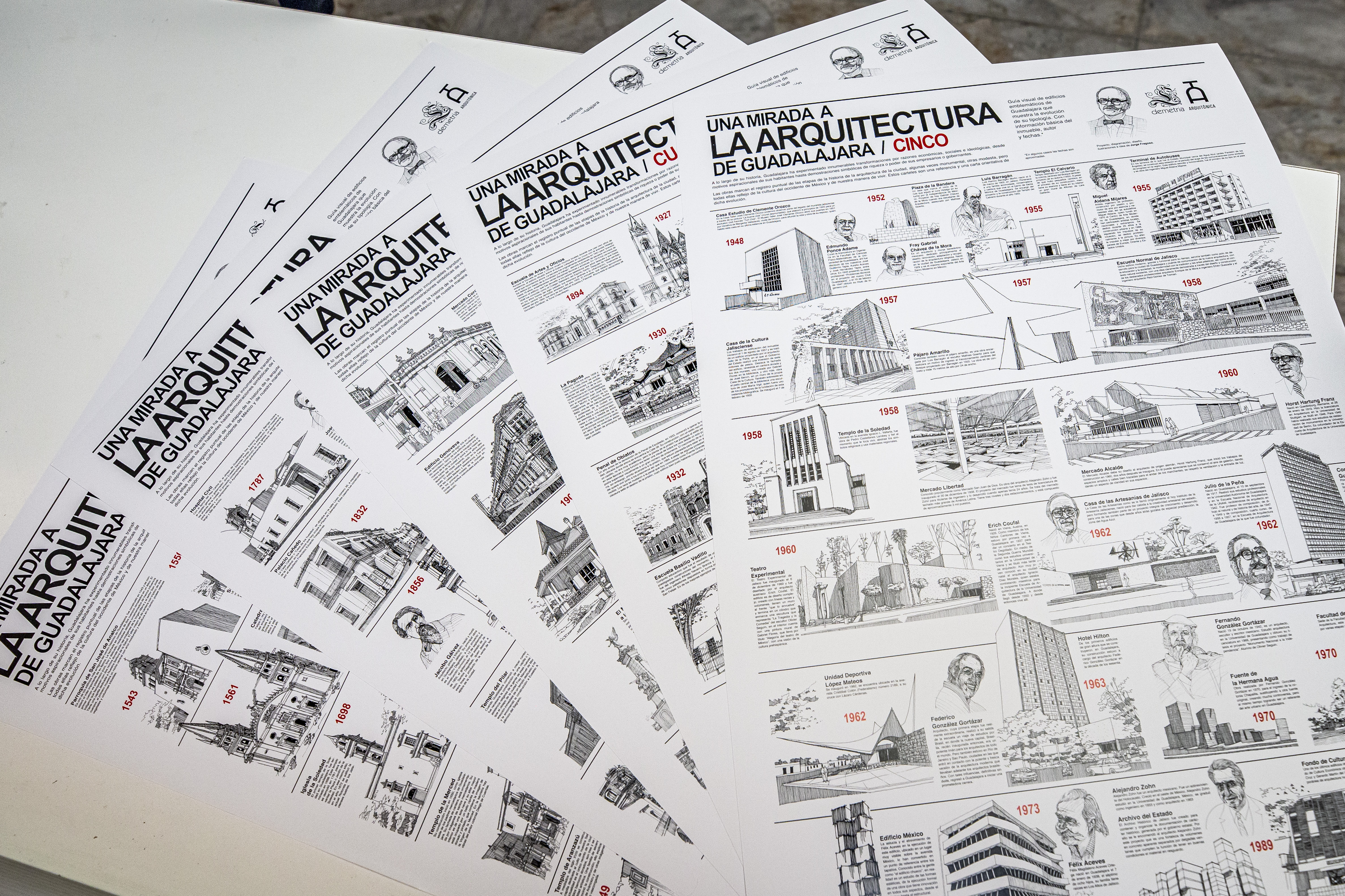 La carpeta de los cinco carteles Una mirada a la arquitectura de Guadalajara fue editada por Arquitónica y Demetria; los interesados pueden adquirirla en el domicilio de la editorial: calle Eclipse 2685, casi esquina con avenida de Los Arcos; en el hotel Demetria: avenida La Paz 2219; en la Escuela de Arquitectura y Artes (Esarq): calle Libertad 1975, y en la tienda Tamayo, en Plaza Patria.