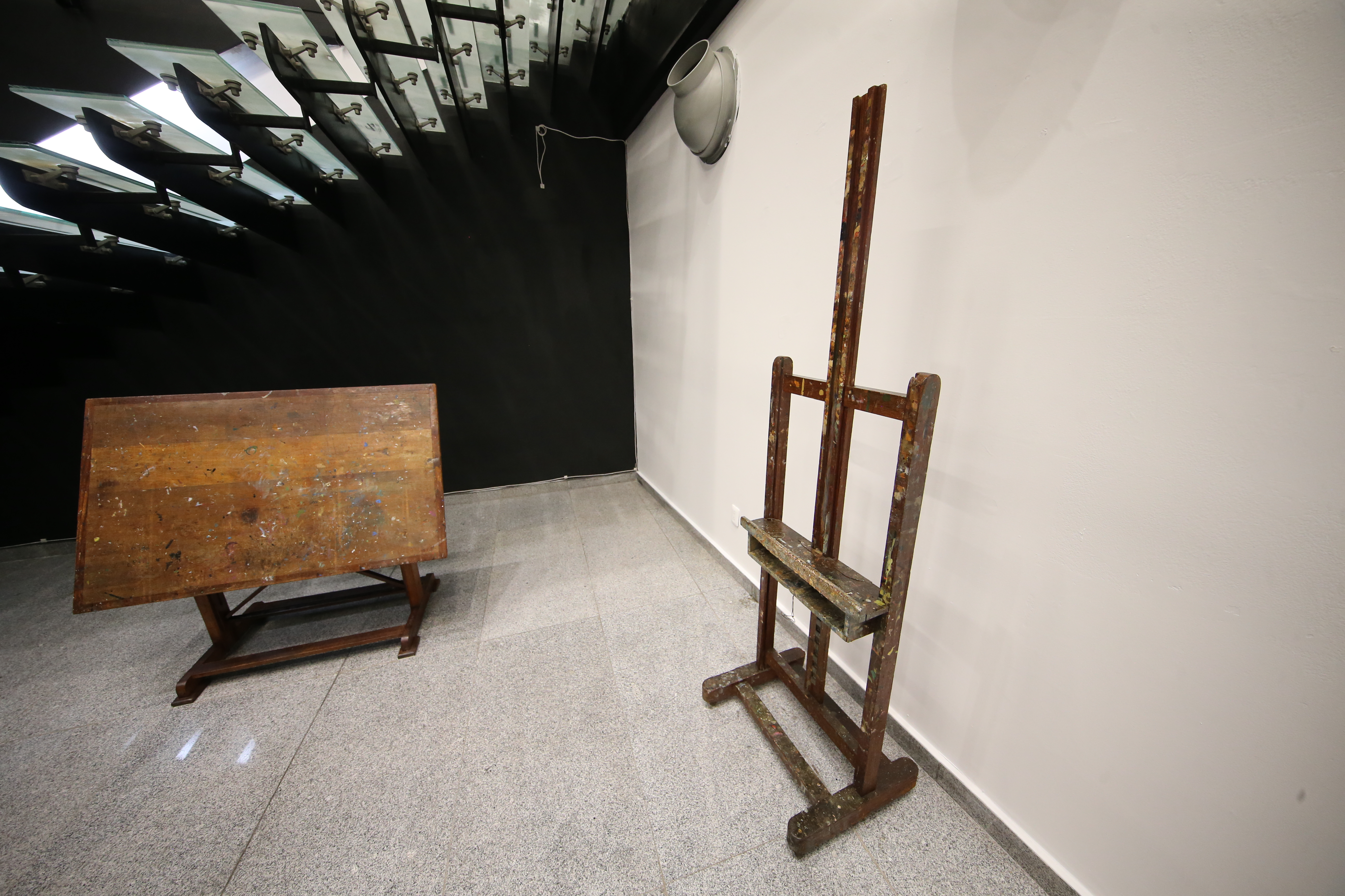 El caballete, la mesa de dibujar, la caja de carboncillos, una silla, un taburete y pinceles son algunos artículos de la exposición Sala, montada con los objetos del artista Jesús Guerrero Galván y que a partir de hoy estará expuesta en la galería que lleva su nombre en la Biblioteca Pública del Estado de Jalisco Juan José Arreola (BPEJ).