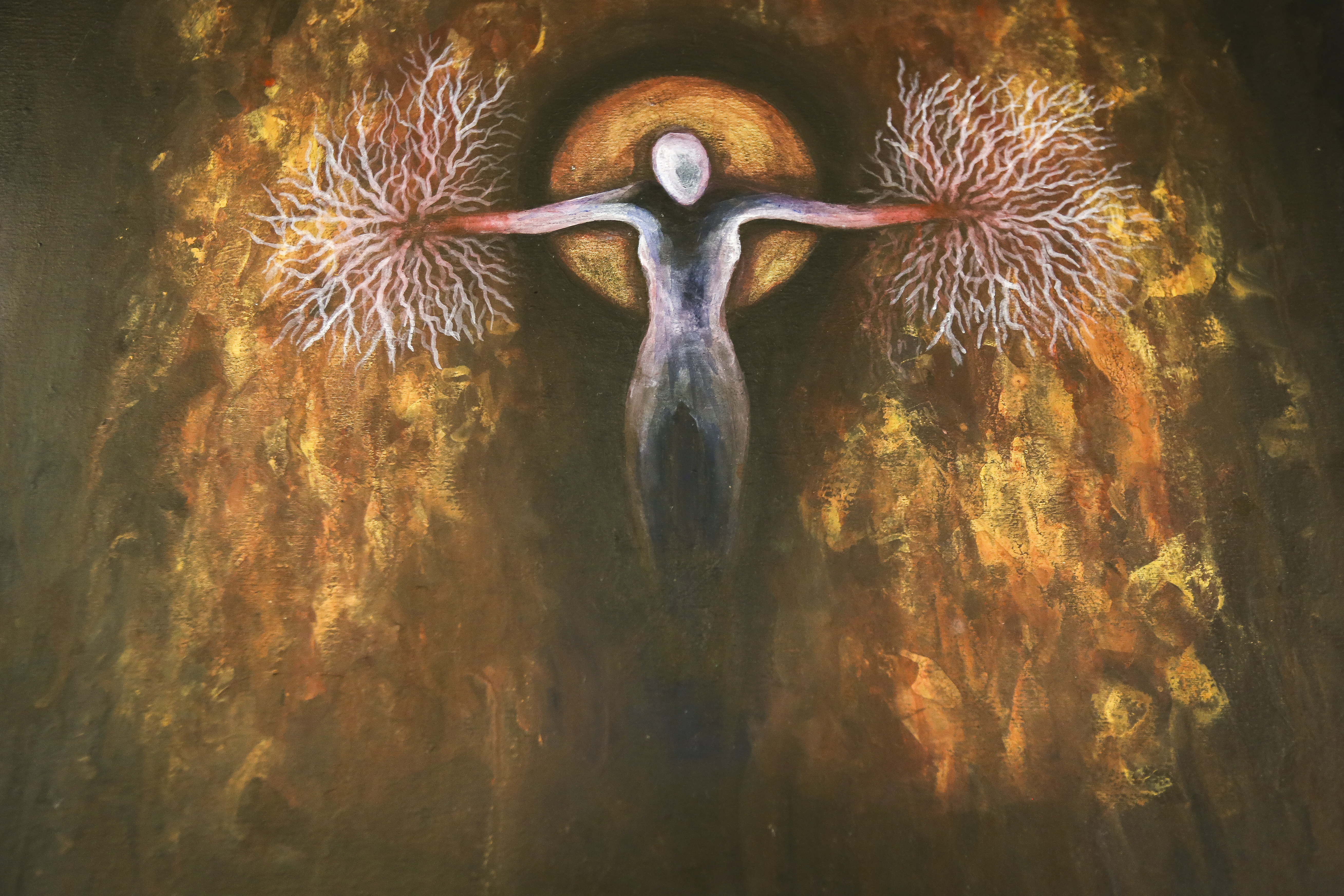 La egresada de la Preparatoria Vocacional, Nathaly Tury Dueñas Vargas, presentó un acrílico sobre tela titulado Non vender non sentir, donde explora los límites de la conciencia humana, lo que es vida y no es la vida.