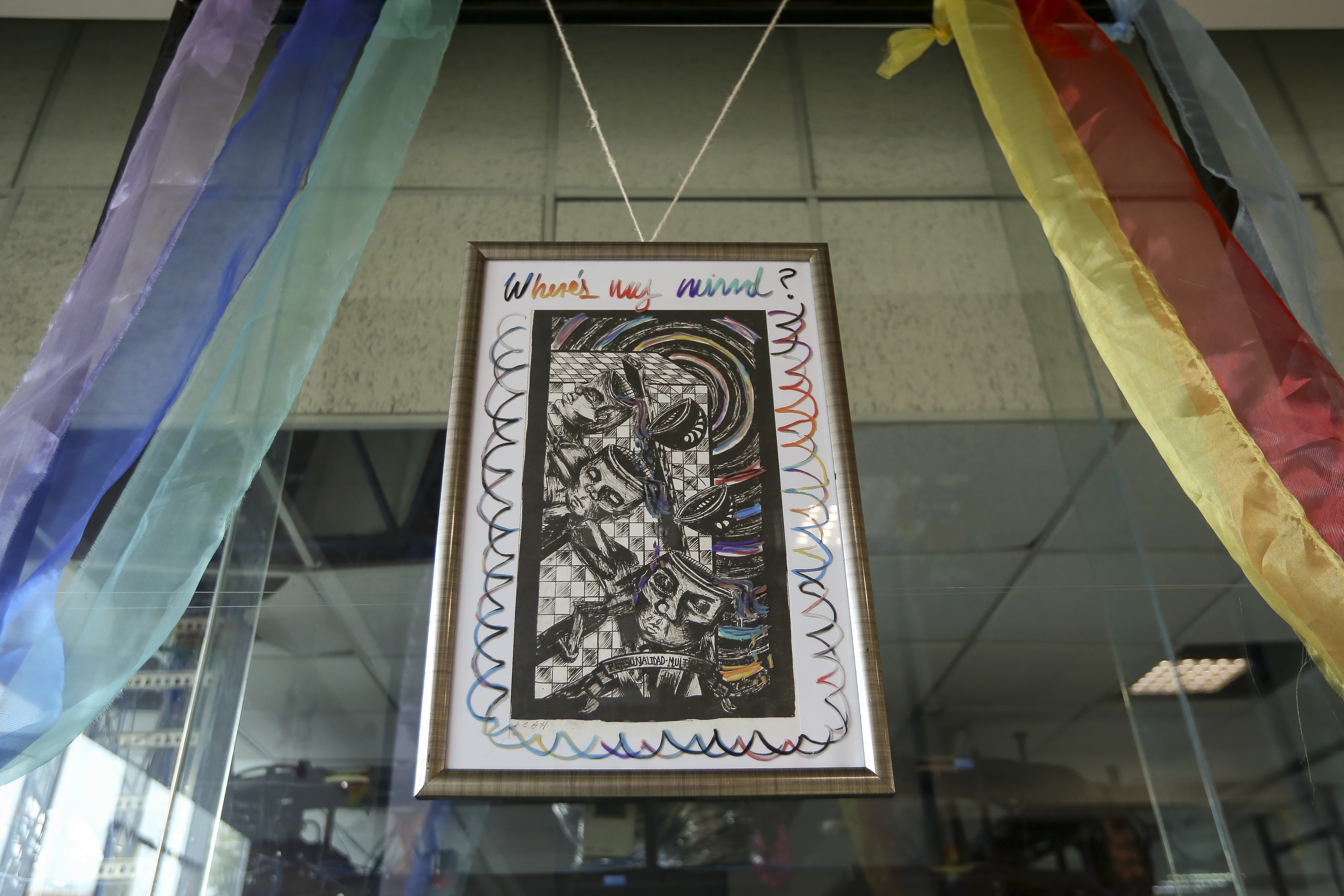 Elizabeth G. Herrera “TFK-26”, egresada de la Preparatoria 5 y estudiante del CUAAD, expuso la impresión cartográfica sobre papel algodón intervenida con crayón industrial denominada Personalidad múltiple.