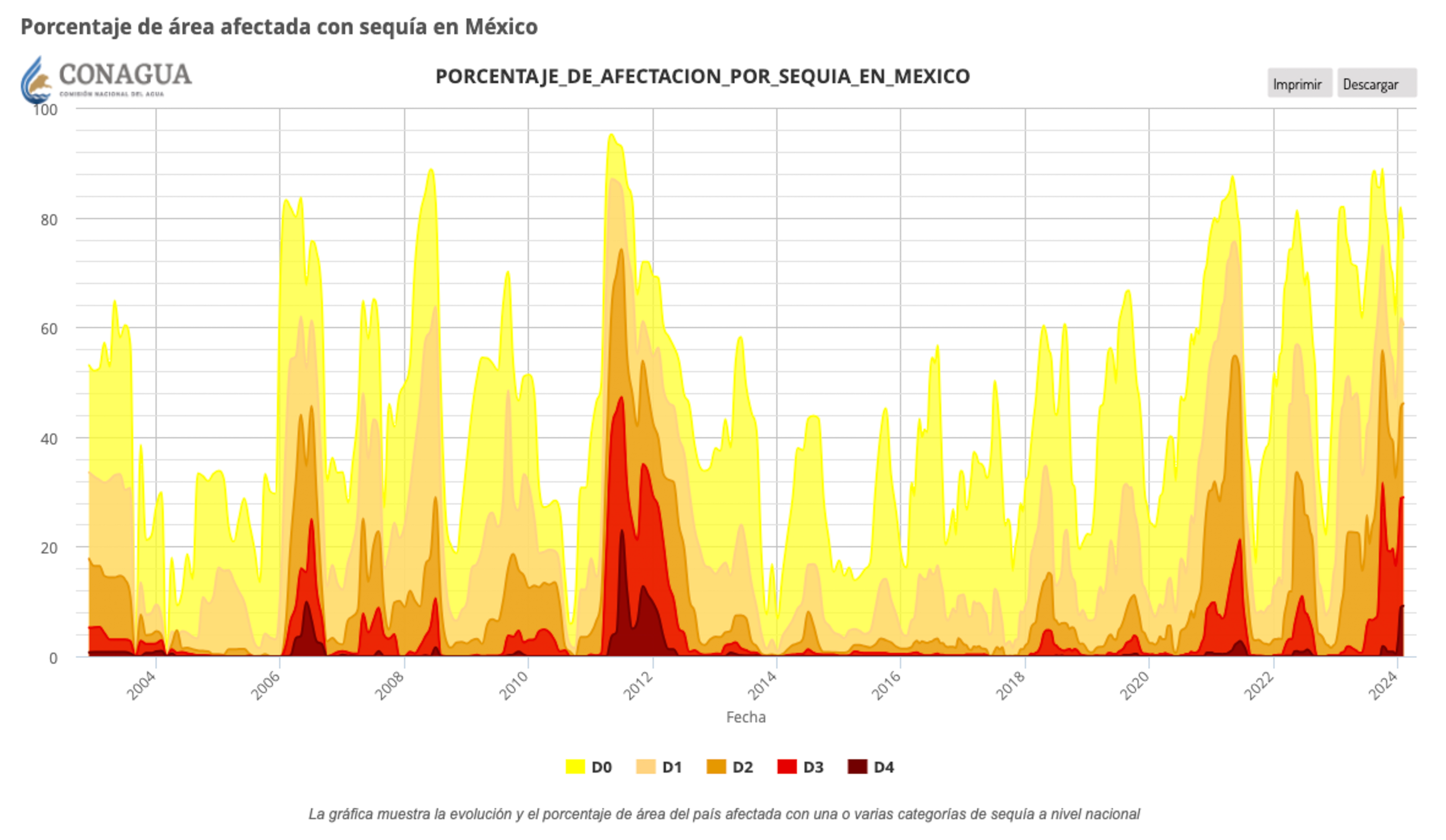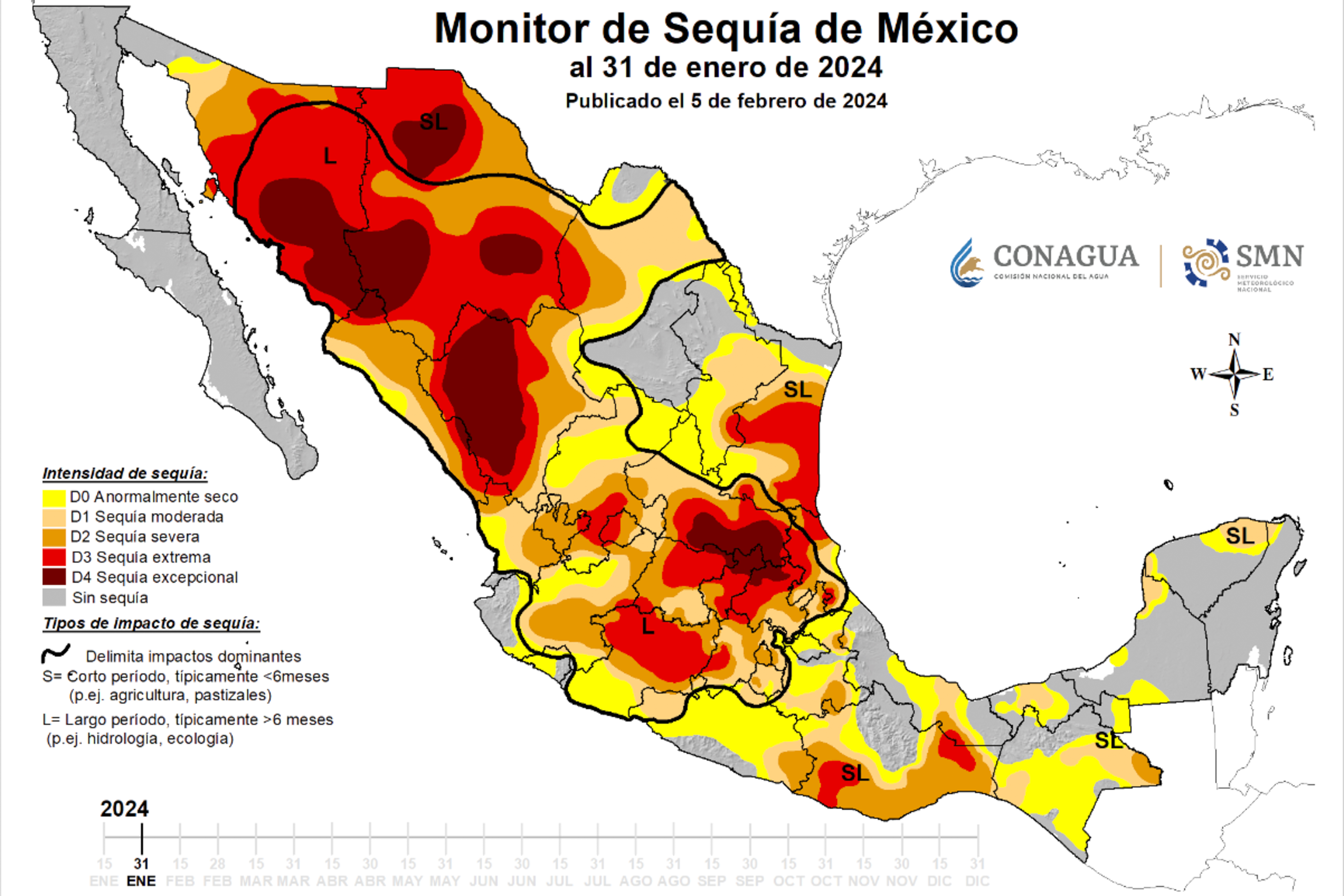 En el mapa del Monitor de Sequía de Conagua, publicado el 5 de febrero, se muestra cómo México atraviesa una crisis en diversas entidades. En éste se visualiza cómo varias zonas de Jalisco se encuentran en etapas que van desde anormalmente seco hasta la sequía extrema.