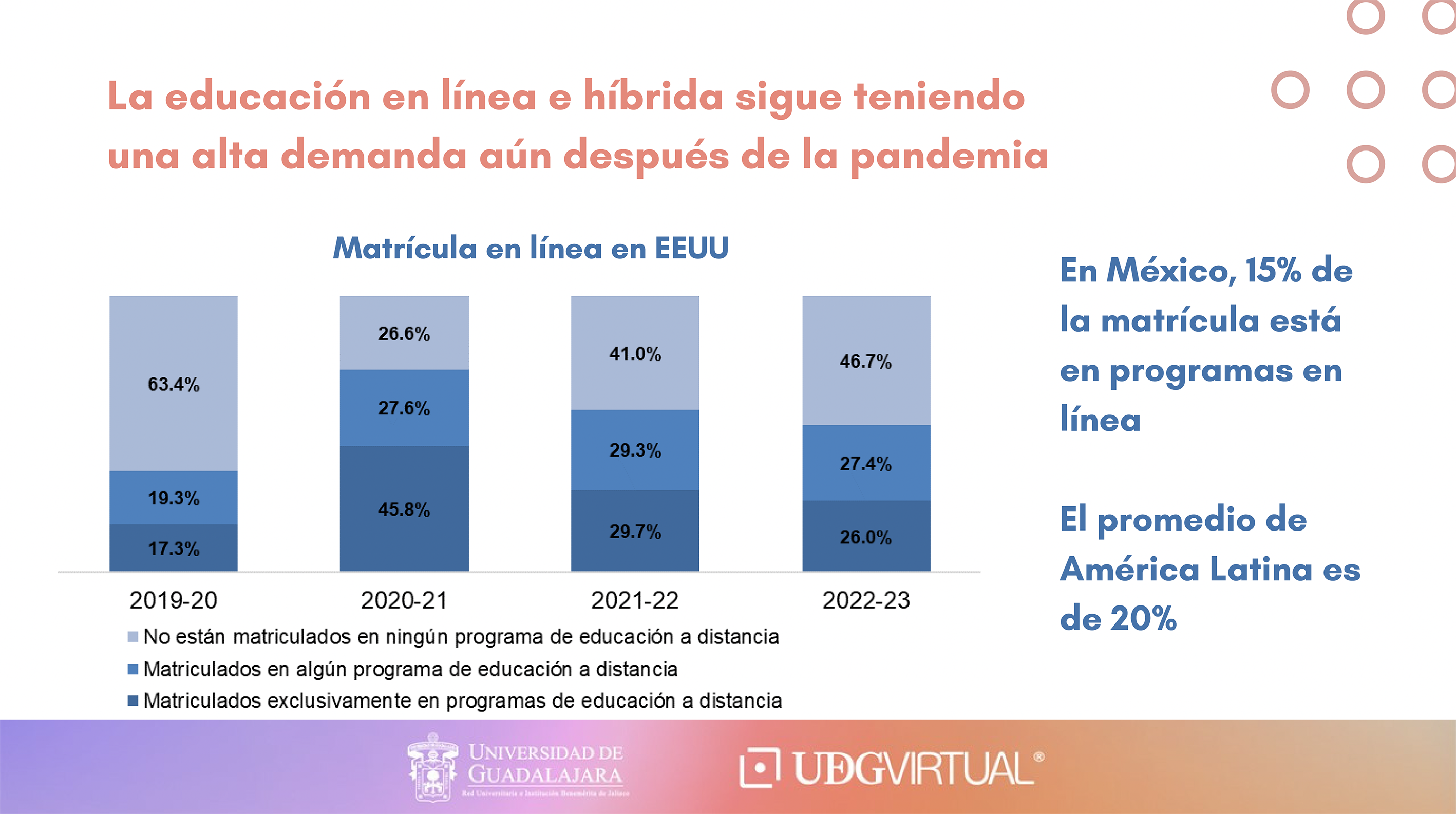 “Esto es muy importante porque es un imperativo de trasformación digital que tiene mucho potencial en nuestro país y América Latina para incrementar las oportunidades educativas. En México, 15 por ciento de la matrícula está en programas en línea, pero seguimos por abajo del promedio de América Latina, que es de 20 por ciento”, informó.