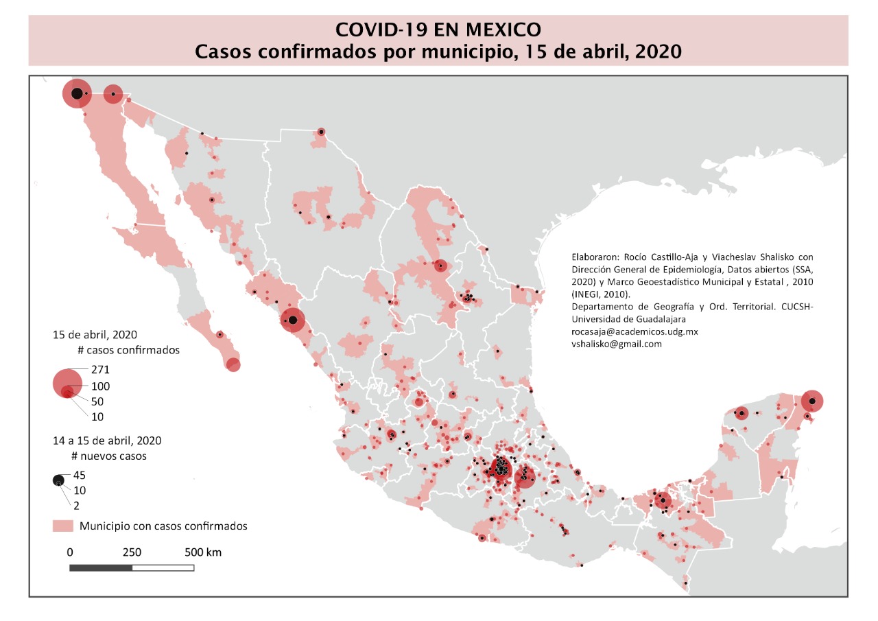 La doctora Rocio Castillo-Aja y el doctor Viashevslav Shalisko, profesores de los centros universitarios de Ciencias Sociales y Humanidades (CUCSH), de Ciencias Biológicas y Agropecuarias (CUCBA), respetivamente, elaboraron un mapa con un Sistema de Información Geográfica que muestra el patrón de distribución de los casos confirmados de Covid-19, la cantidad de casos (en puntos rojos) y el incremento de casos entre el día 14 y 15 de abril (puntos negros) por municipio en todo el país.