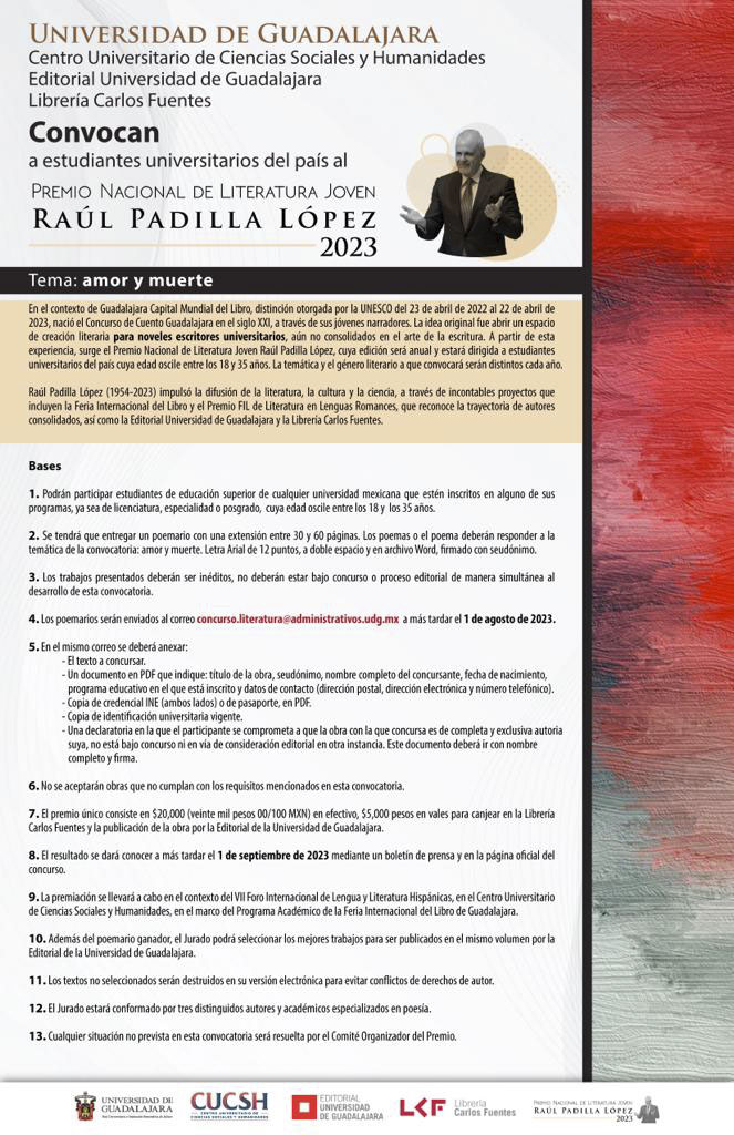 El premio constará de un monto económico de 20 mil pesos y un vale de 5 mil para canjear en la Librería Carlos Fuentes, así como la publicación de la obra en un libro editado por la Editorial Universitaria, que también incluirá los mejores textos que concursaron. Por lo pronto, las bases del Premio Nacional de Literatura Joven Raúl Padilla López se pueden conocer en las redes sociales del CUCSH.