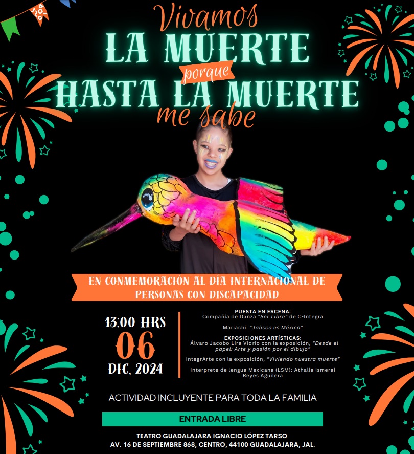 La Unidad de Inclusión de la Universidad de Guadalajara, en conjunto con el Centro Universitario de Arte, Arquitectura y Diseño (CUAAD), asociaciones como el Taller Incluyente para la Capacidad Intelectual, C-Integra, Impulso Trans AC y la casa productora Techos de Cristal AC, invitaron a toda la comunidad a la puesta en escena y exposición plástica Vivamos la muerte porque hasta la muerte me sabe, en conmemoración del Día Internacional de Personas con Discapacidad, que se celebra el próximo 3 de diciembre.
