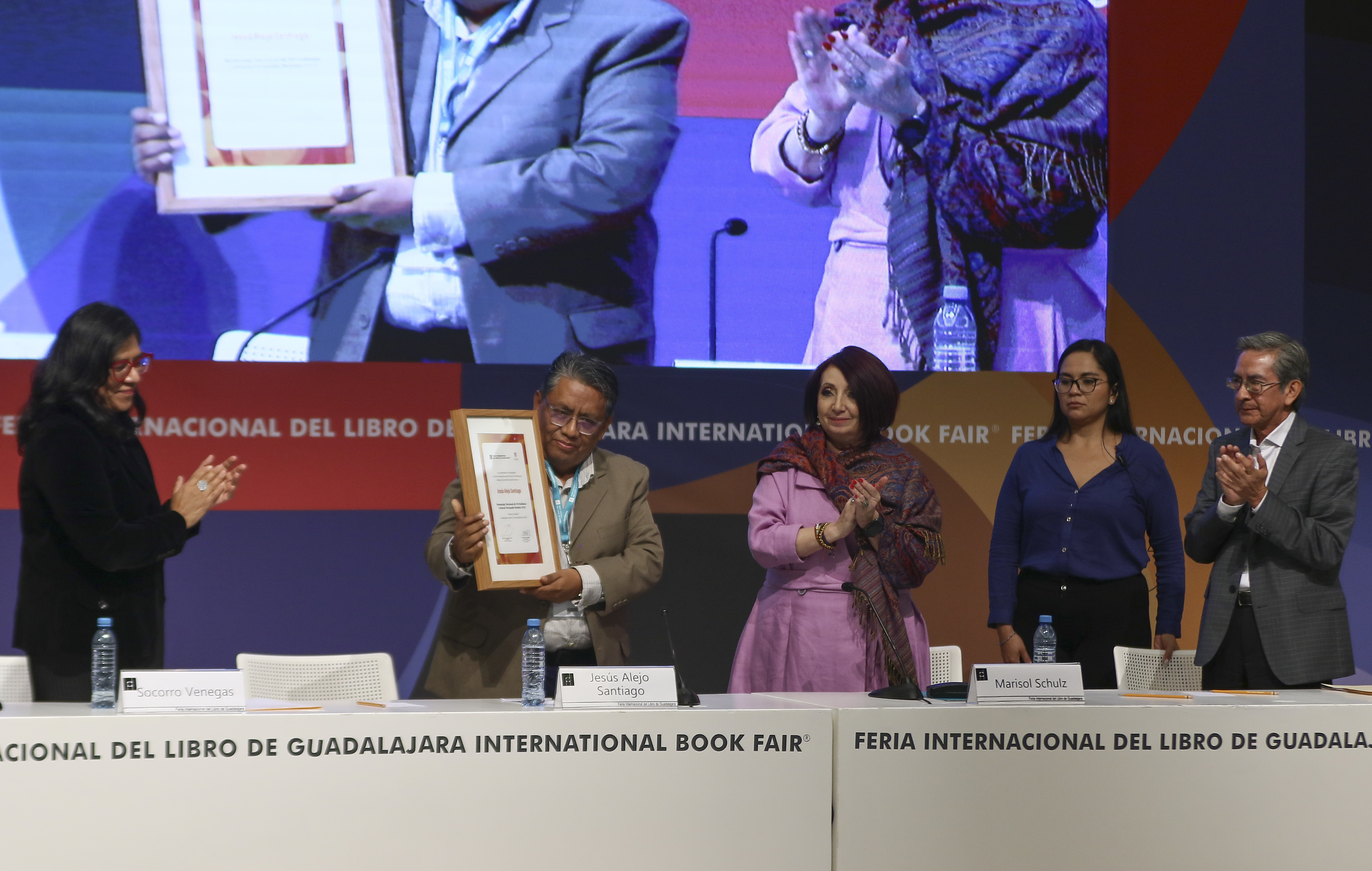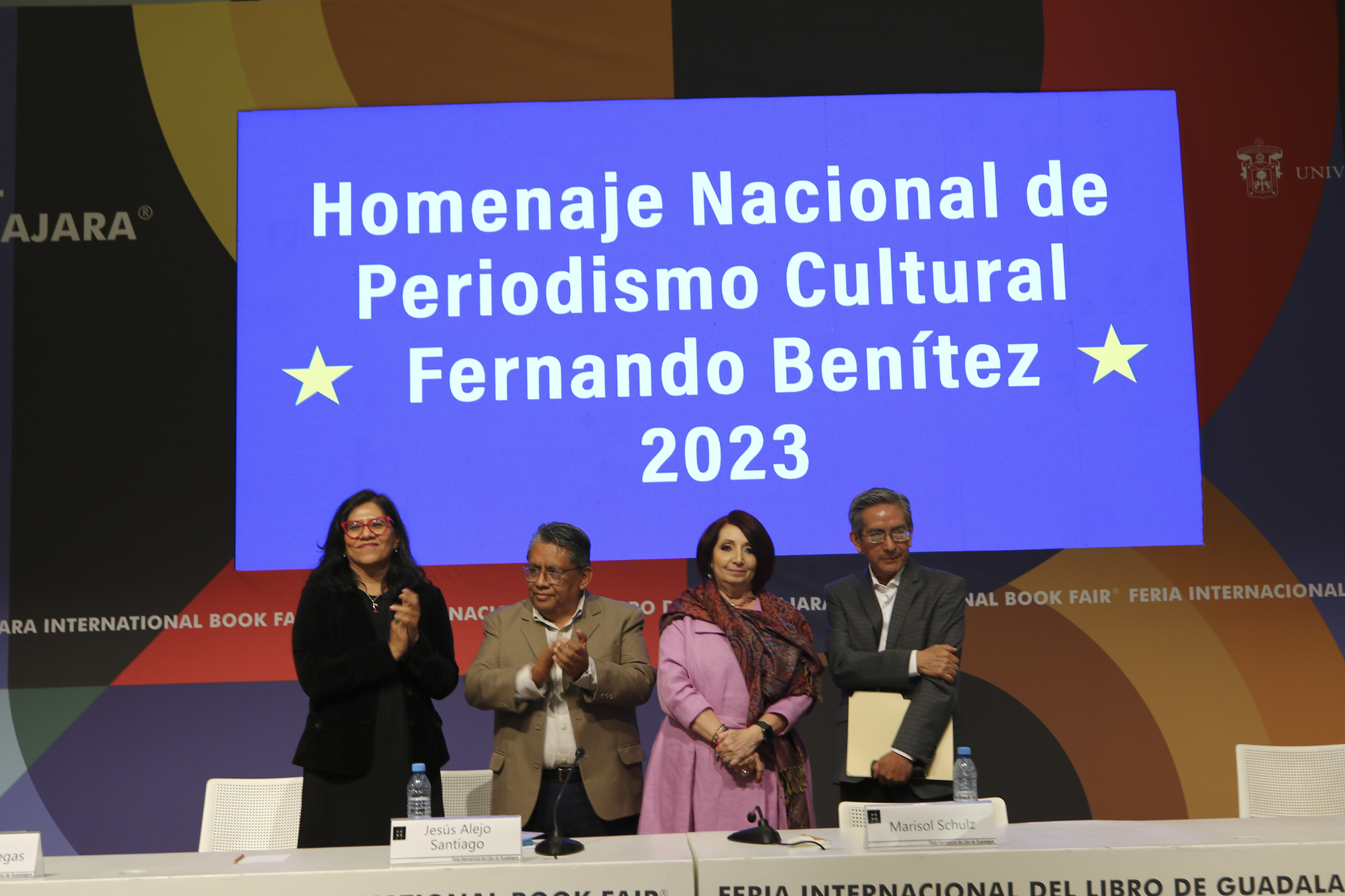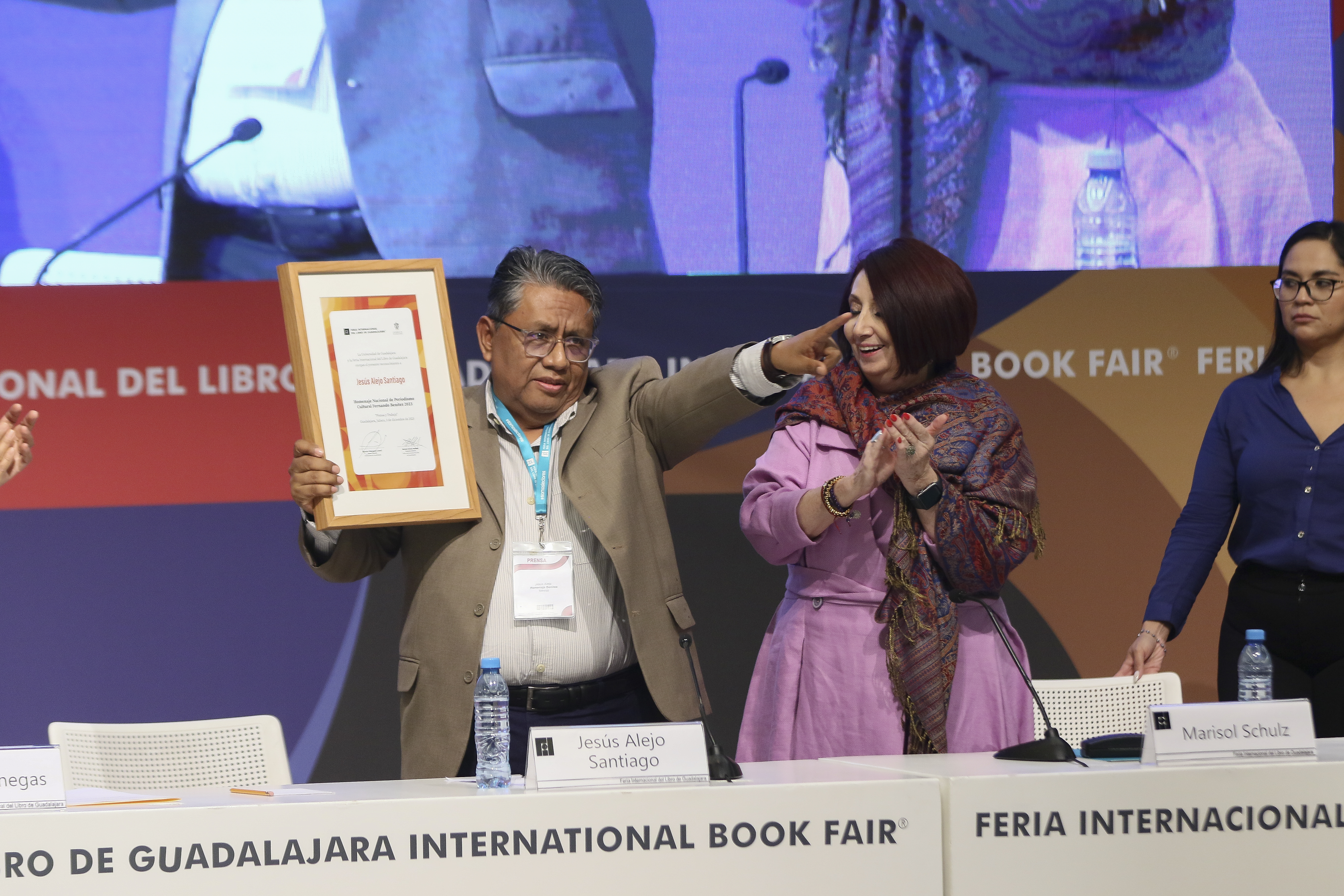 El periodista cultural Jesús Alejo Santiago recibió el Homenaje Nacional de Periodismo Cultural Fernando Benítez de manos de la Directora de la Feria Internacional del Libro de Guadalajara (FIL) y Presidenta en funciones, Marisol Schulz Manaut, como un reconocimiento a su trayectoria en los medios de comunicación públicos de México.