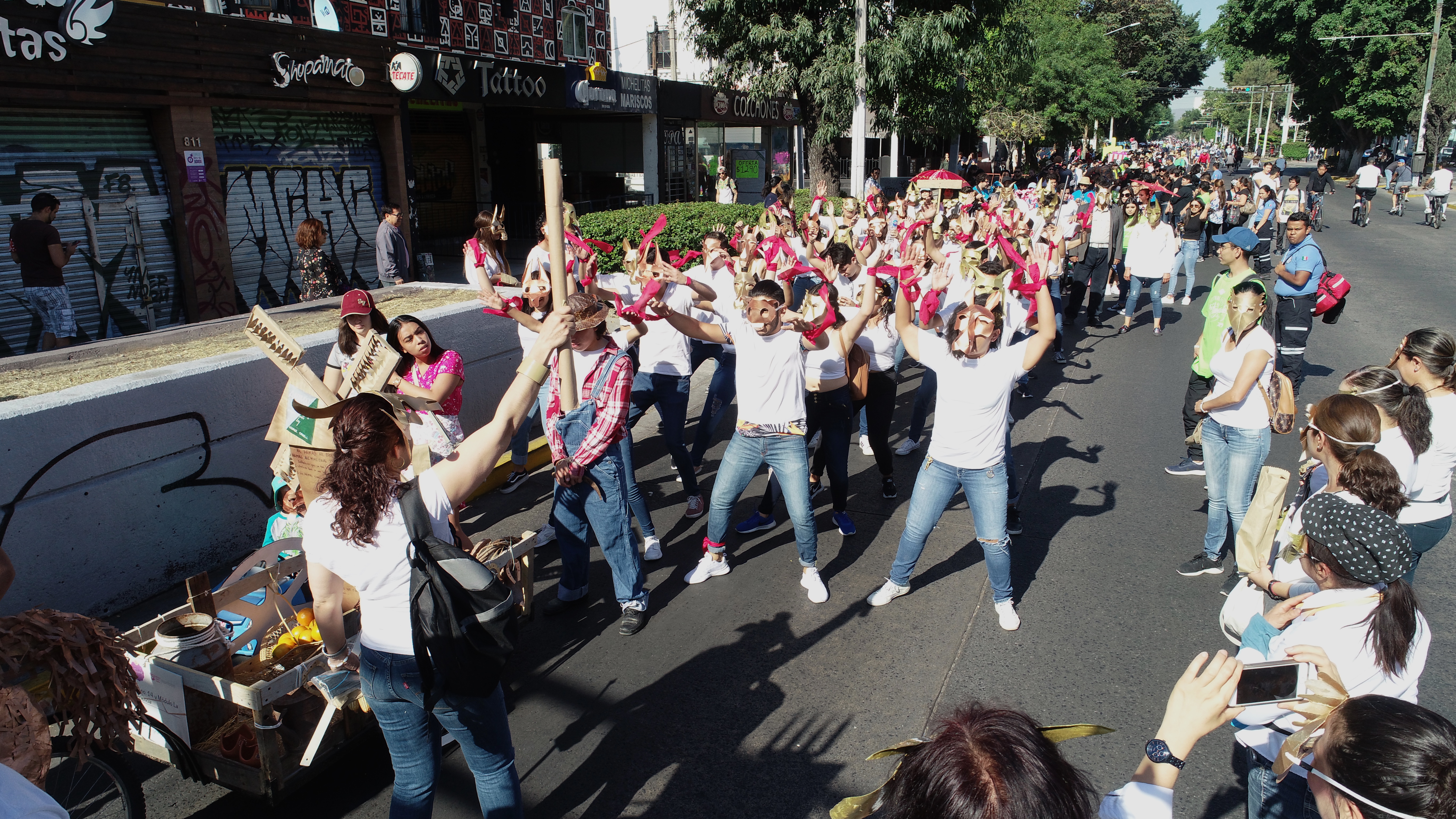 El desfile abrió con una batucada “galáctica” acompañada de zanqueros caracterizados con diversos personajes y malabaristas que pusieron el ambiente y atraían la atención de los asistentes a la Vía Recreativa, así como a quienes transitaban por la avenida Juárez y el centro histórico de Guadalajara.