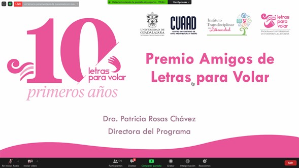 Se realizó la presentación de un video por la celebración del décimo aniversario del Programa Universitario de Fomento a la Lectura “Letras para Volar”, que nació en 2010 y que ha logrado la atención de 364 mil 830 lectores, la participación de dos mil 715 promotores de lectura, la publicación de 776 mil 540 libros impresos y 55 mil en proceso de impresión (de 134 títulos, dentro de las colecciones literarias del programa); además, la impresión y distribución de más de dos millones de Gacetitas.