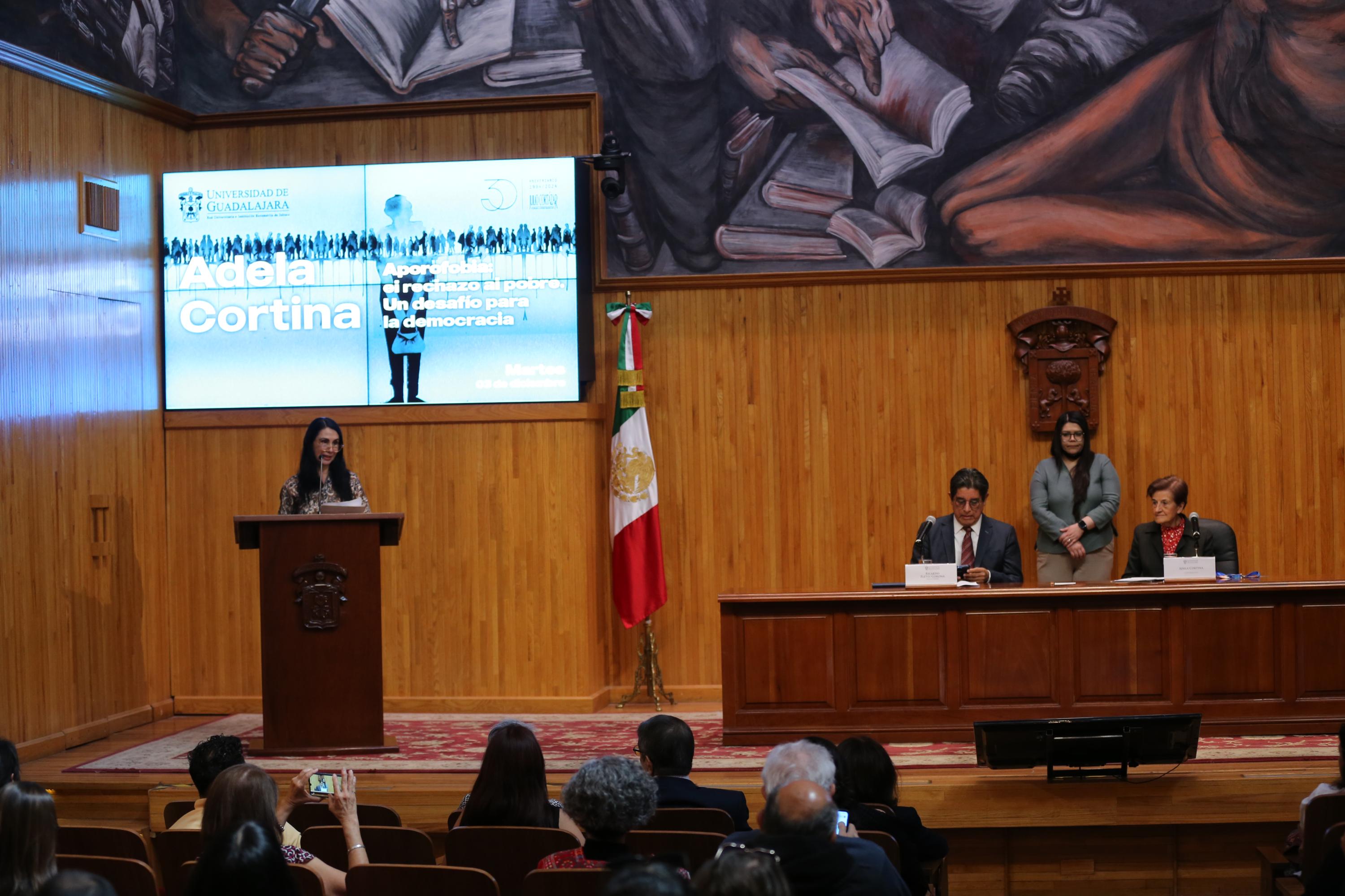 Como parte de las actividades de la 38 Feria Internacional del Libro de Guadalajara (FIL), la académica presentó en el Paraninfo Enrique Díaz de León la charla “Aporofobia, el rechazo al pobre. Un desafío para la democracia”.
