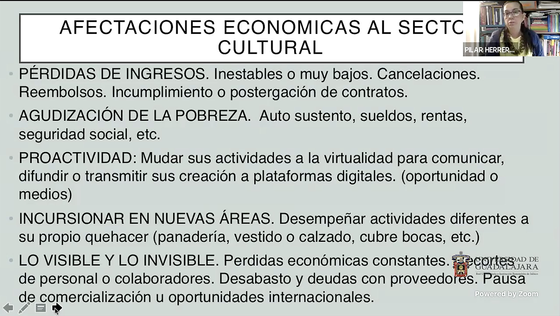 La doctora Pilar Herrera Guevara, académica miembro del Seminario de Cultura Mexicana en Guadalajara, señaló que las medidas sanitarias y el aislamiento dictado hace un año visibilizaron las condiciones de precariedad de los artistas, técnicos y agentes culturales y creativos, debido a que de manera sistemática ha sido considerado como un sector no fundamental en la vida cotidiana.