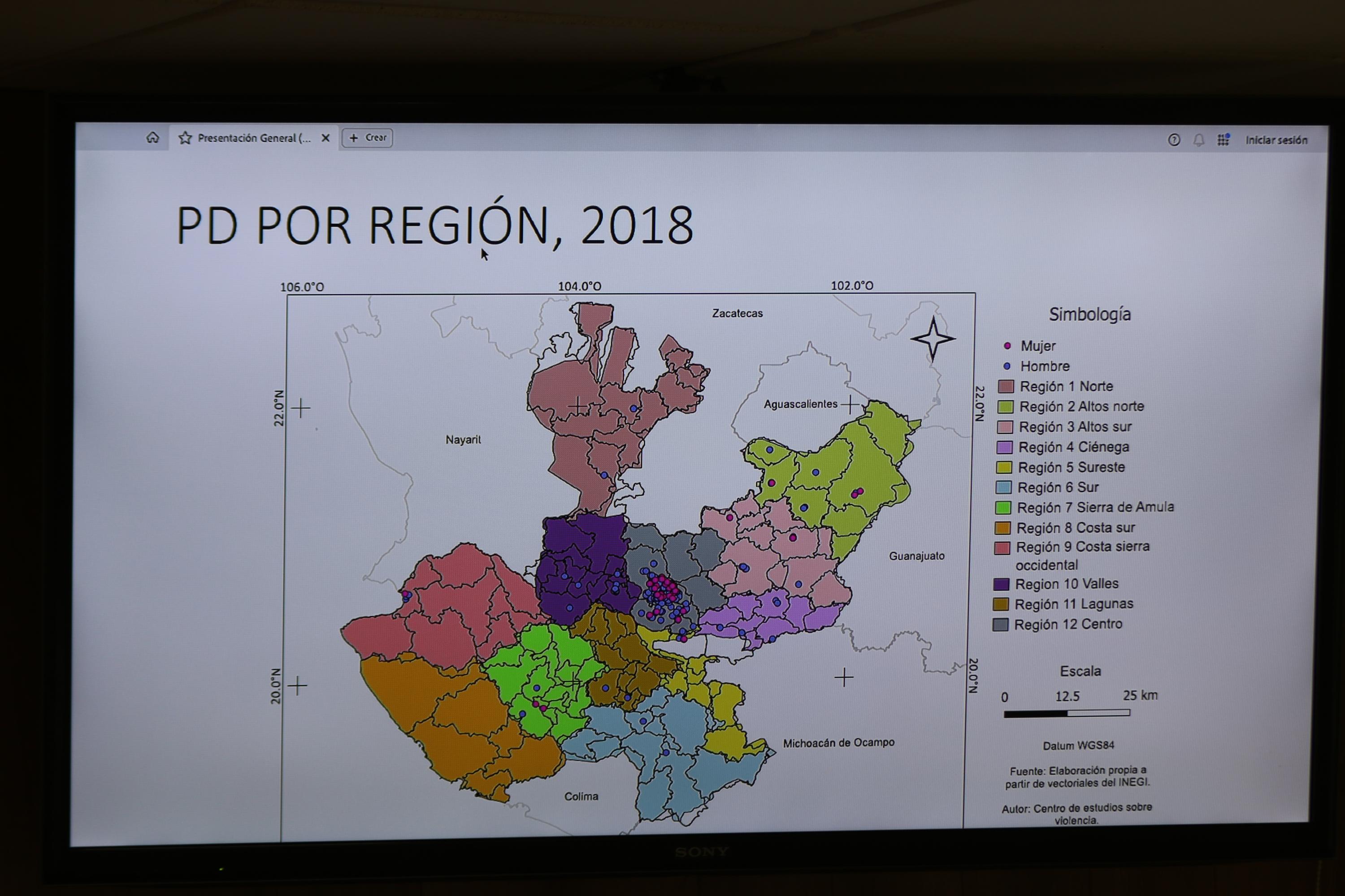 La licenciada Mariel Quezada Duarte, del Departamento de Geografía y Ordenación Territorial del CUCSH, informó que la región Centro es la que más incidencias de desaparición registra, entre otros nodos de desaparición en Jalisco.