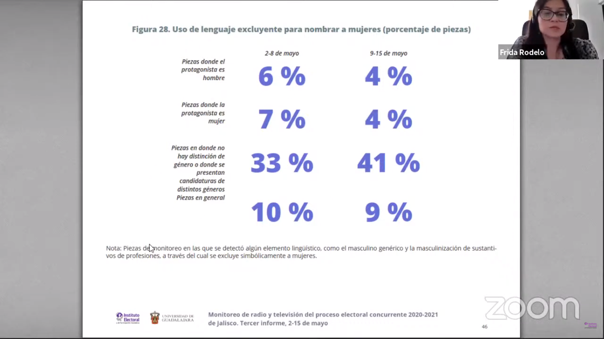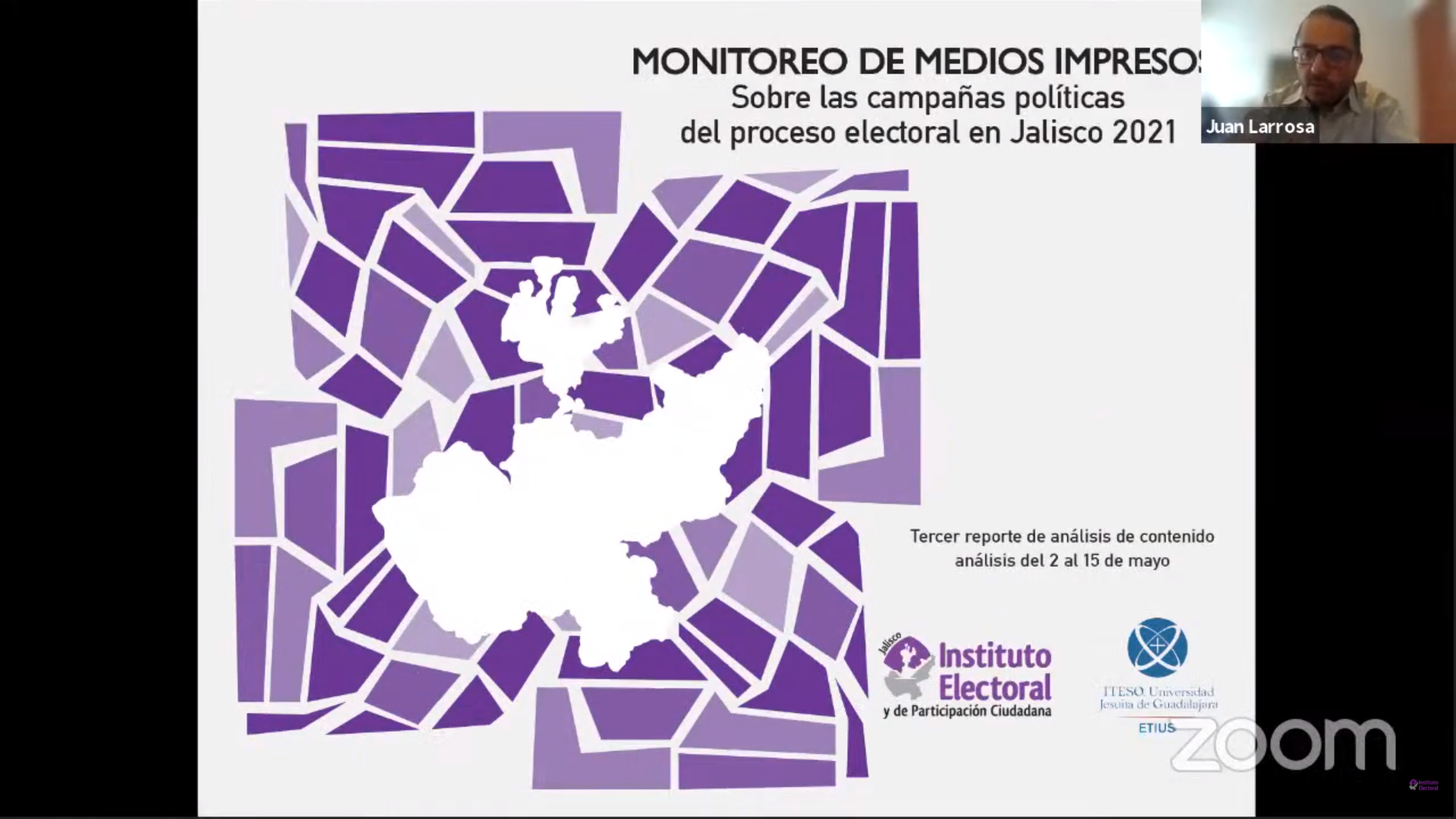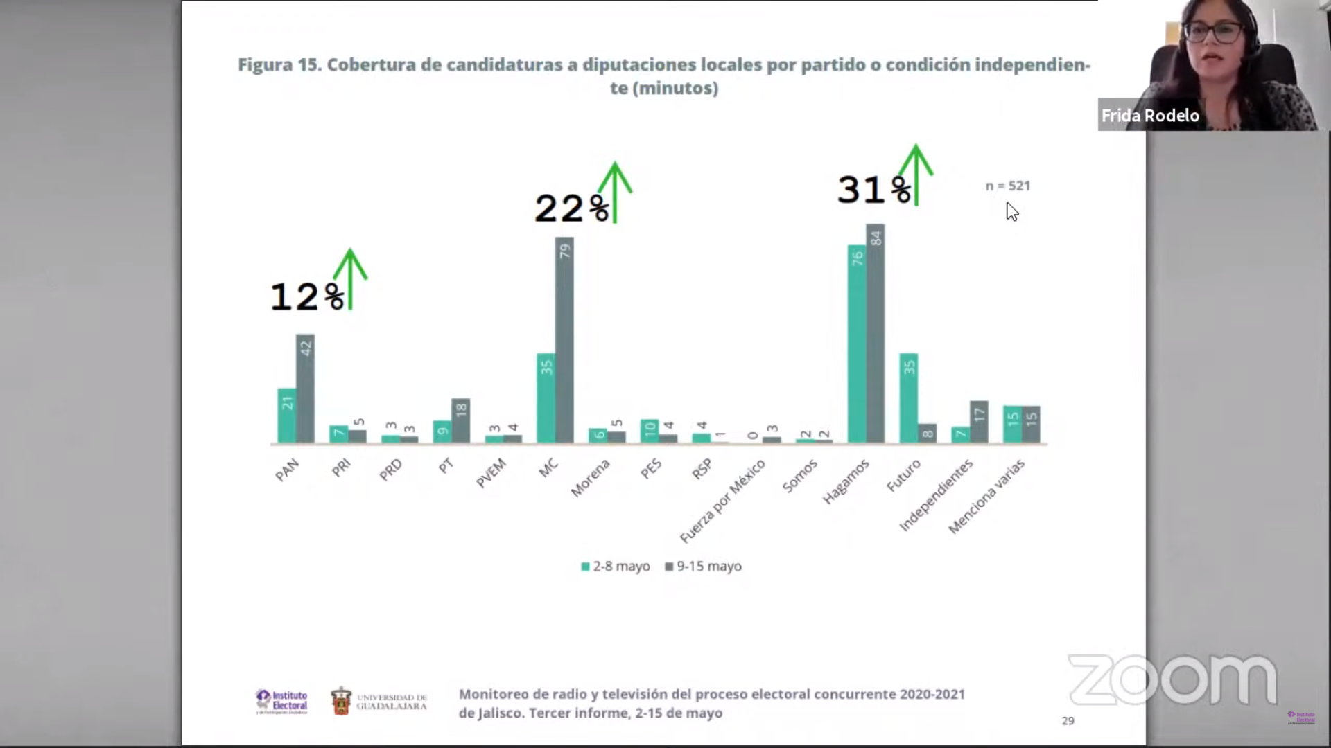 Estos datos fueron revelados por el tercer informe parcial del Monitoreo de radio y televisión del proceso electoral concurrente 2021-2021 de Jalisco, realizado por la Universidad de Guadalajara y correspondiente al periodo del 2 al 15 de mayo, realizado por encargo del Instituto Electoral y de Participación Ciudadana del Estado de Jalisco (IEPC).