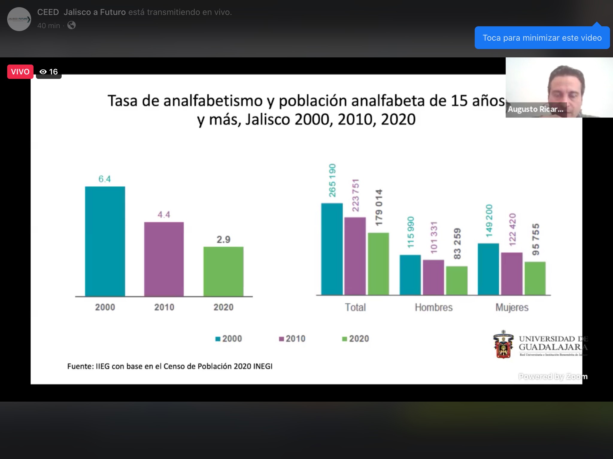 El integrante del cuerpo de investigación de Estructura, Movilidad, Capital Social y Desigualdad, se refirió a la tasa de analfabetismo en Jalisco, que es mayor en personas mayores a 75 años, con 18.7 por ciento de esa población, lo cual contrasta con la de 15 a 29 años, donde solamente 0.8 por ciento no sabe leer o escribir. El grado promedio de escolaridad de la población de 15 años y más aumentó de 7.5 en el año 2000, al 9.9 por ciento en 2020.