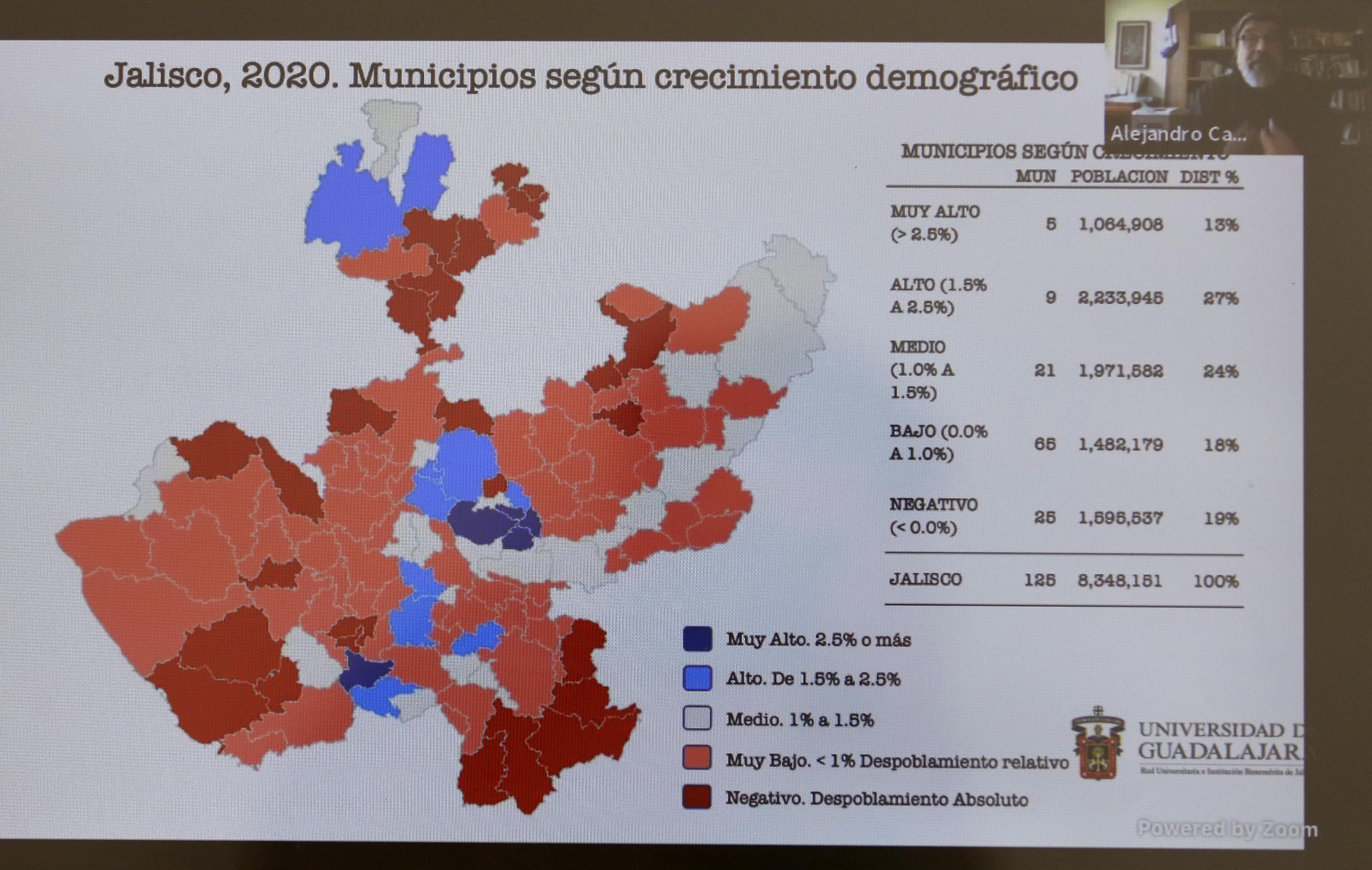 “Hay un aumento de 750 mil nuevos habitantes en el Área Metropolitana de Guadalajara; sin embargo, no todos los municipios se comportaron igual: Guadalajara, hoy con un millón 385 mil habitantes fue perdiendo población sistemáticamente en las últimas tres décadas; en concreto, entre 2010 y 2020 perdió a alrededor de 110 mil habitantes; y aparecen otras tendencias como la de Zapopan, que pasa a ser el municipio más populoso del AMG, al contabilizar casi un millón 476 mil habitantes, con un incremento de 270 mil habitantes. El caso importante no es tanto Zapopan, que ya tenía esa tendencia, sino Tlajomulco, con un crecimiento explosivo en 310 mil personas en diez años, y aporta 42 por ciento del crecimiento de toda el AMG; me refiero de los nuevos habitantes”, informó.
