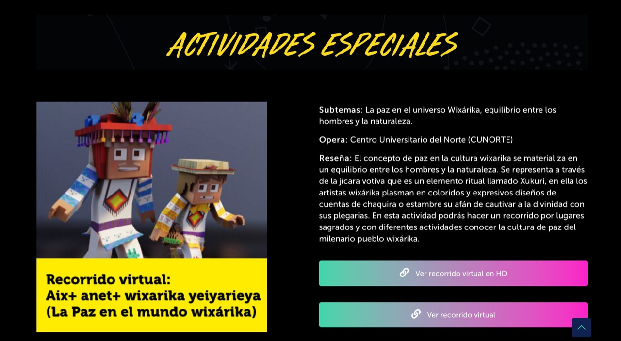 El recorrido virtual Aix+ anet+ wixarika yeiyarieya (La paz en el mundo wixárika) y las actividades interactivas, podrán seguirse a través del siguiente enlace: https://papirolas.udg.mx/programa-2020/actividades-especiales/recorrido-virtual-aix-anet-wixarika-yeiyarieya-la-paz-en-el-mundo-wixarika/, del 11 al 15 de noviembre.