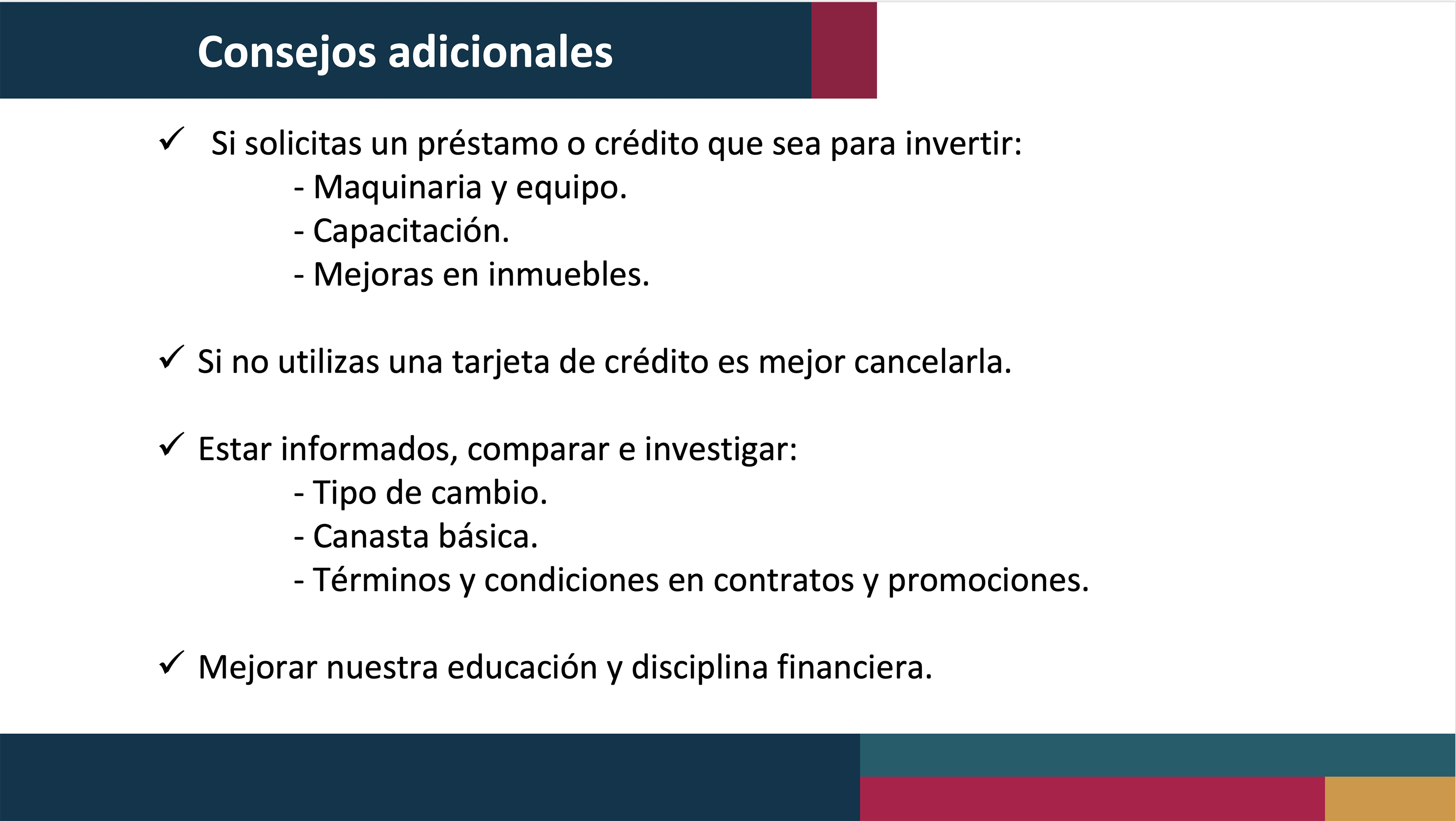 También recomendó presupuestar gastos e ingresos a lo largo del año, cambiar a bienes y productos más accesibles, usar responsablemente las tarjetas de crédito, liquidar deudas y evitar nuevos endeudamientos.