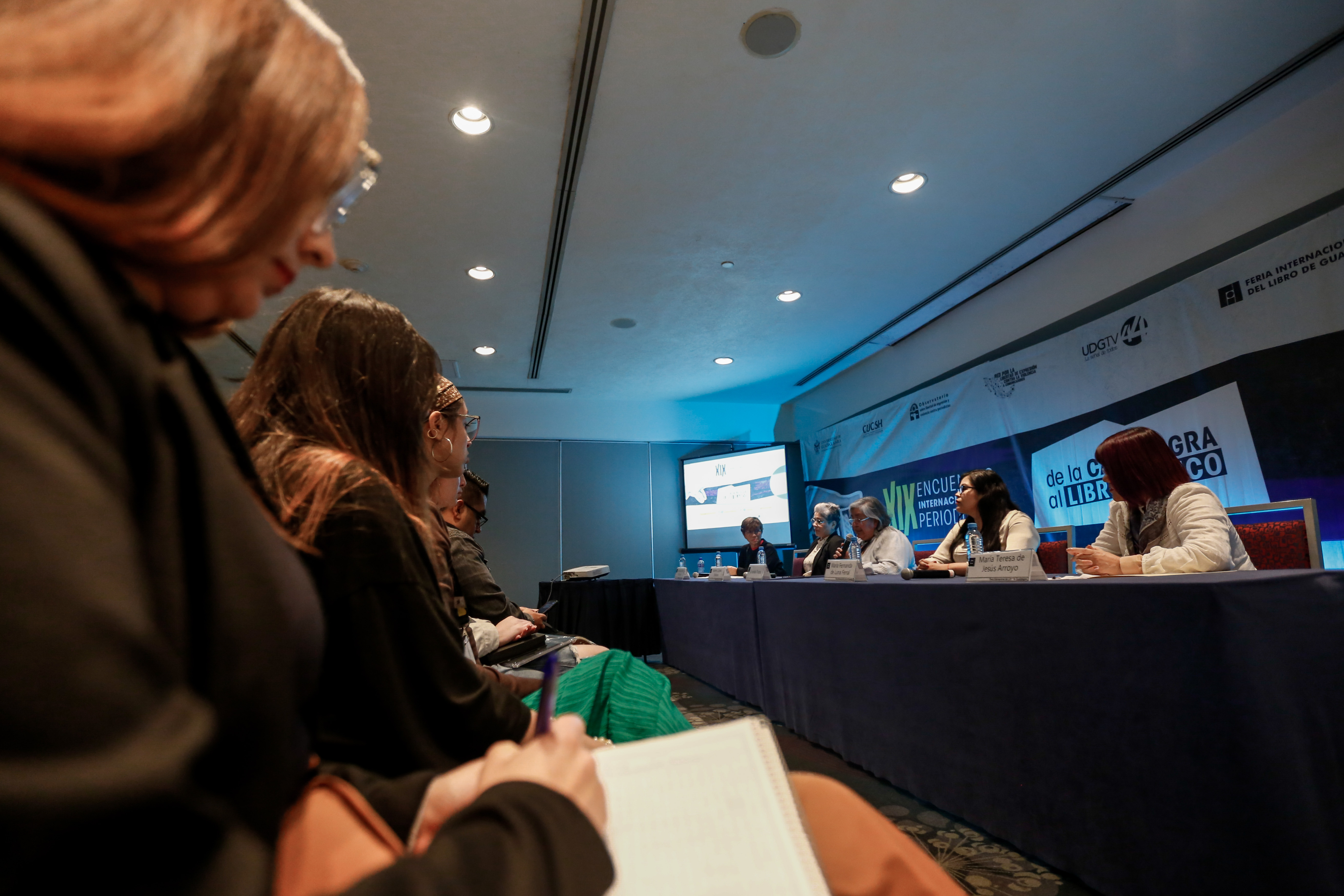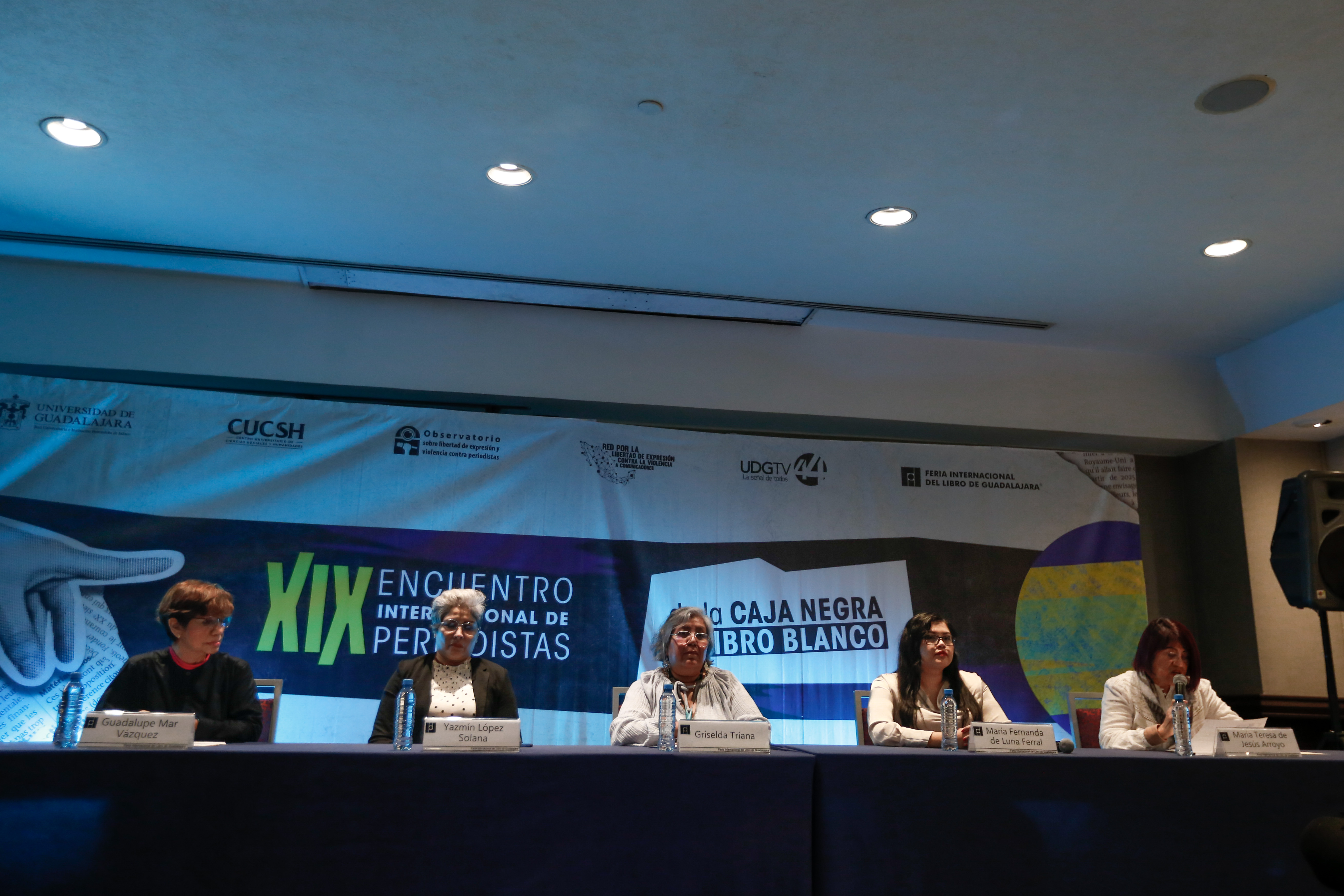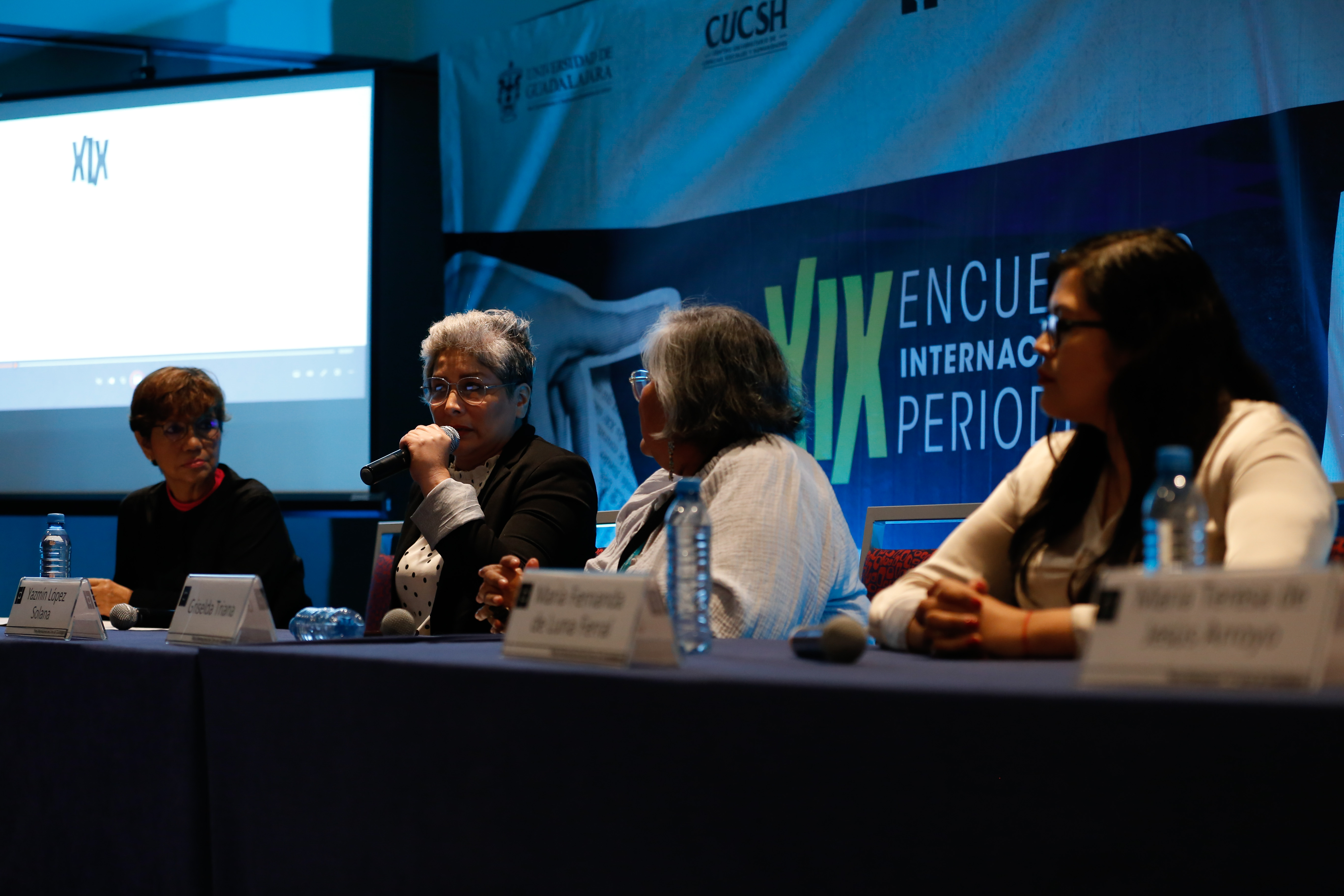 El panel estuvo moderado por las periodistas y académicas de la Universidad Veracruzana, Guadalupe Mar Vázquez y María Teresa de Jesús Arroyo Gopar.