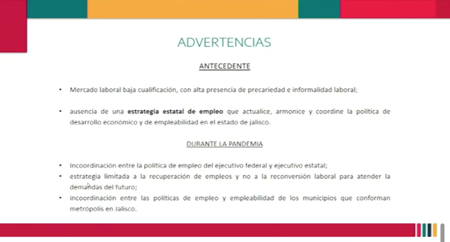 “Que desde el gobierno se cambie el chip del modelo de mercado laboral que es de baja cualificación. En Jalisco a menor nivel de estudios más posibilidad de incorporarse al mercado laboral formal, porque las plazas están hechas para la baja cualificación; esto nos obliga a pensar en una estrategia estatal del empleo que involucre a los actores principales”, expresó.