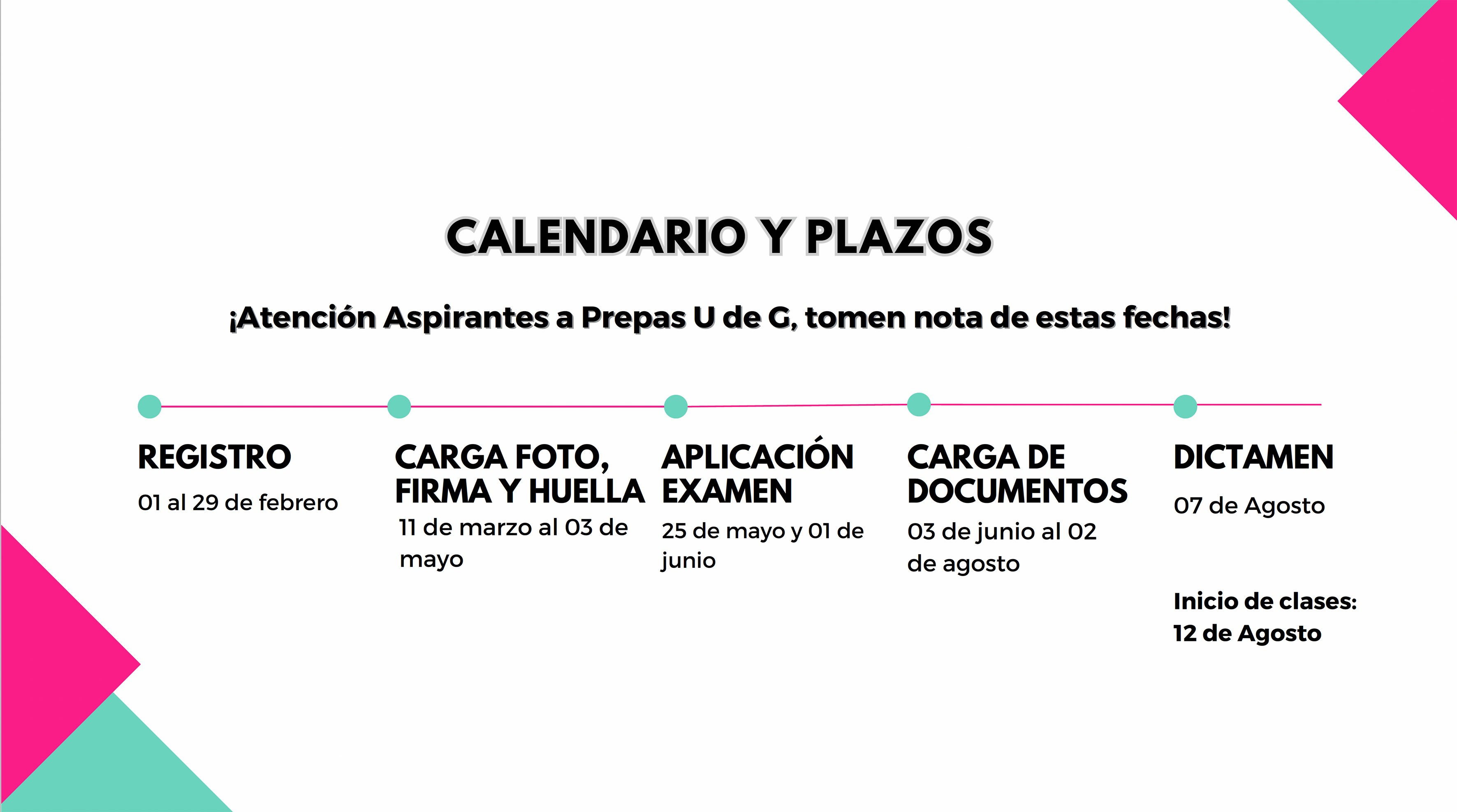 En cuanto a calendarios y plazos, Gómez Guerrero dijo que luego del registro se abre un periodo del 11 de marzo al 3 de mayo para cargar fotografía, firma y huella; el examen de admisión será los días 25 de mayo y 1 de junio; la carga de documentos del 3 de junio al 10 de agosto; la publicación del dictamen el 7 de agosto y el inicio de clases el 12 de agosto.