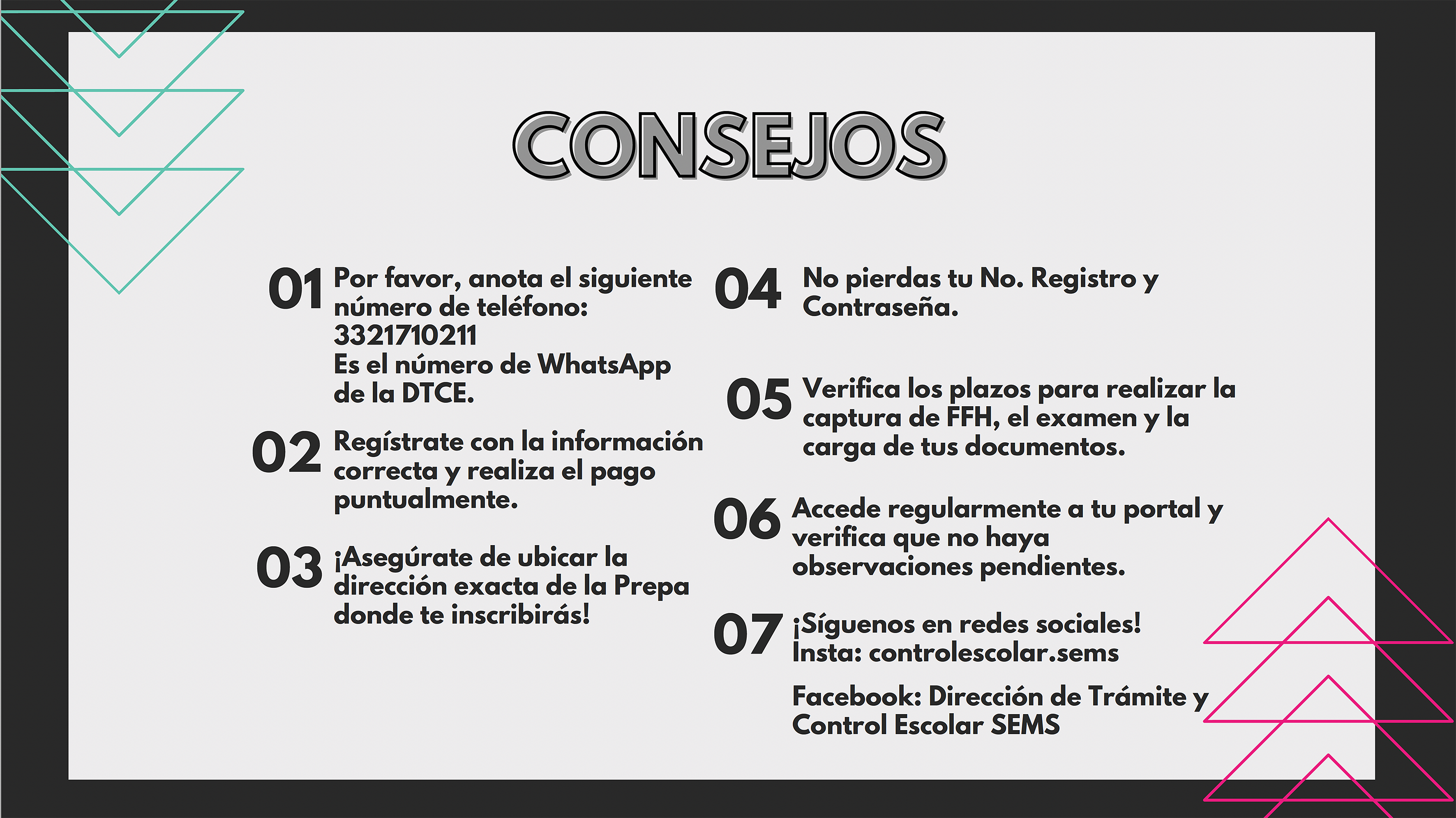 “Tenemos el número de whatsApp de atención, 33-2171-0211. Las recomendaciones son: regístrate con la información correcta y realiza el pago puntualmente. Asegúrate de ubicar la dirección exacta de la preparatoria donde te inscribirás, no pierdas tu número de registro y contraseña. Accede regularmente a tu portal y verifica que no haya observaciones pendientes”, precisó.