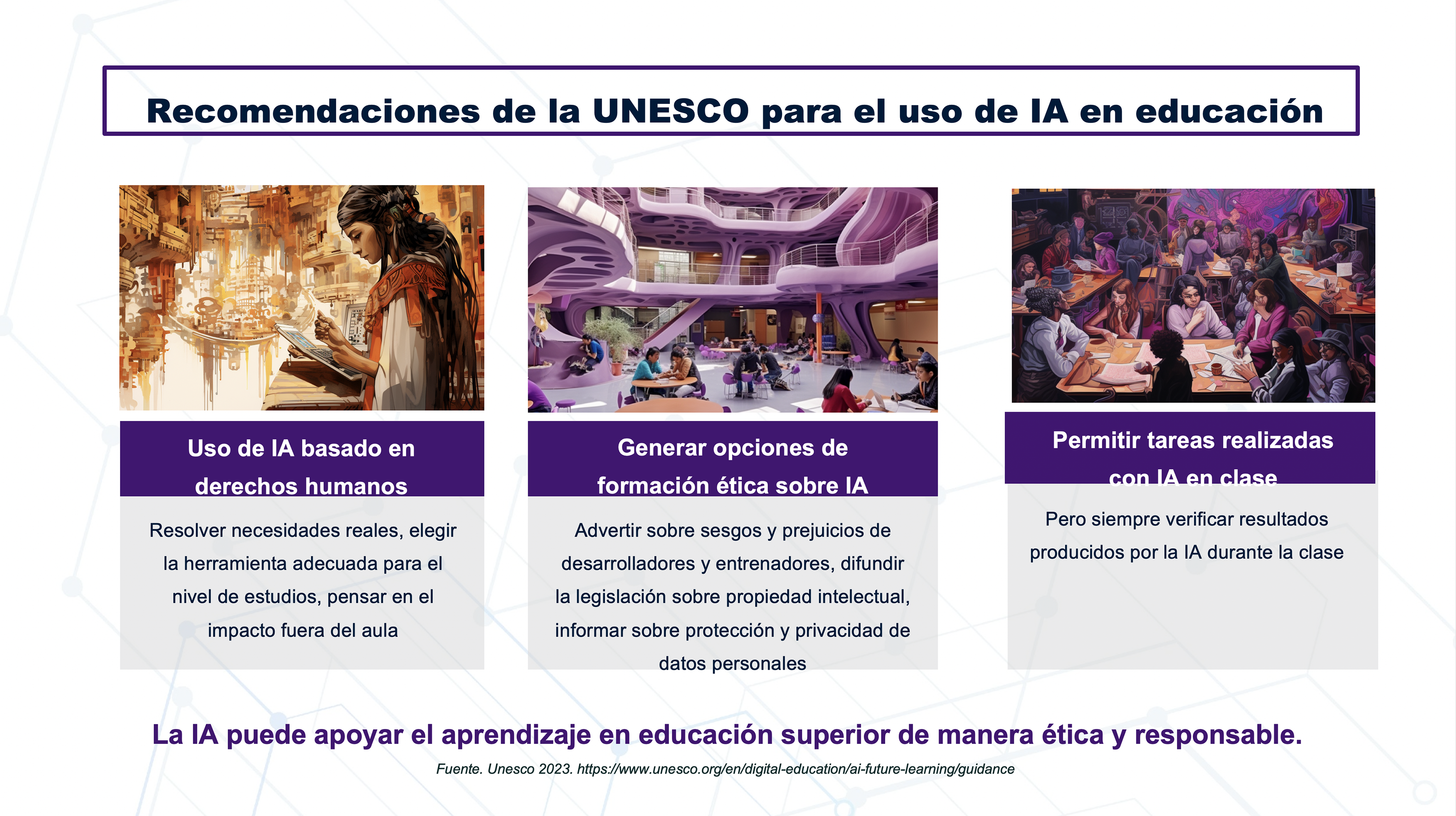 “Estamos obligados, como instituciones, a orientar, a fijar un planteamiento o una postura de abrazar la tecnología con todos los cuidados, con todos los matices éticos que se abordan en la guía, pero a no tener temor porque nuestros estudiantes ya la están utilizando”, aseveró.