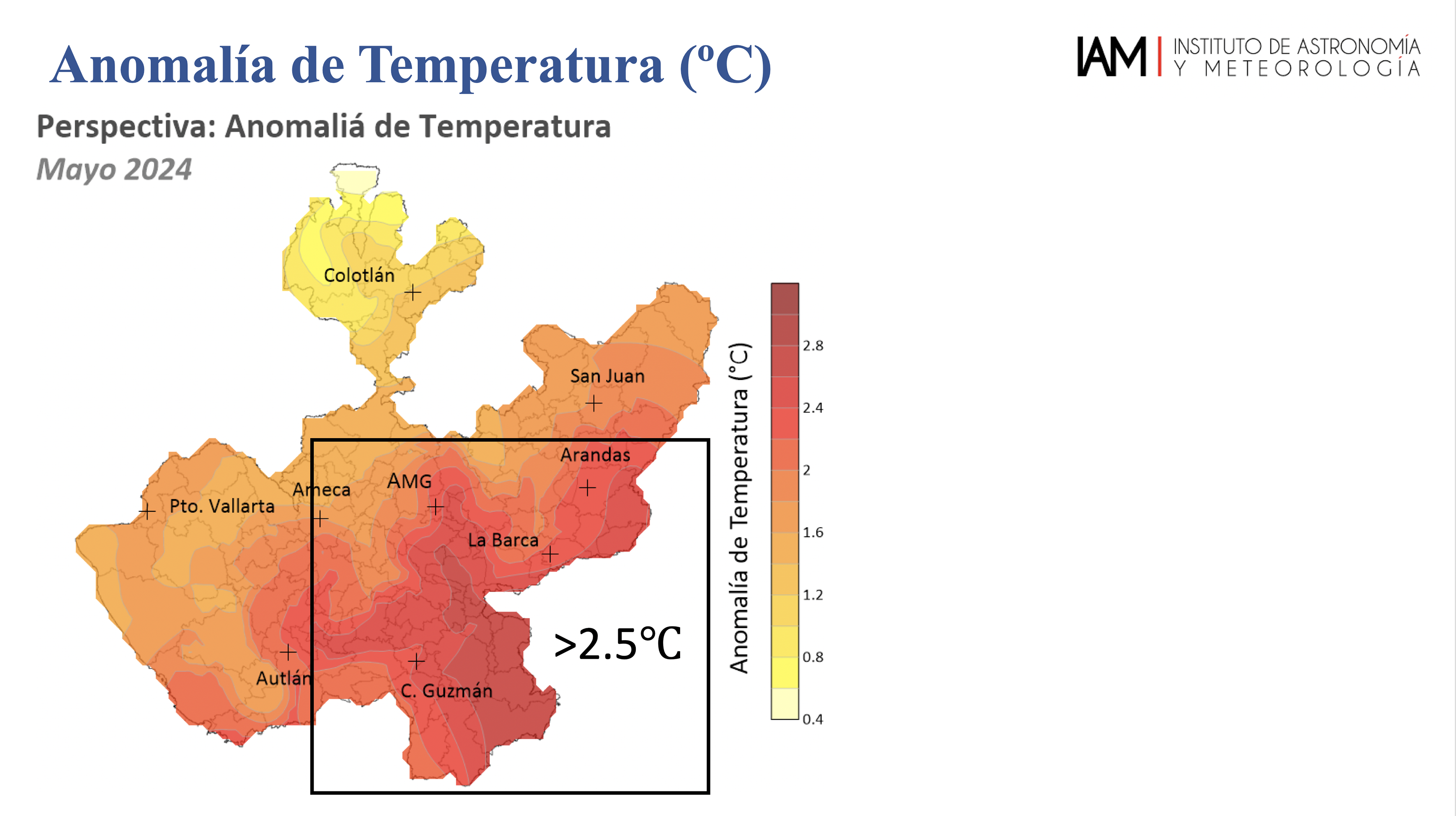 “Esperamos que las anomalías de la temperatura estén alrededor de 2 a 3 grados Celsius arriba del promedio, es decir, será un mes bastante cálido en nuestro Estado, y particularmente en las regiones Sur, Ciénega y en algunos puntos del Centro”, detalló el maestro Mauricio López Reyes, meteorólogo operativo del IAM.