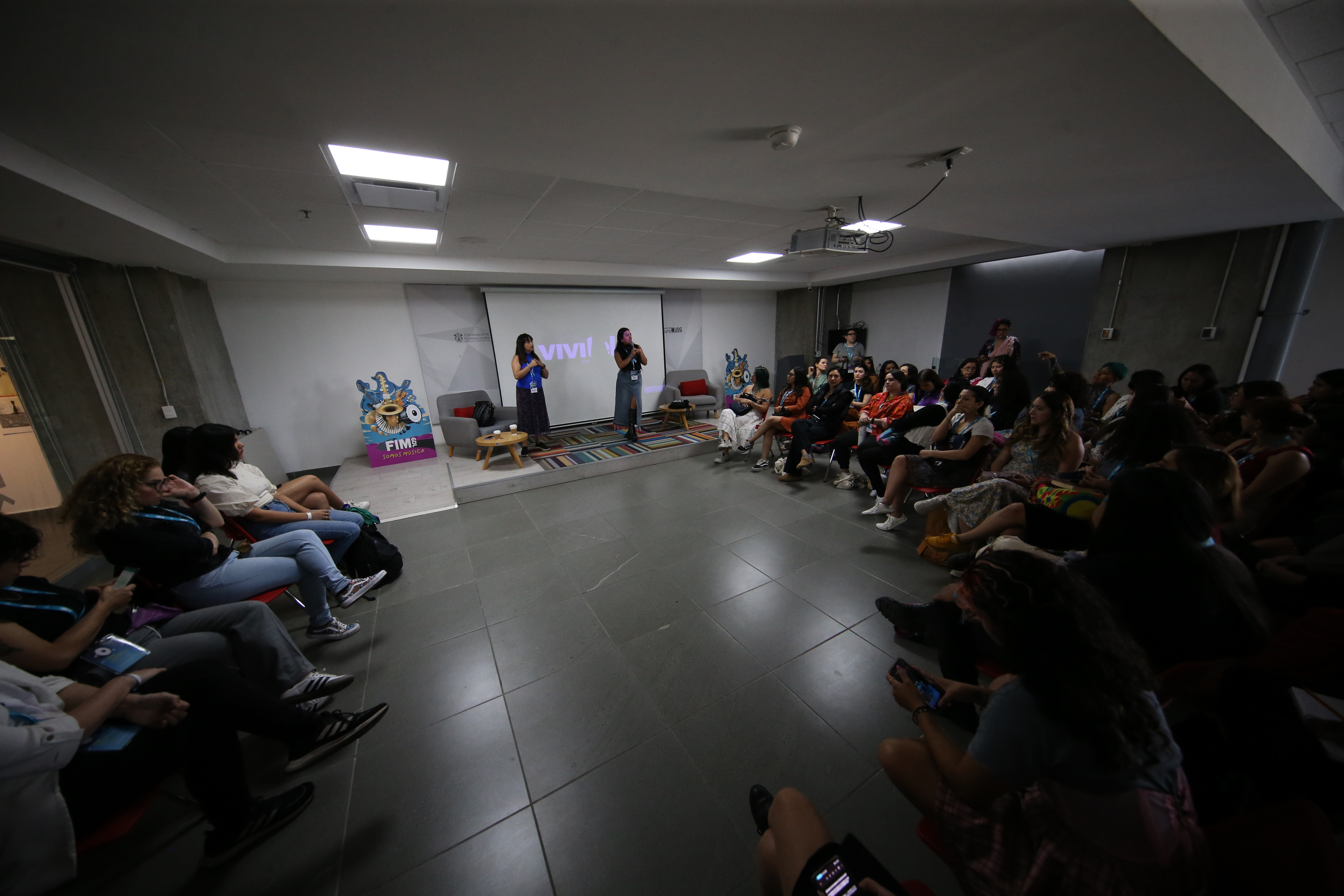 El salón de la planta alta de la librería Carlos Fuentes recibió a más de 60 mujeres para hablar con Marcela Herrera y Sonia Avilés, cofundadoras del Encuentro Iberoamericano de Mujeres en la Industria Musical (EIMIM), como parte de las actividades de la Feria de la Música (FIM GDL 2024).