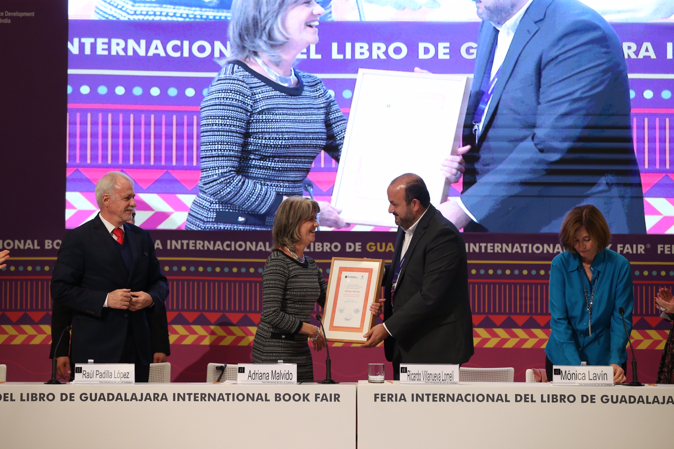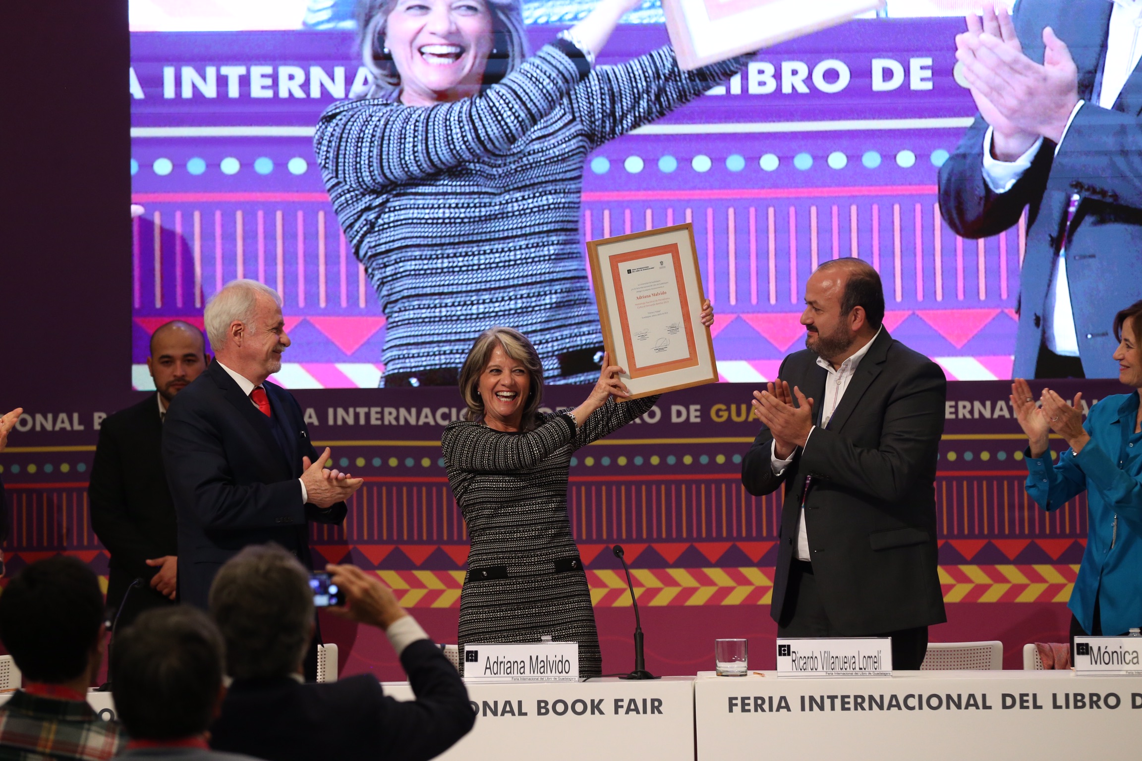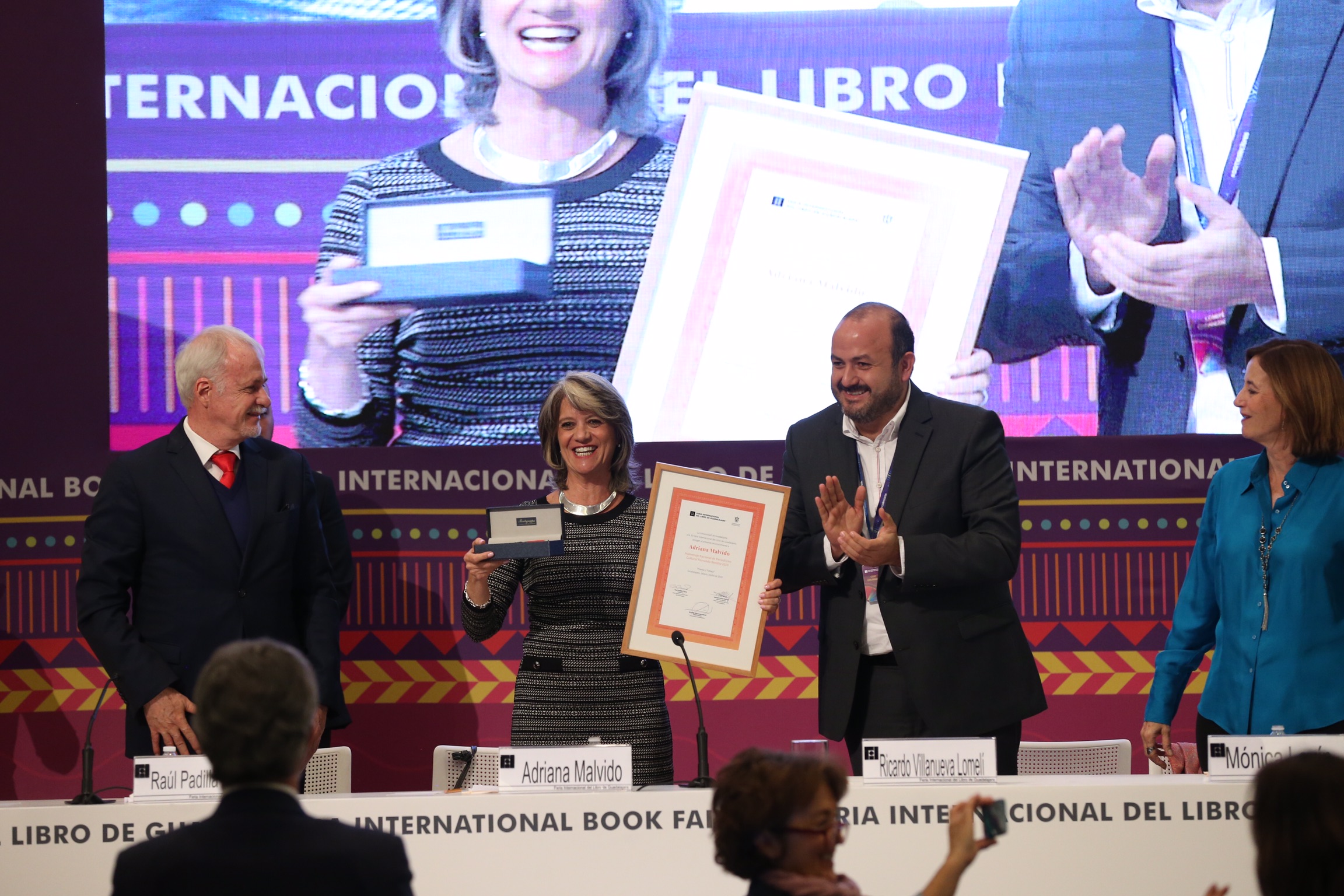 La escritora y periodista cultural mexicana Adriana Malvido recibió este domingo el Homenaje Nacional de Periodismo Cultural Fernando Benítez, que entrega la Feria Internacional del Libro de Guadalajara (FIL).