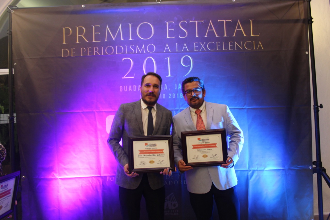 El maestro Julio Alejandro Ríos Gutiérrez y el estudiante Rubén Islas Rivera, ambos de la licenciatura en Periodismo Digital de UDGVirtual, recibieron este 7 de junio el Premio Estatal de Periodismo de Excelencia en Periodismo 2019, que entrega el Foro Nacional de Periodistas y Comunicadores Capítulo Jalisco.