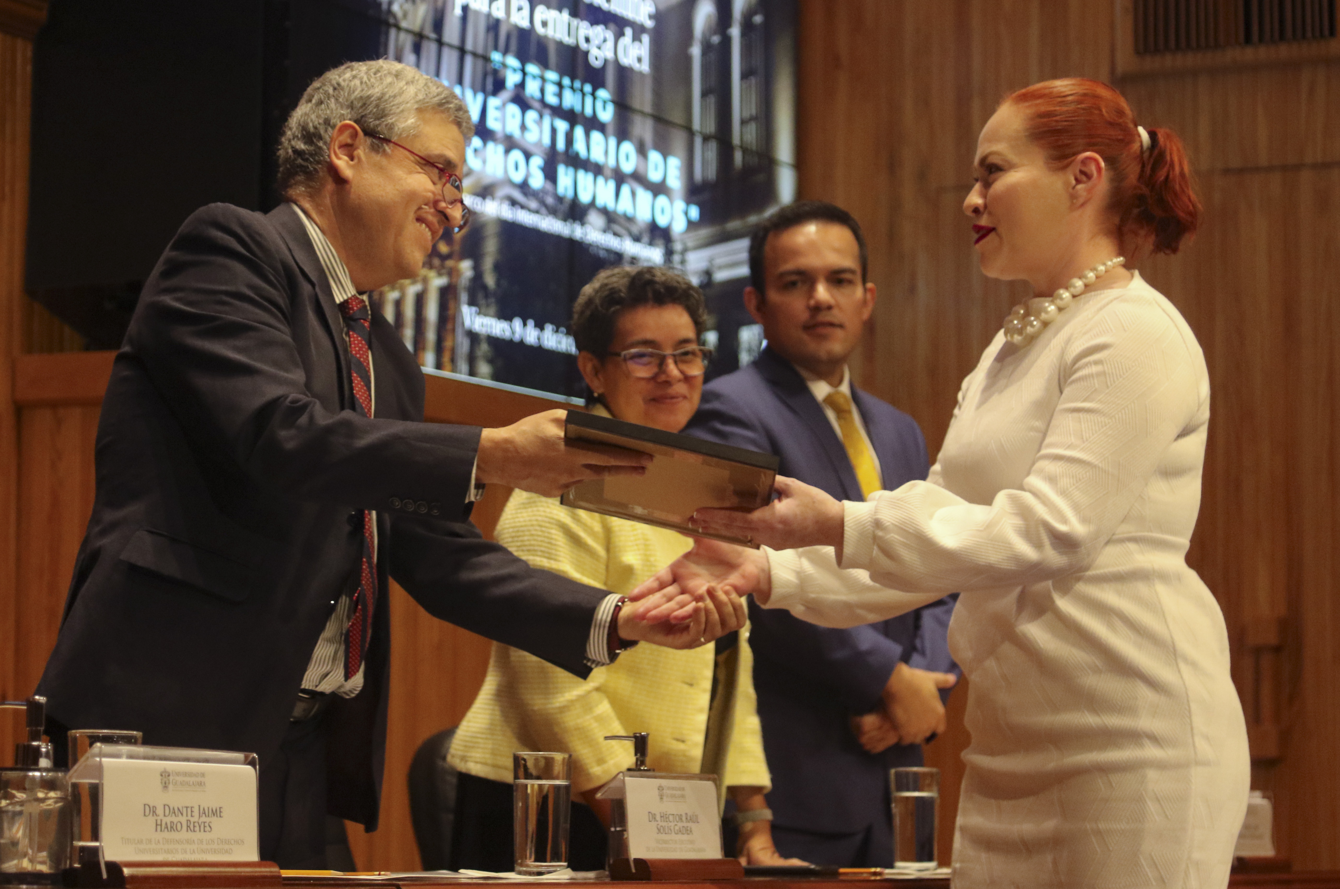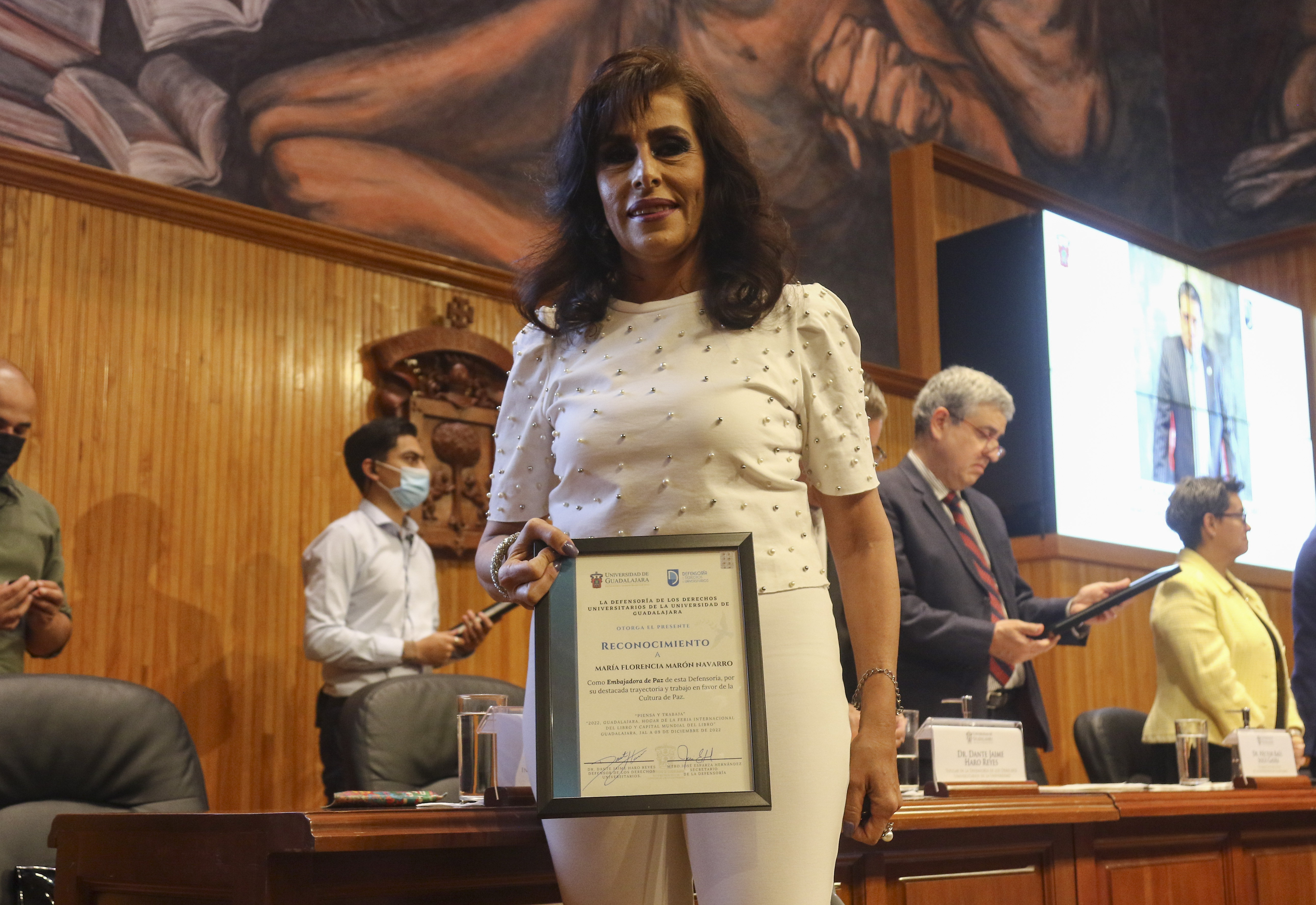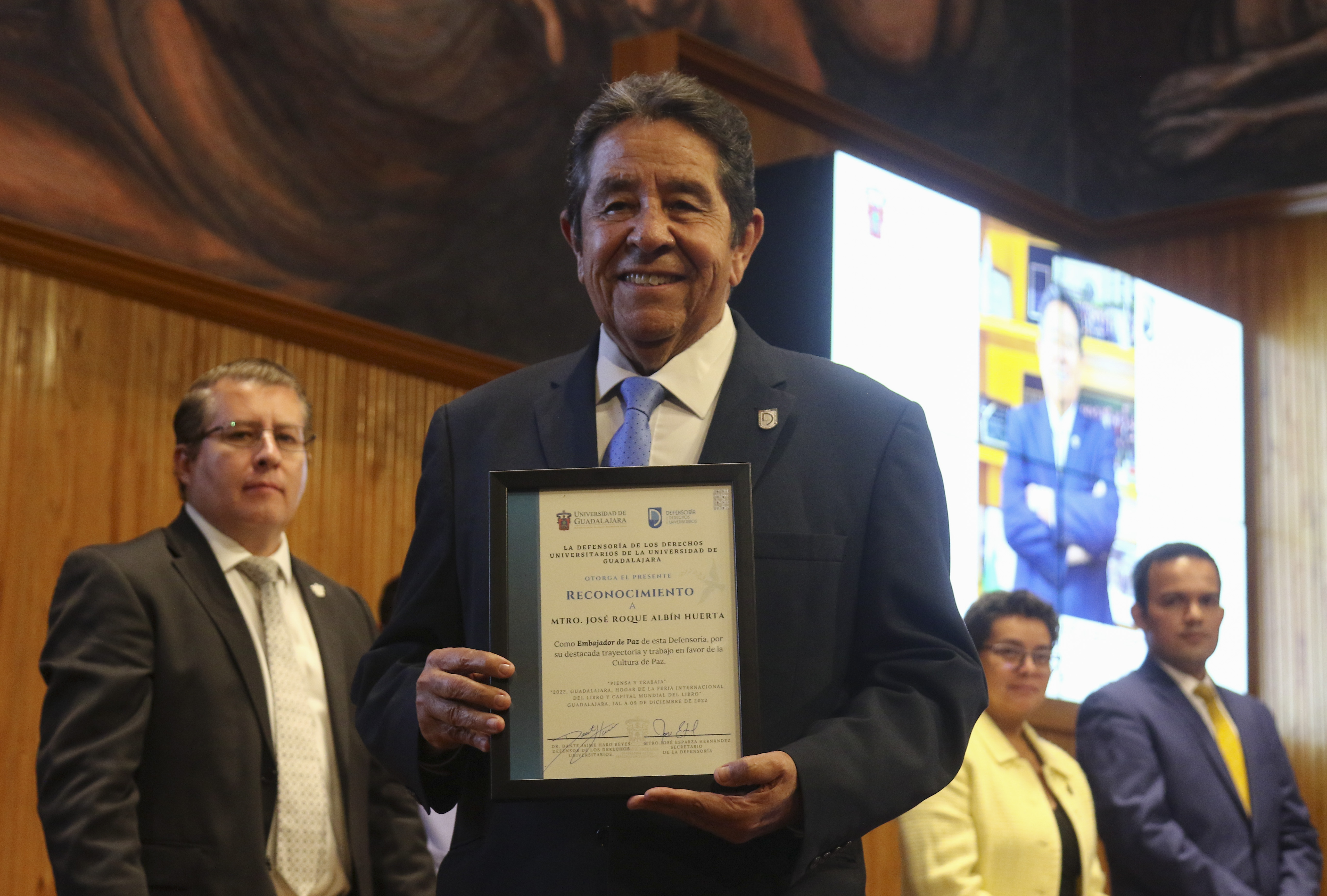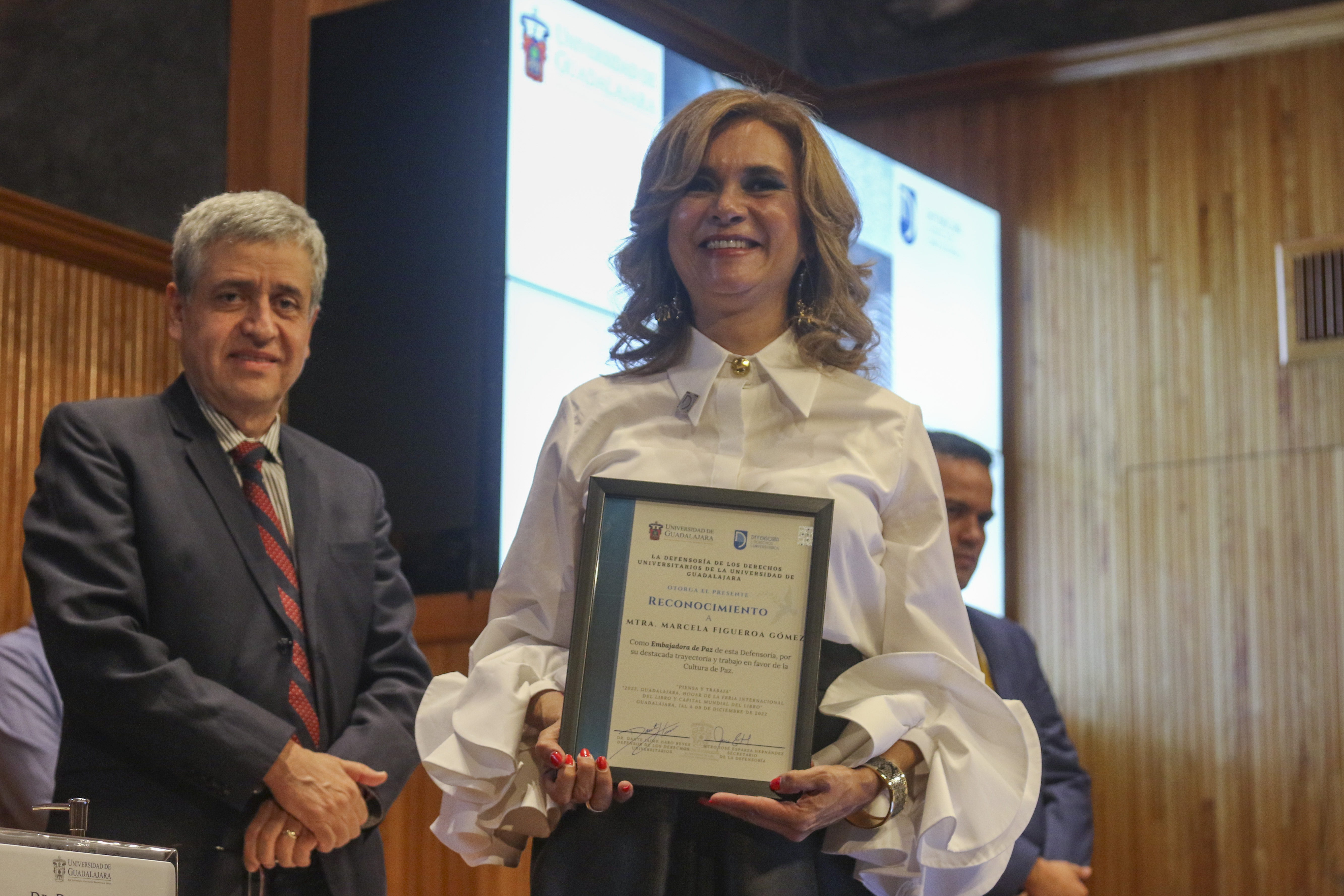 En la ceremonia, la Defensoría de los Derechos Universitarios también reconoció el trabajo de otros luchadores en derechos humanos, nombrándolos como “Embajadores de Paz”. En la lista figuran personalidades como el Maestro José Roque Albín Huerta, Rector General del Centro Universitario UTEG y María Florencia Marón Navarro, de la asociación Sonidos por la Paz.