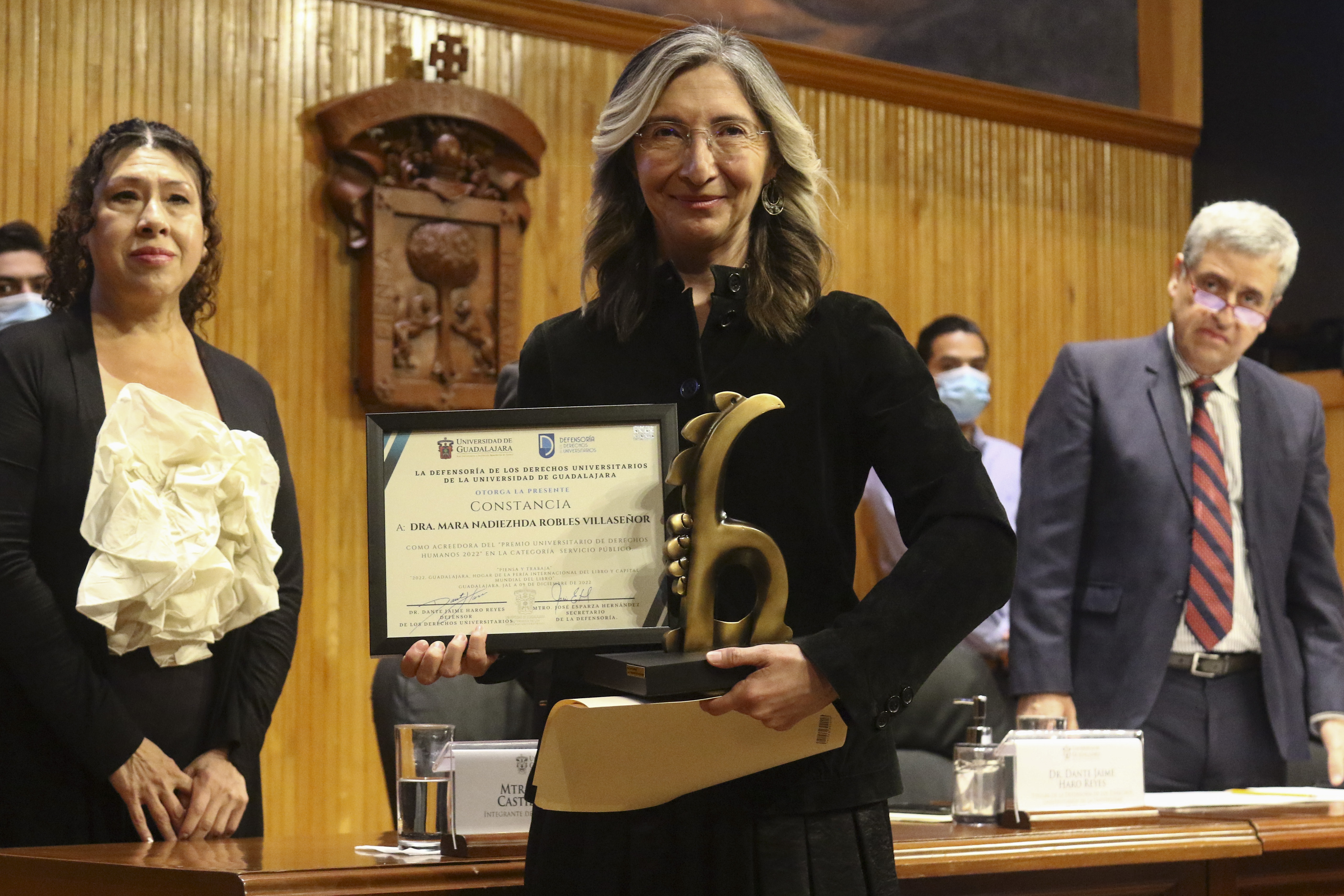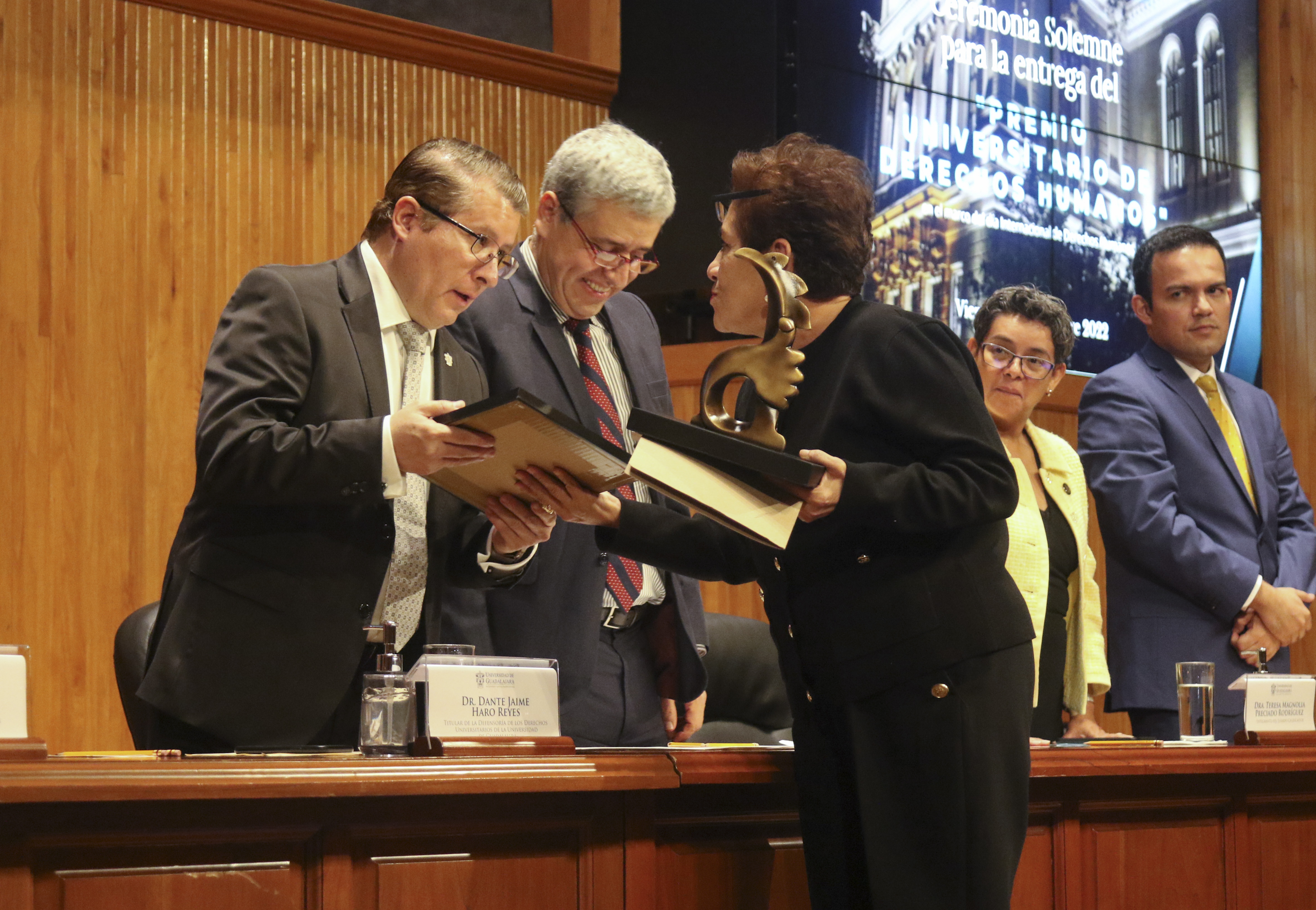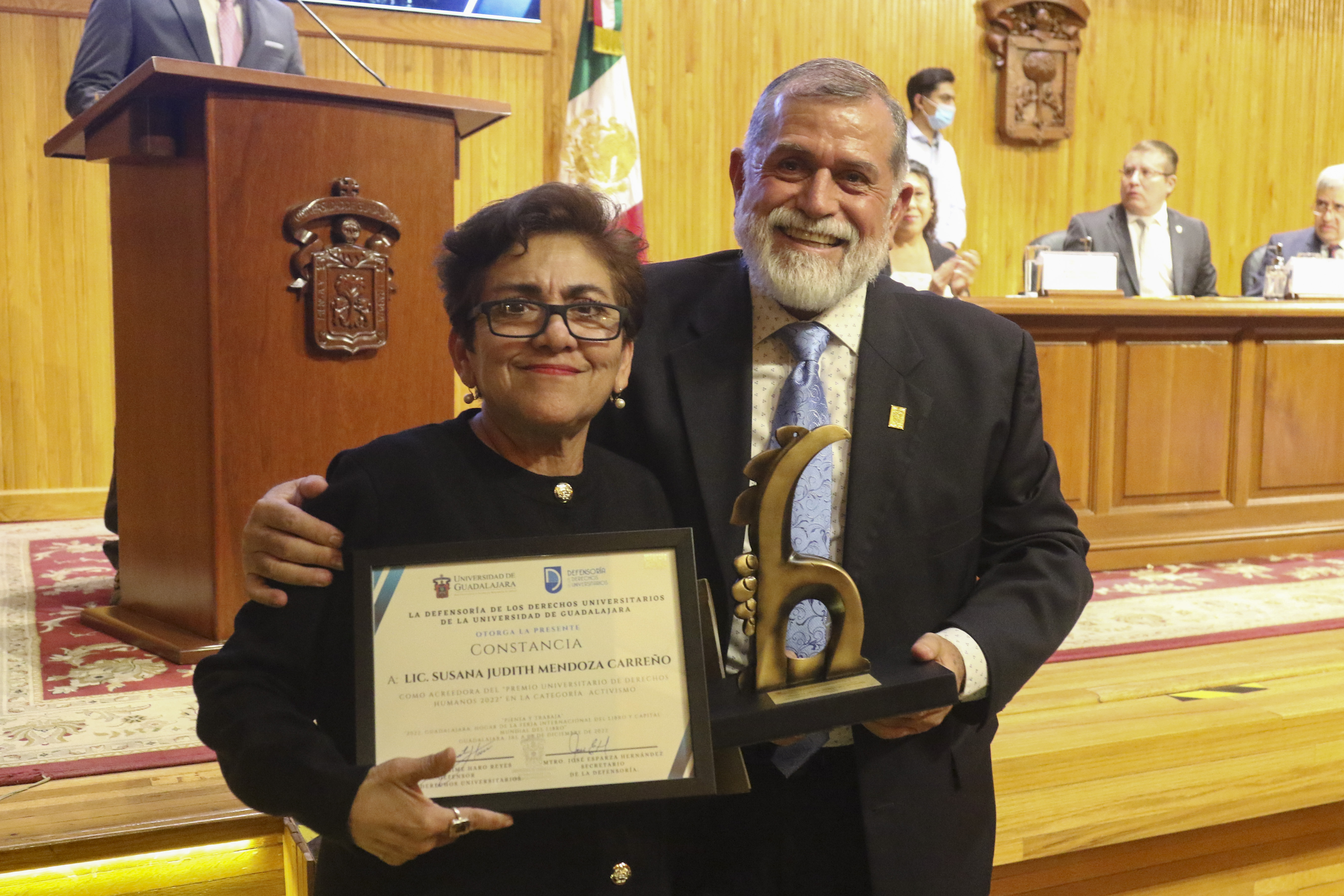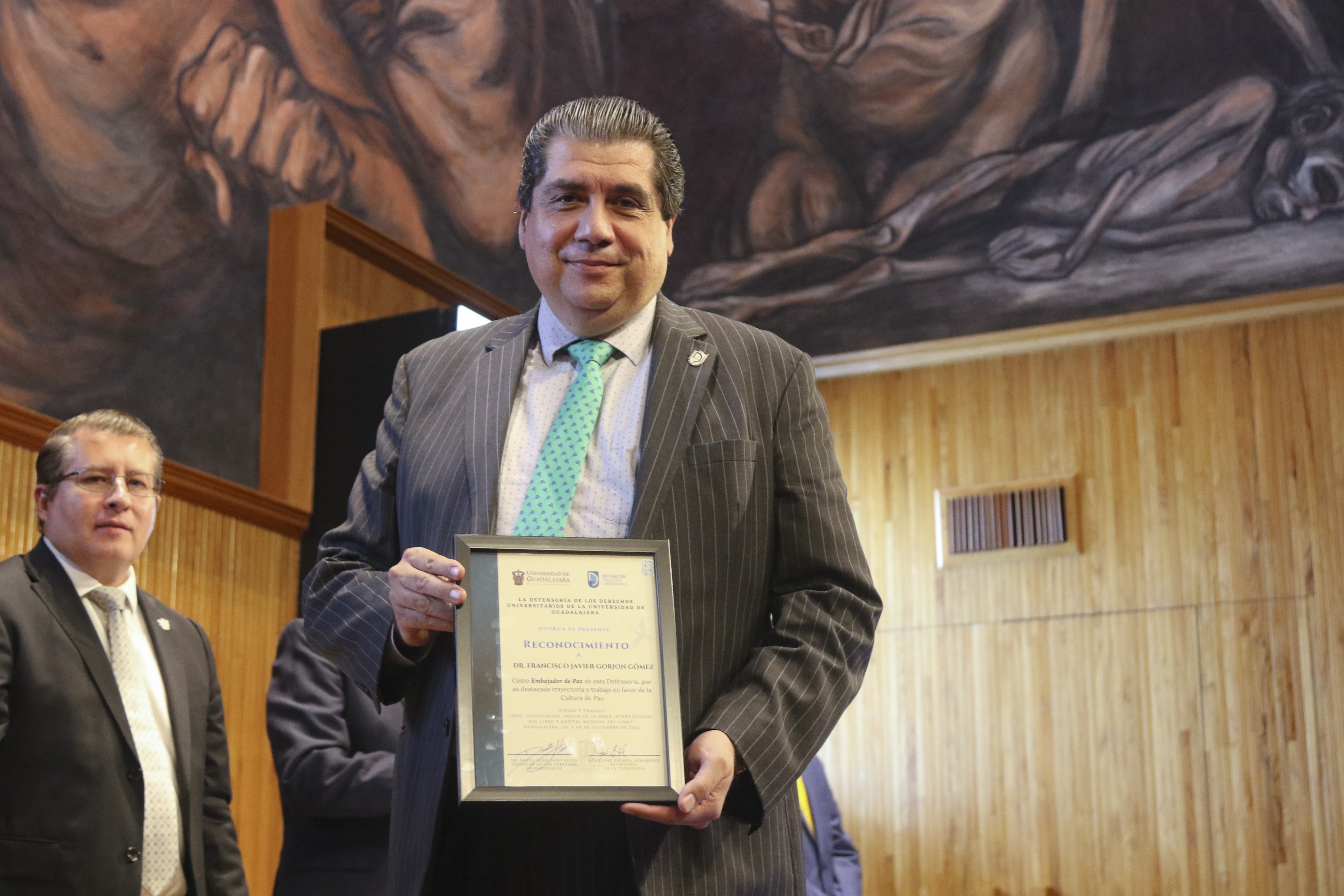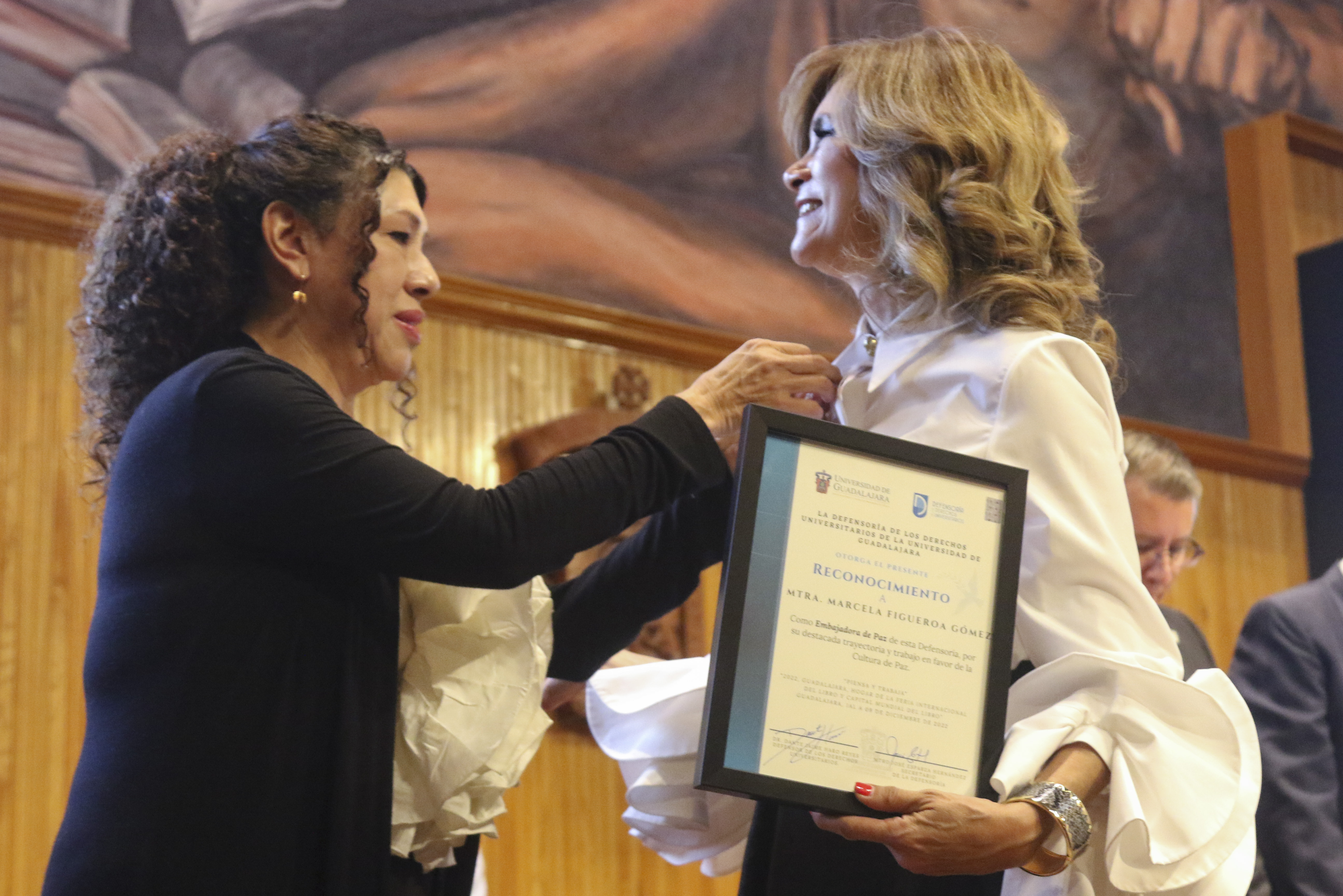 En la ceremonia, la Defensoría de los Derechos Universitarios también reconoció el trabajo de otros luchadores en derechos humanos, nombrándolos como “Embajadores de Paz”. En la lista figuran personalidades como el Maestro José Roque Albín Huerta, Rector General del Centro Universitario UTEG y María Florencia Marón Navarro, de la asociación Sonidos por la Paz.