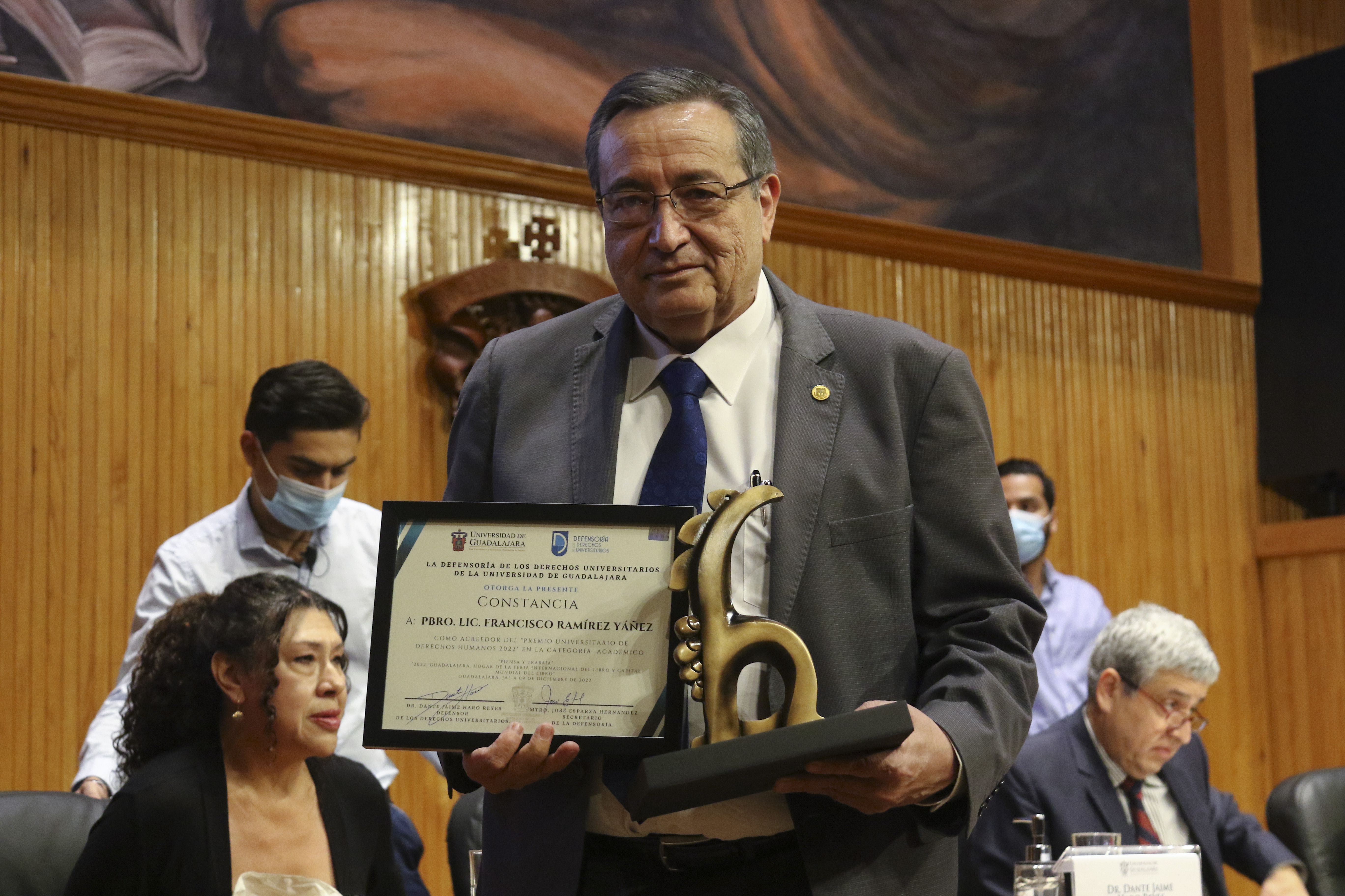 Durante la ceremonia de premiación en el Paraninfo Enrique Díaz de León, fueron galardonados el investigador Luis Efrén Ríos Vega y el Pbro. Francisco Ramírez Yáñez, Rector de la Universidad del Valle de Atemajac (UNIVA), en la categoría Académico.